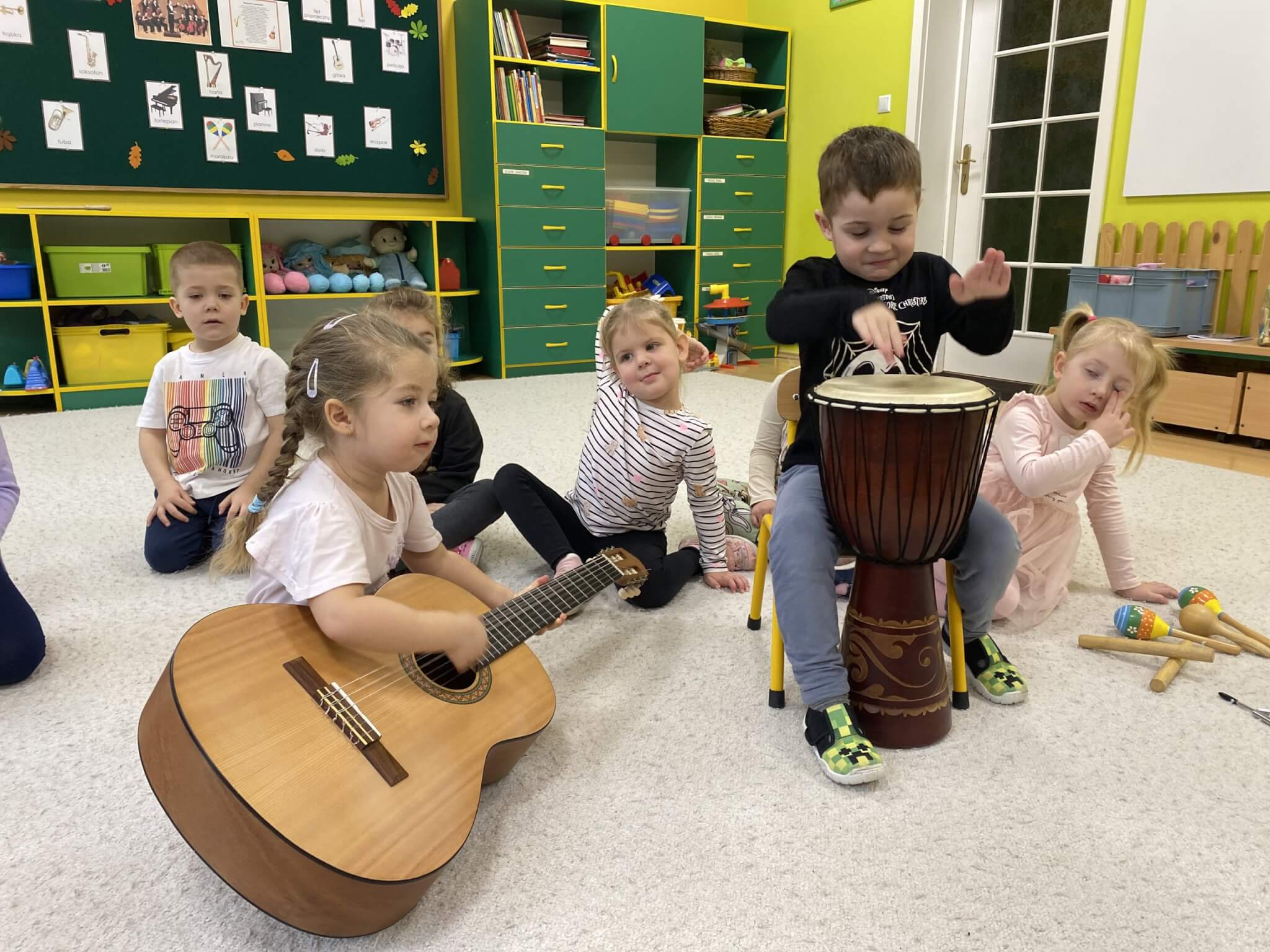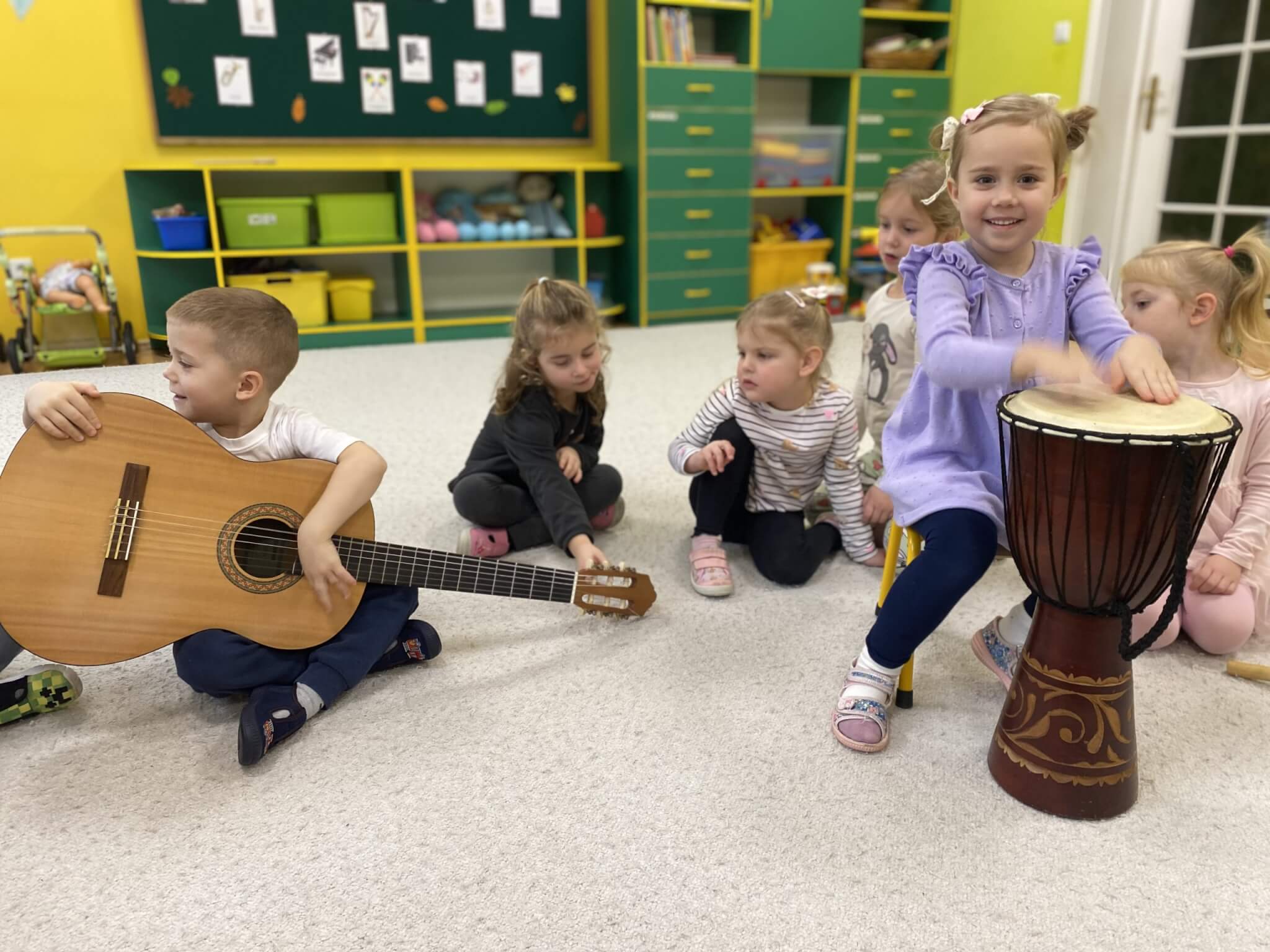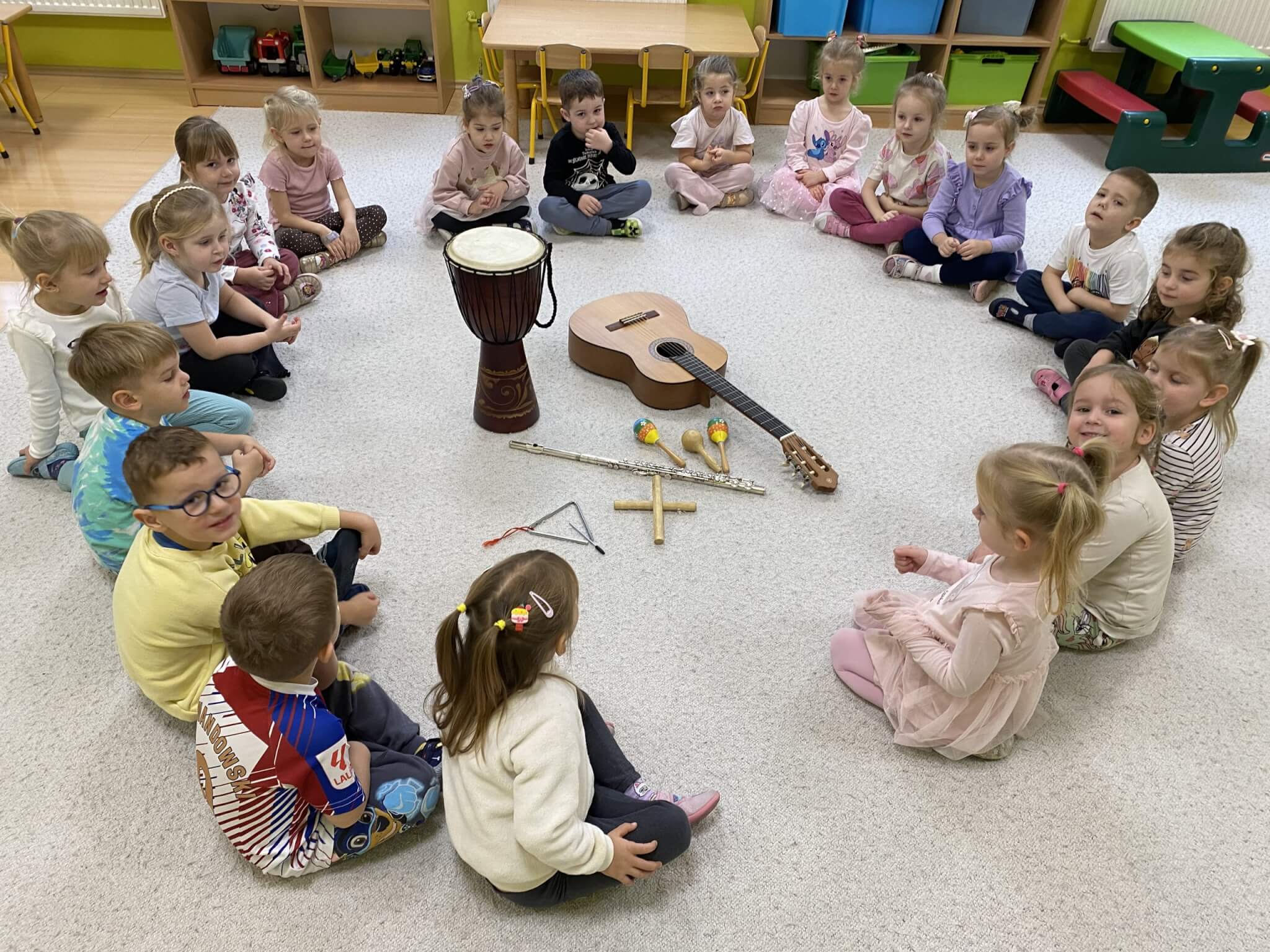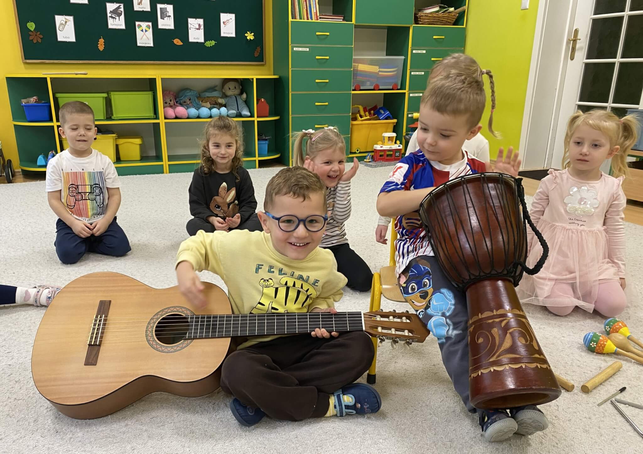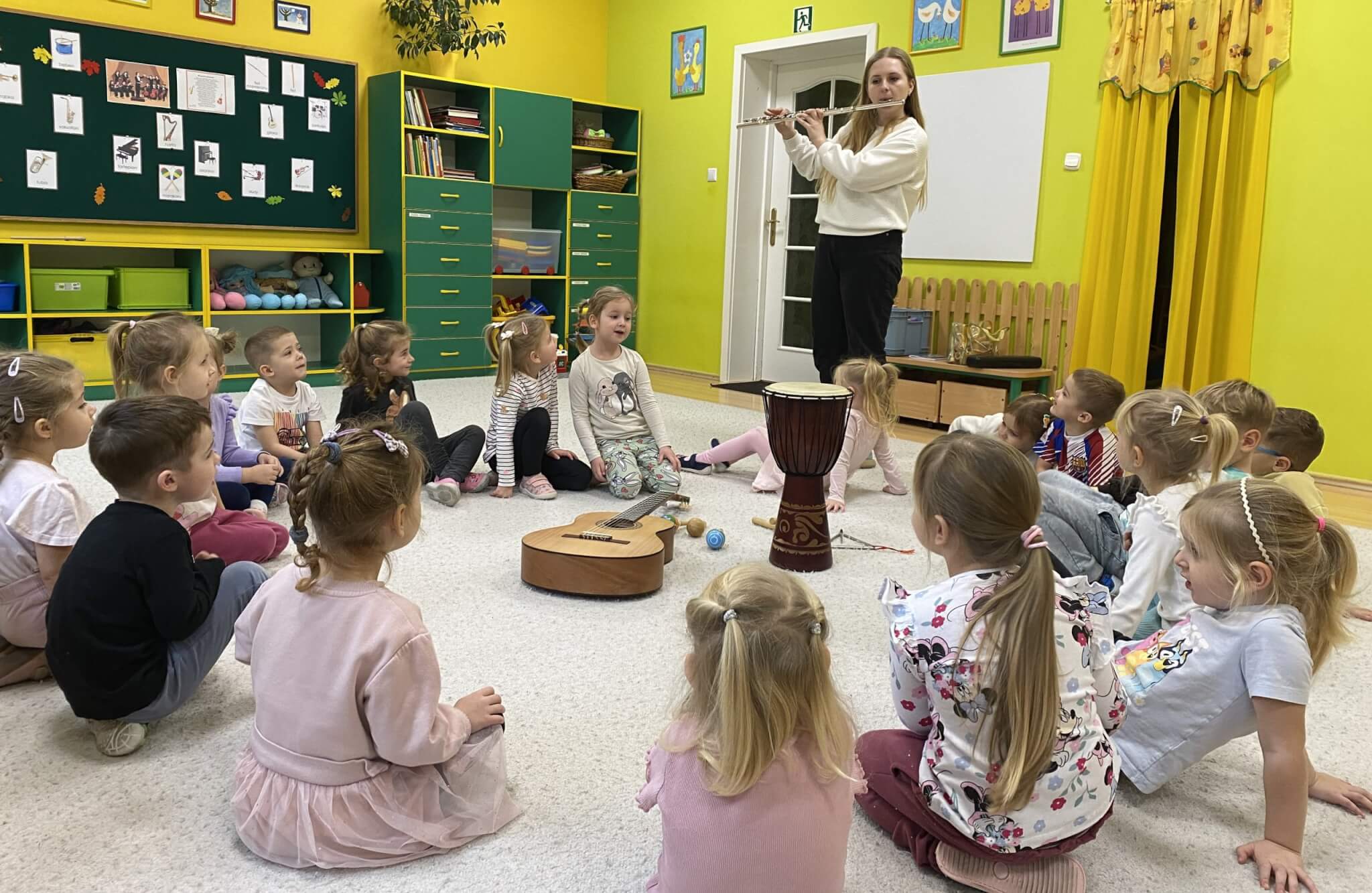 28 listopada 2025 r. W tym tygodniu dzieci z grupy II przeniosły się do świata muzyki.🎵 Poznały nazwy poszczególnych instrumentów oraz pojęcia takie jak: muzyk, dyrygent, orkiestra i rytm. Przedszkolaki miały okazję zagrać na różnych instrumentach: gitarze, bębnie zwanym djembe, marakasach, drewienkach i trójkącie, a także wykonać ćwiczenia rytmiczne z wykorzystaniem „bum bum rurek”. „Bratki” wysłuchały piosenek granych przez Panią Wiktorię na flecie poprzecznym oraz odgadywały tytuły zagranych utworów. W ramach pracy plastycznej każde dziecko wykonało swój instrument – ukulele.🎺🥁🎻