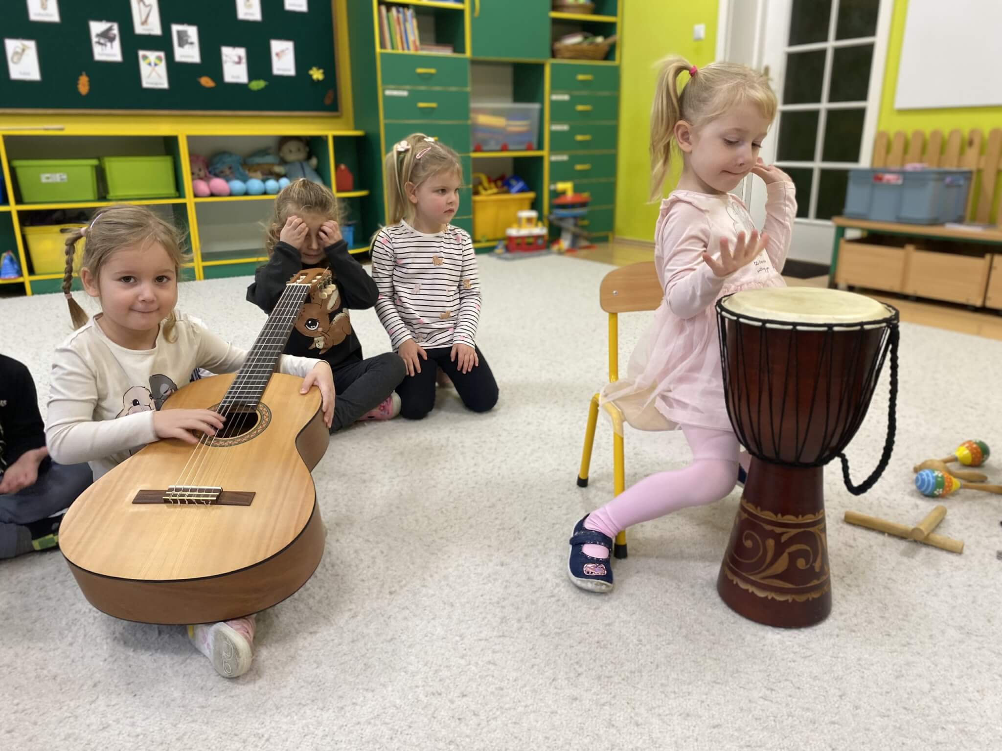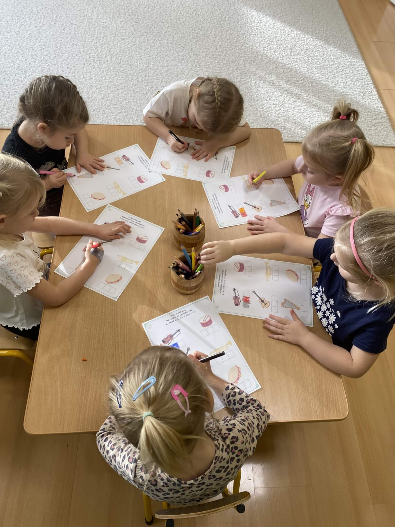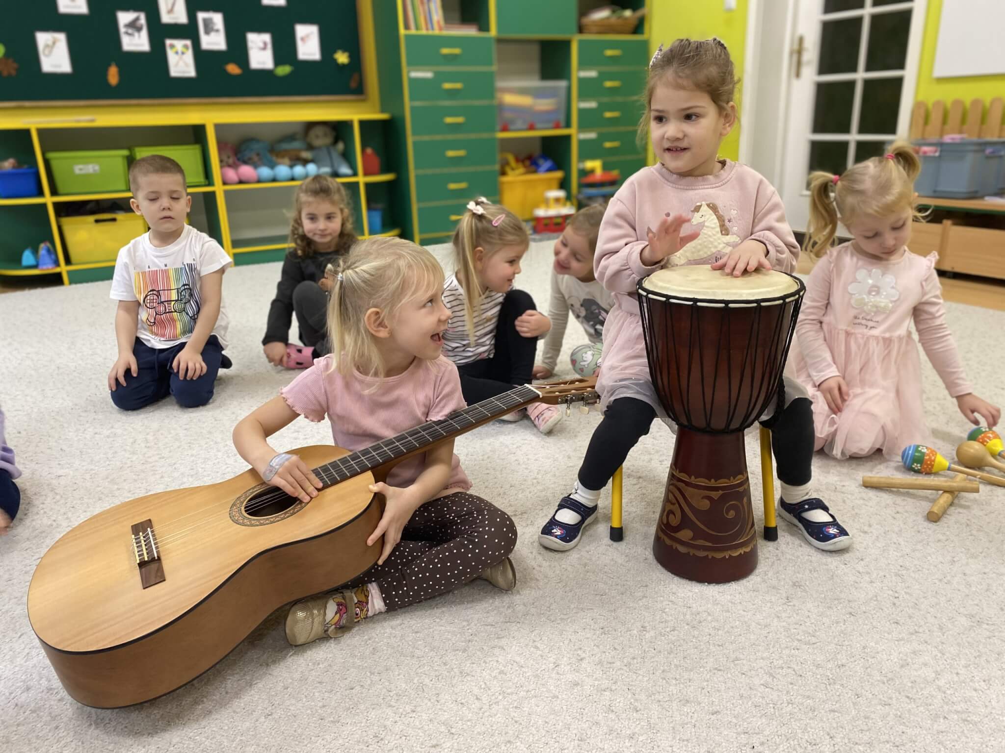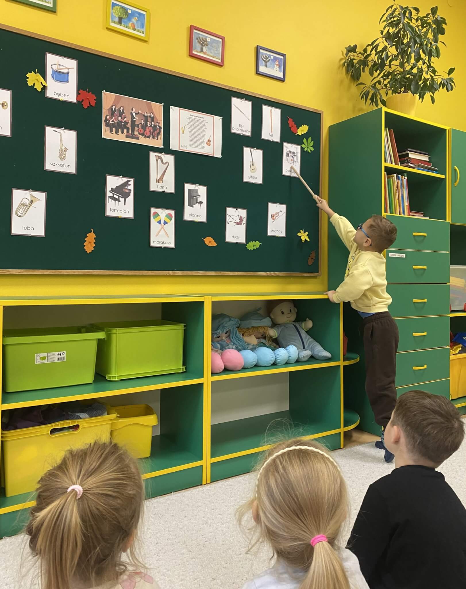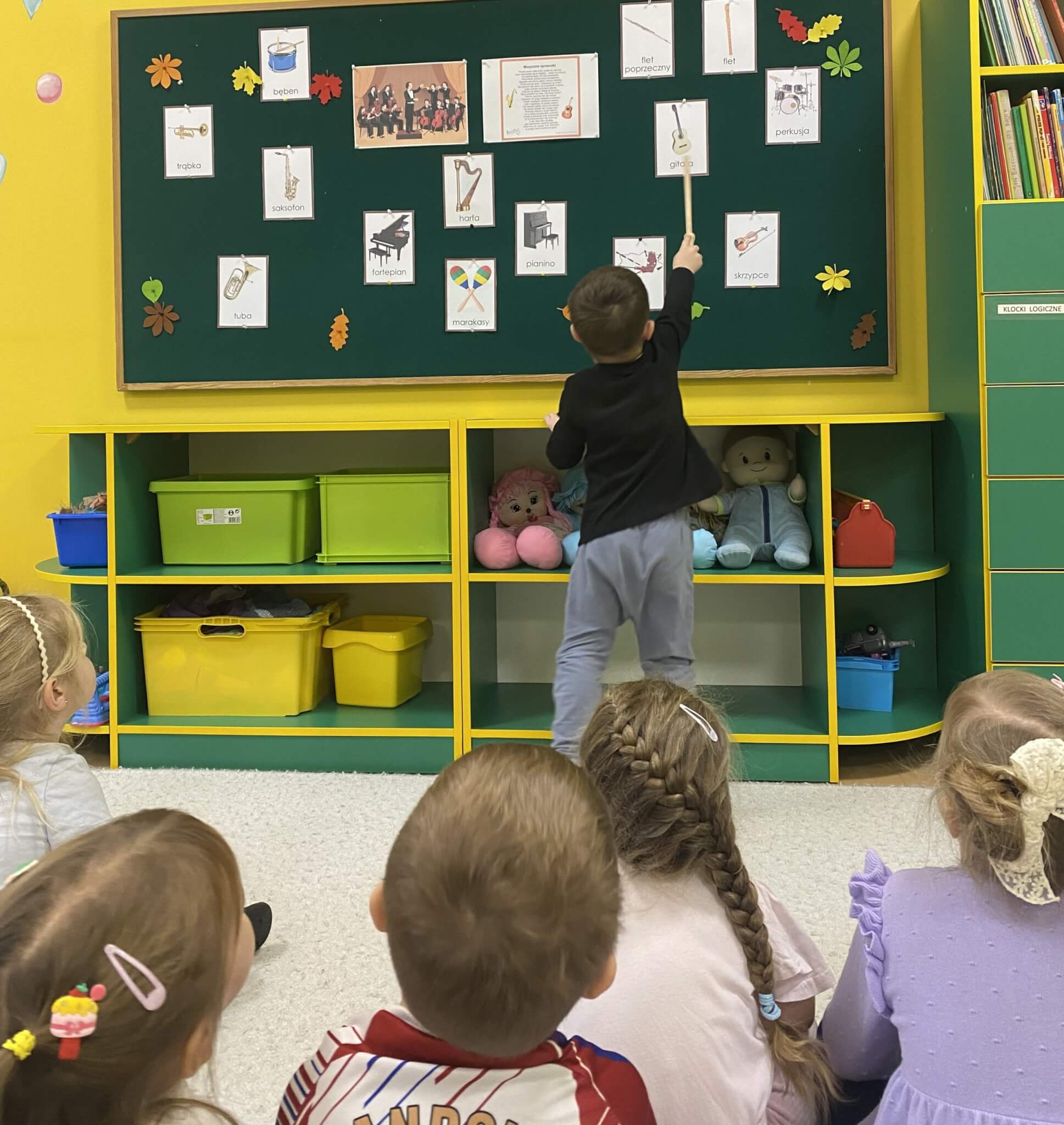 28 listopada 2025 r. W tym tygodniu dzieci z grupy II przeniosły się do świata muzyki.🎵 Poznały nazwy poszczególnych instrumentów oraz pojęcia takie jak: muzyk, dyrygent, orkiestra i rytm. Przedszkolaki miały okazję zagrać na różnych instrumentach: gitarze, bębnie zwanym djembe, marakasach, drewienkach i trójkącie, a także wykonać ćwiczenia rytmiczne z wykorzystaniem „bum bum rurek”. „Bratki” wysłuchały piosenek granych przez Panią Wiktorię na flecie poprzecznym oraz odgadywały tytuły zagranych utworów. W ramach pracy plastycznej każde dziecko wykonało swój instrument – ukulele.🎺🥁🎻