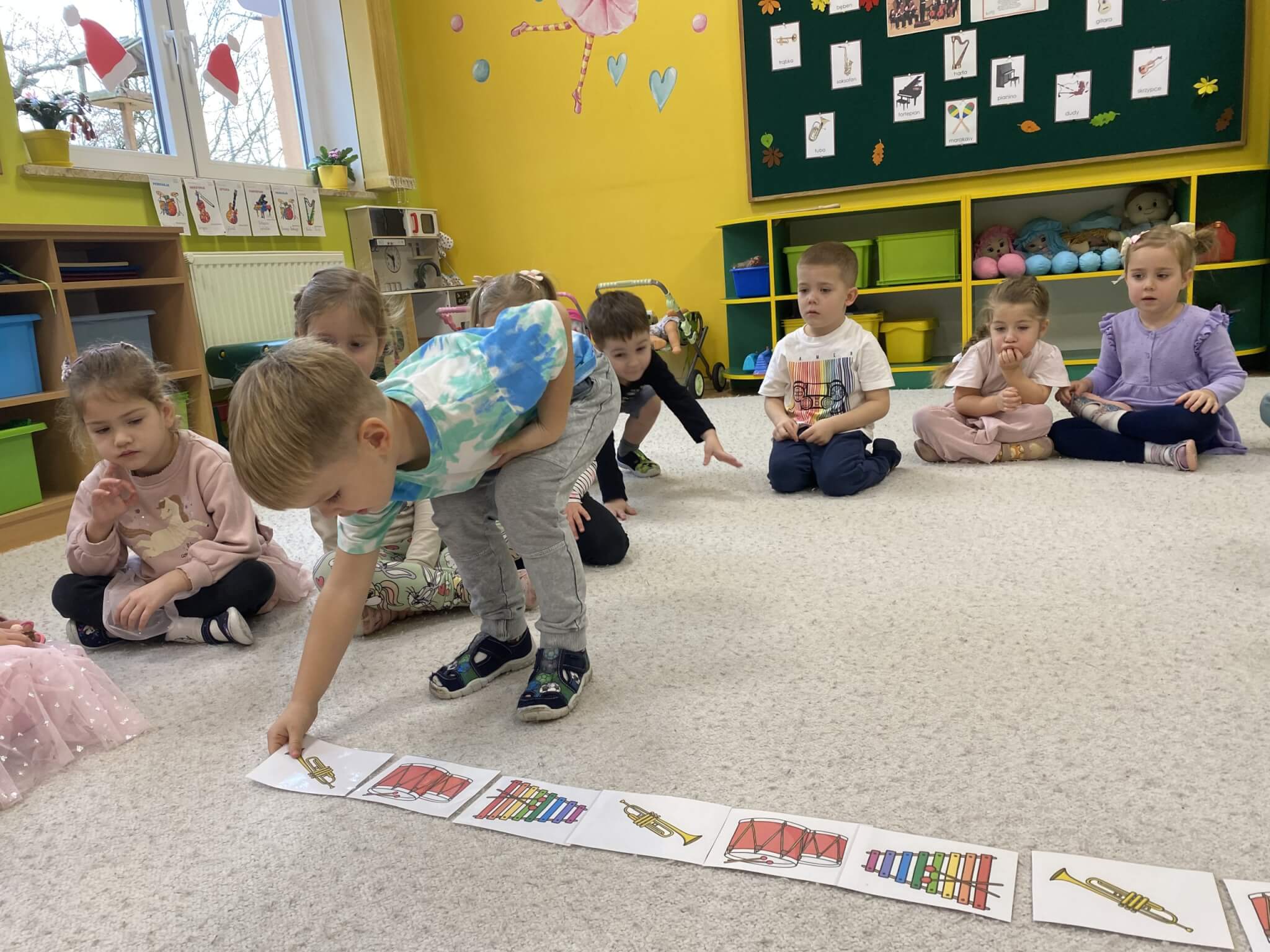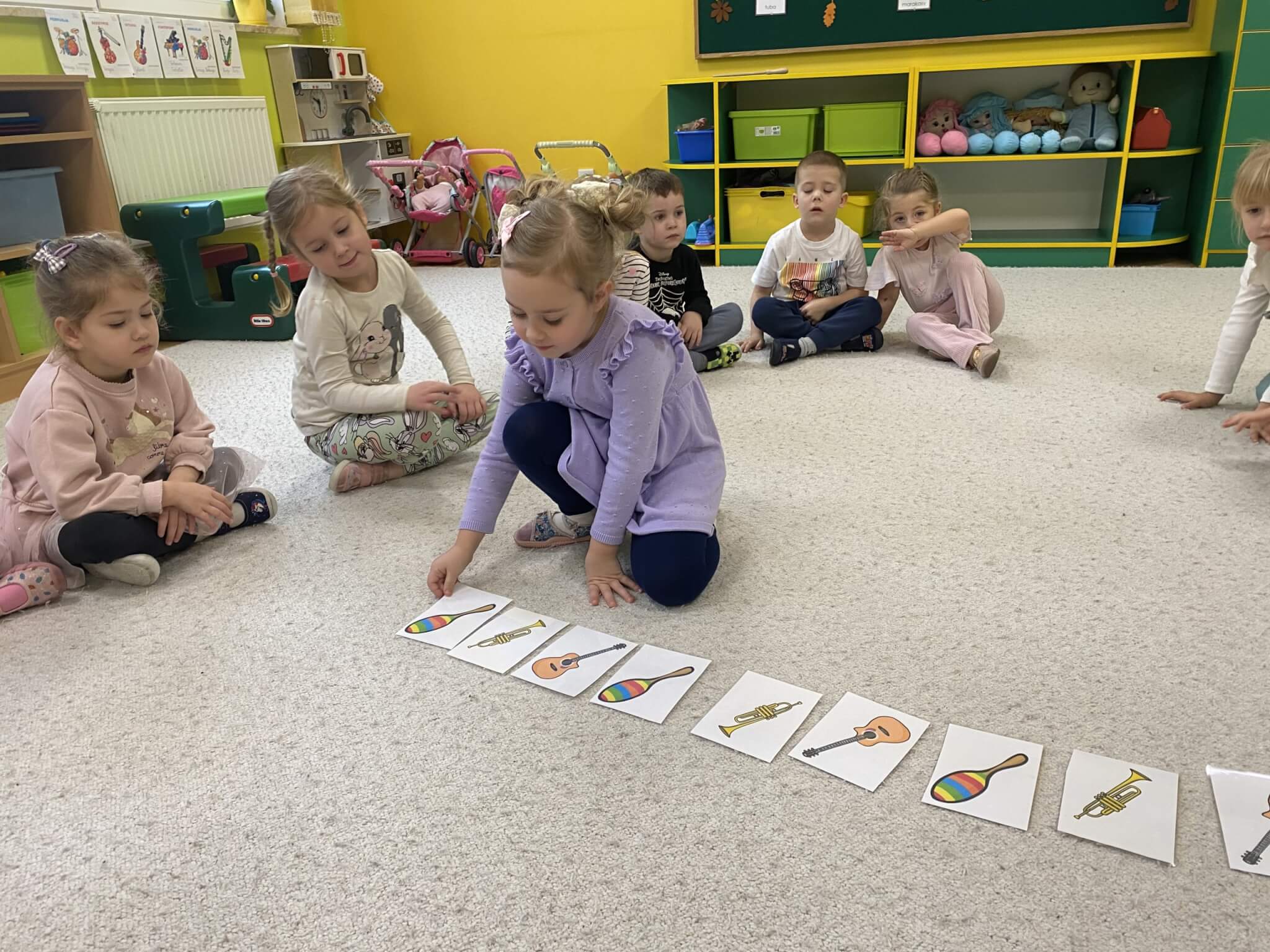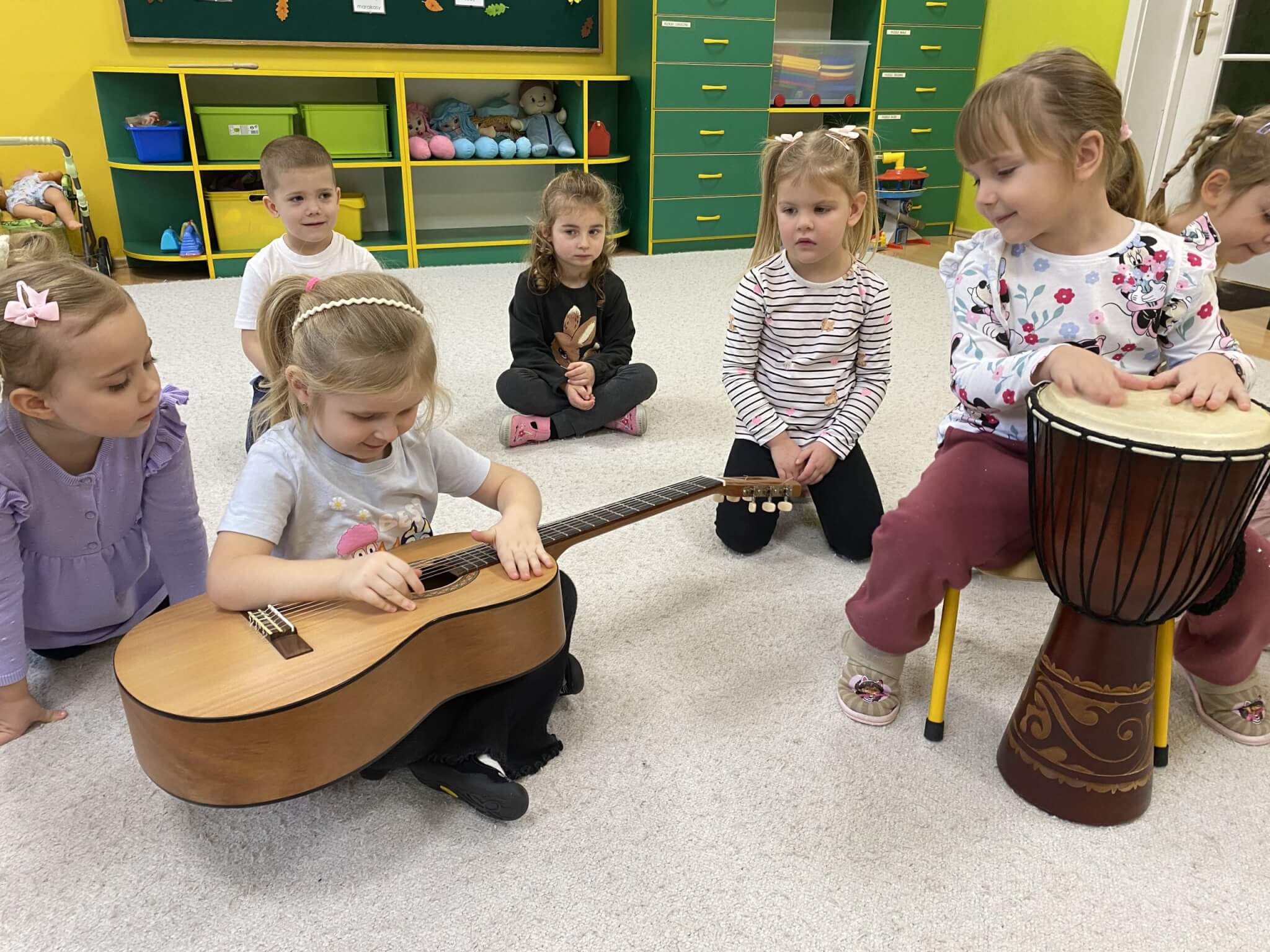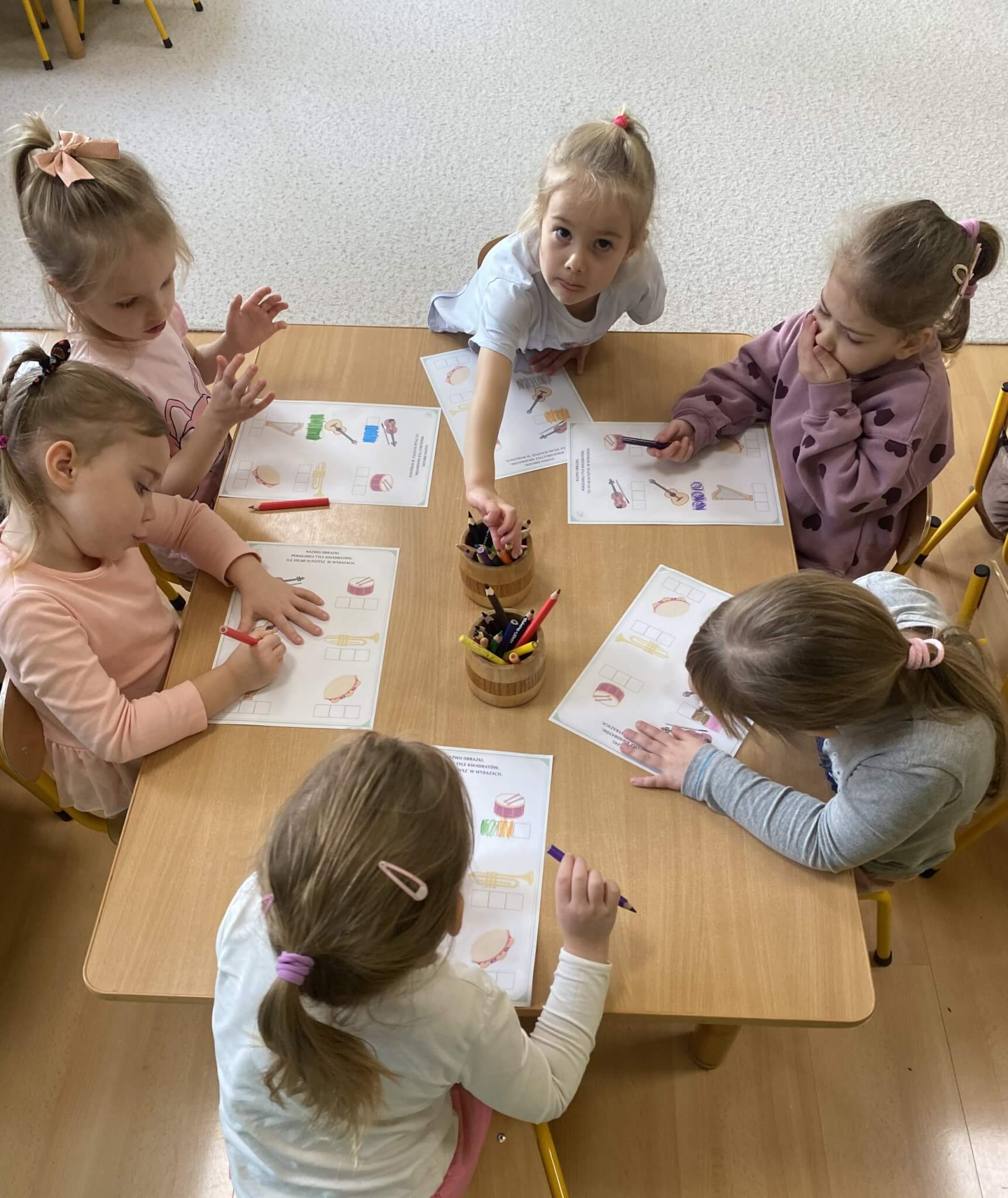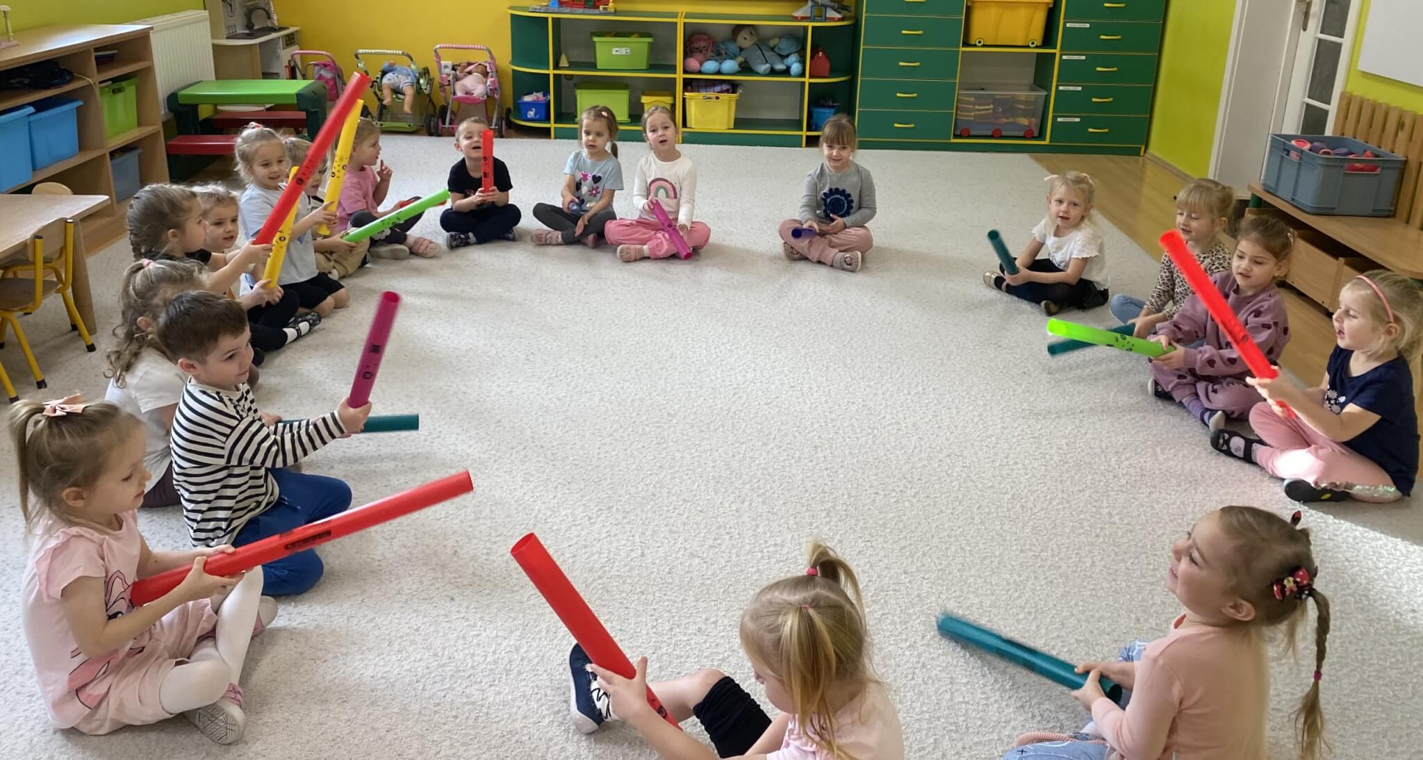 28 listopada 2025 r. W tym tygodniu dzieci z grupy II przeniosły się do świata muzyki.🎵 Poznały nazwy poszczególnych instrumentów oraz pojęcia takie jak: muzyk, dyrygent, orkiestra i rytm. Przedszkolaki miały okazję zagrać na różnych instrumentach: gitarze, bębnie zwanym djembe, marakasach, drewienkach i trójkącie, a także wykonać ćwiczenia rytmiczne z wykorzystaniem „bum bum rurek”. „Bratki” wysłuchały piosenek granych przez Panią Wiktorię na flecie poprzecznym oraz odgadywały tytuły zagranych utworów. W ramach pracy plastycznej każde dziecko wykonało swój instrument – ukulele.🎺🥁🎻