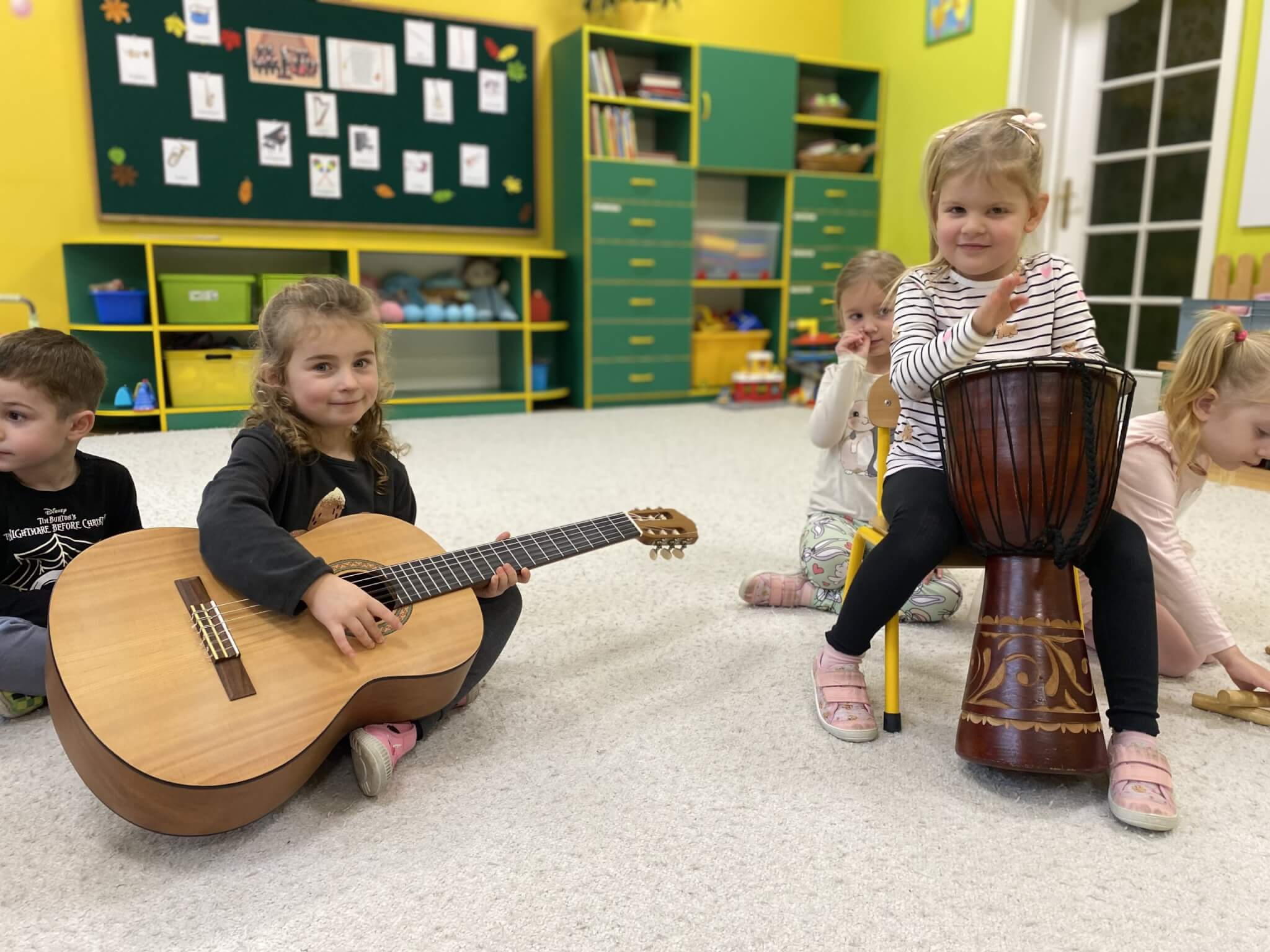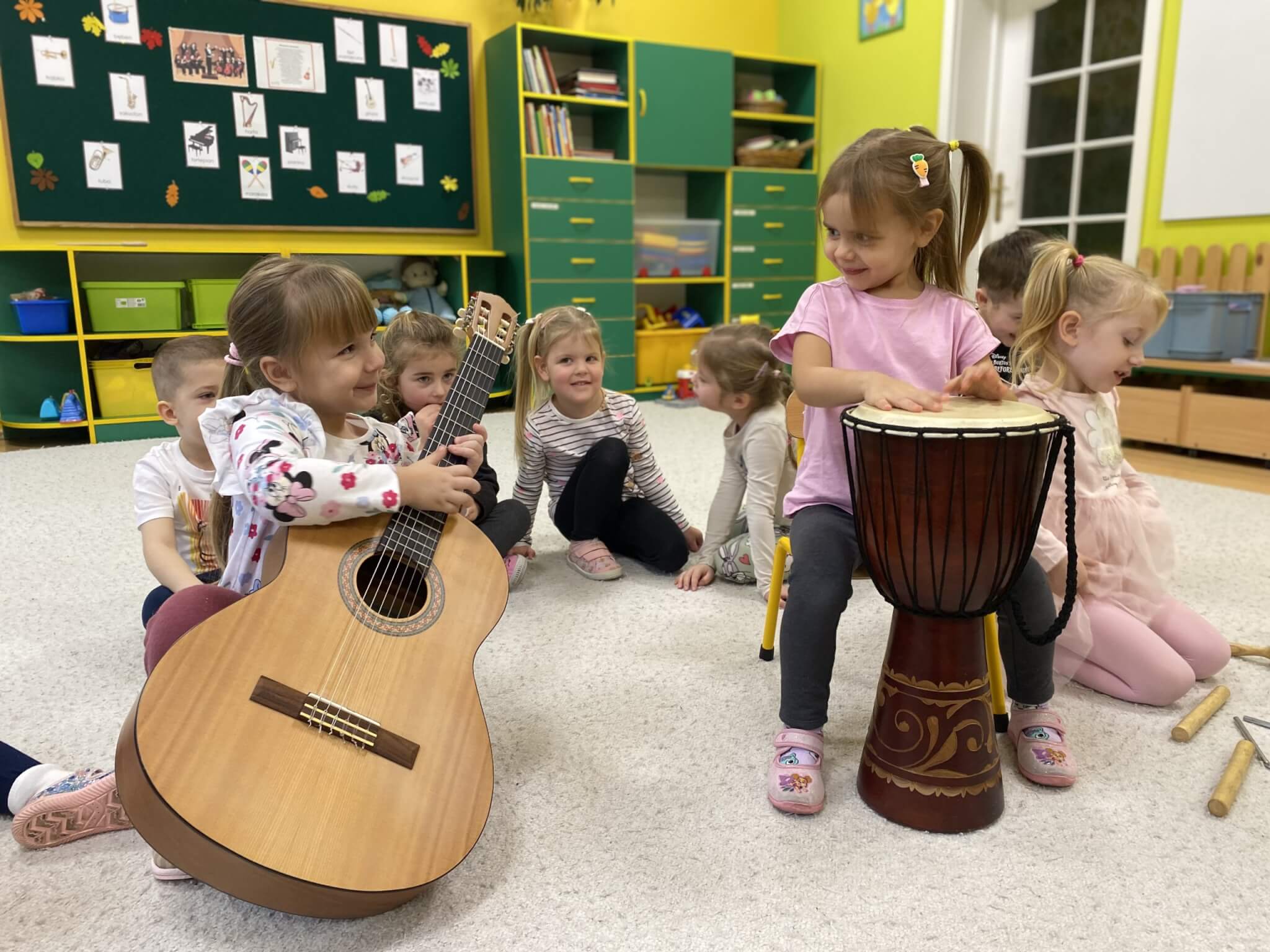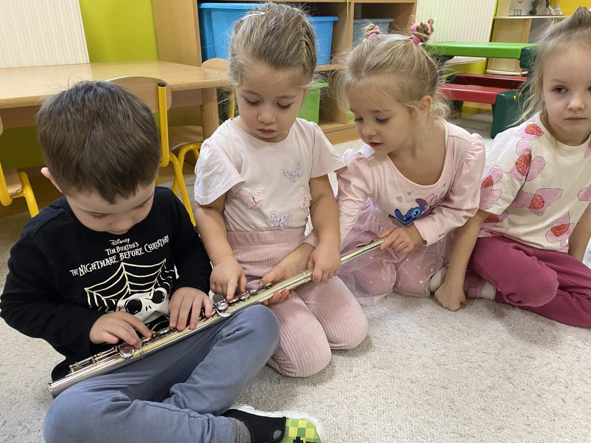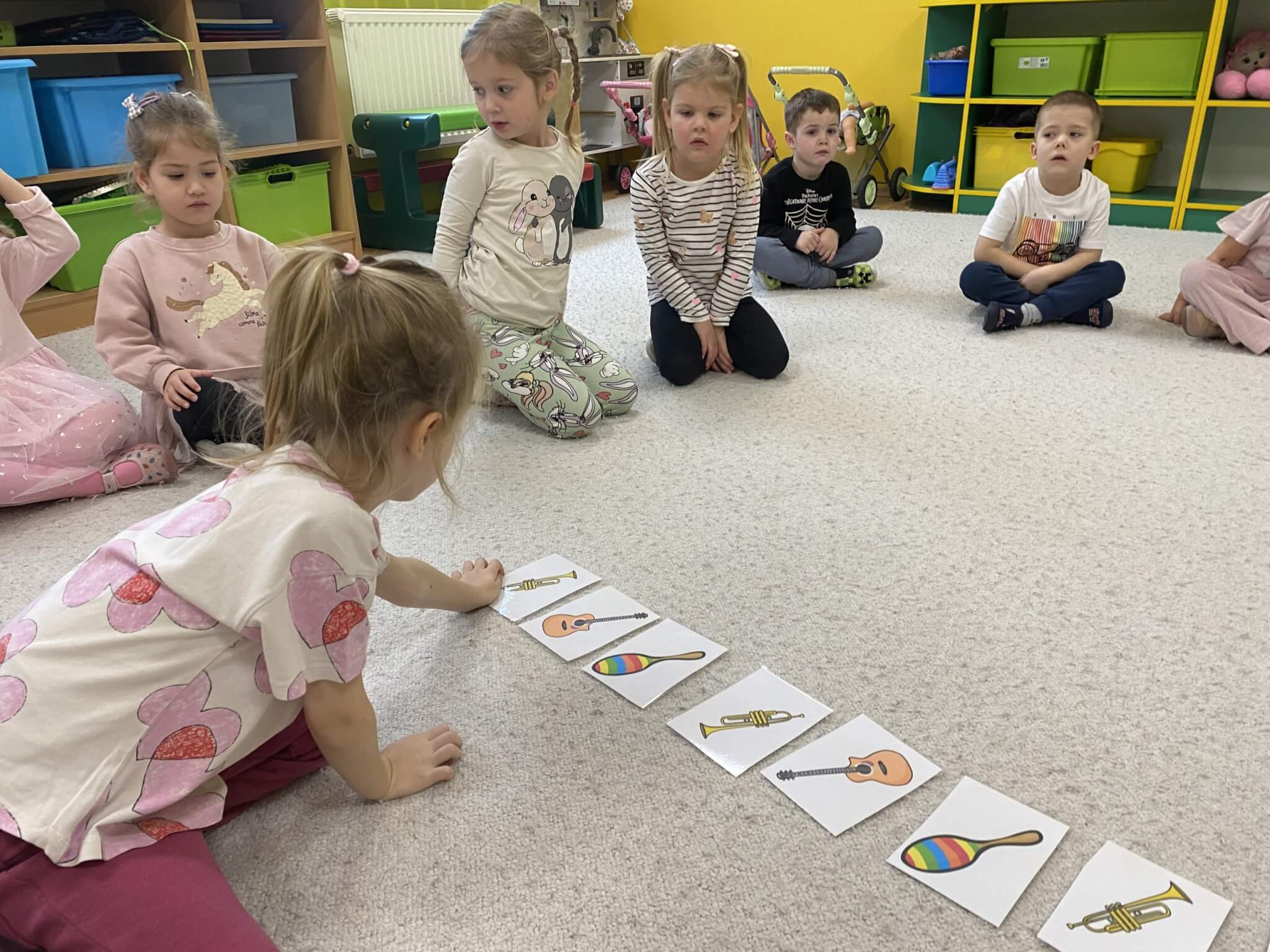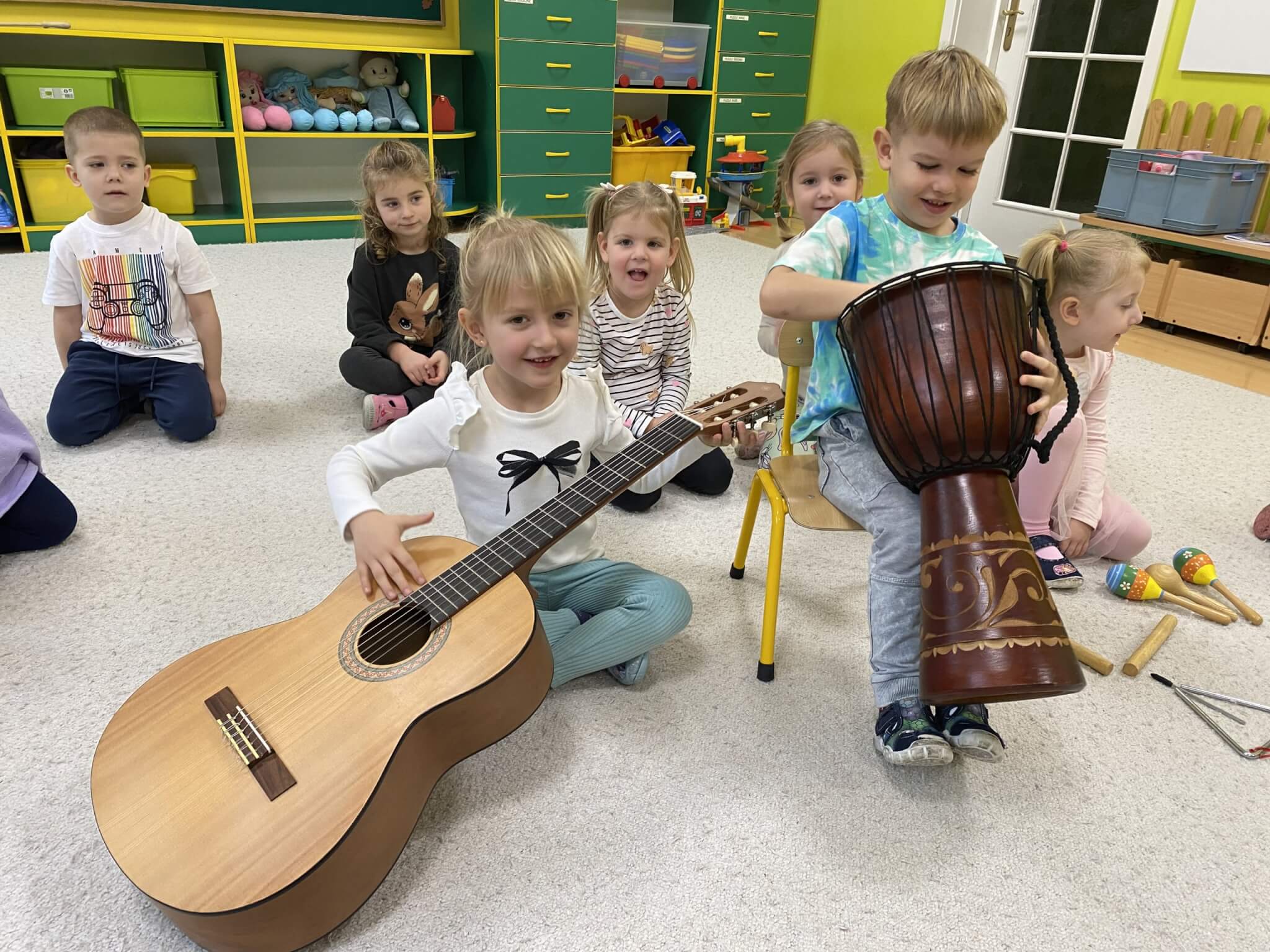 28 listopada 2025 r. W tym tygodniu dzieci z grupy II przeniosły się do świata muzyki.🎵 Poznały nazwy poszczególnych instrumentów oraz pojęcia takie jak: muzyk, dyrygent, orkiestra i rytm. Przedszkolaki miały okazję zagrać na różnych instrumentach: gitarze, bębnie zwanym djembe, marakasach, drewienkach i trójkącie, a także wykonać ćwiczenia rytmiczne z wykorzystaniem „bum bum rurek”. „Bratki” wysłuchały piosenek granych przez Panią Wiktorię na flecie poprzecznym oraz odgadywały tytuły zagranych utworów. W ramach pracy plastycznej każde dziecko wykonało swój instrument – ukulele.🎺🥁🎻