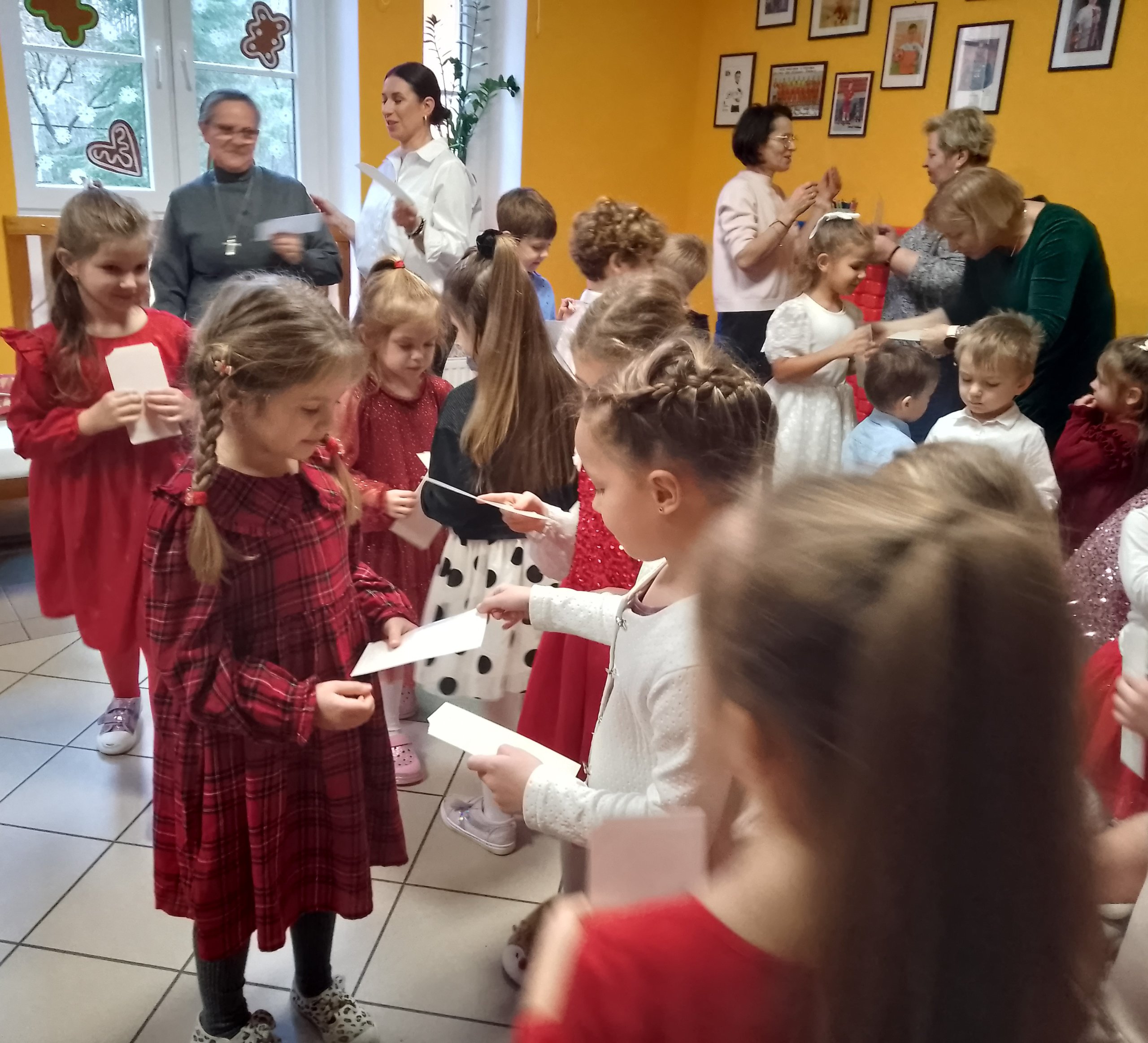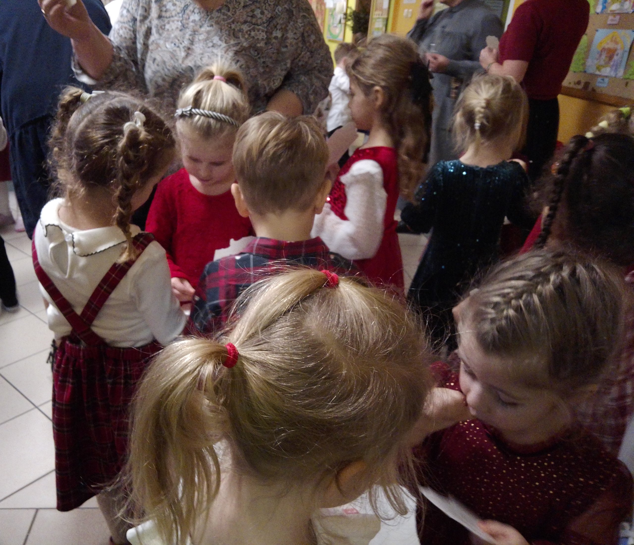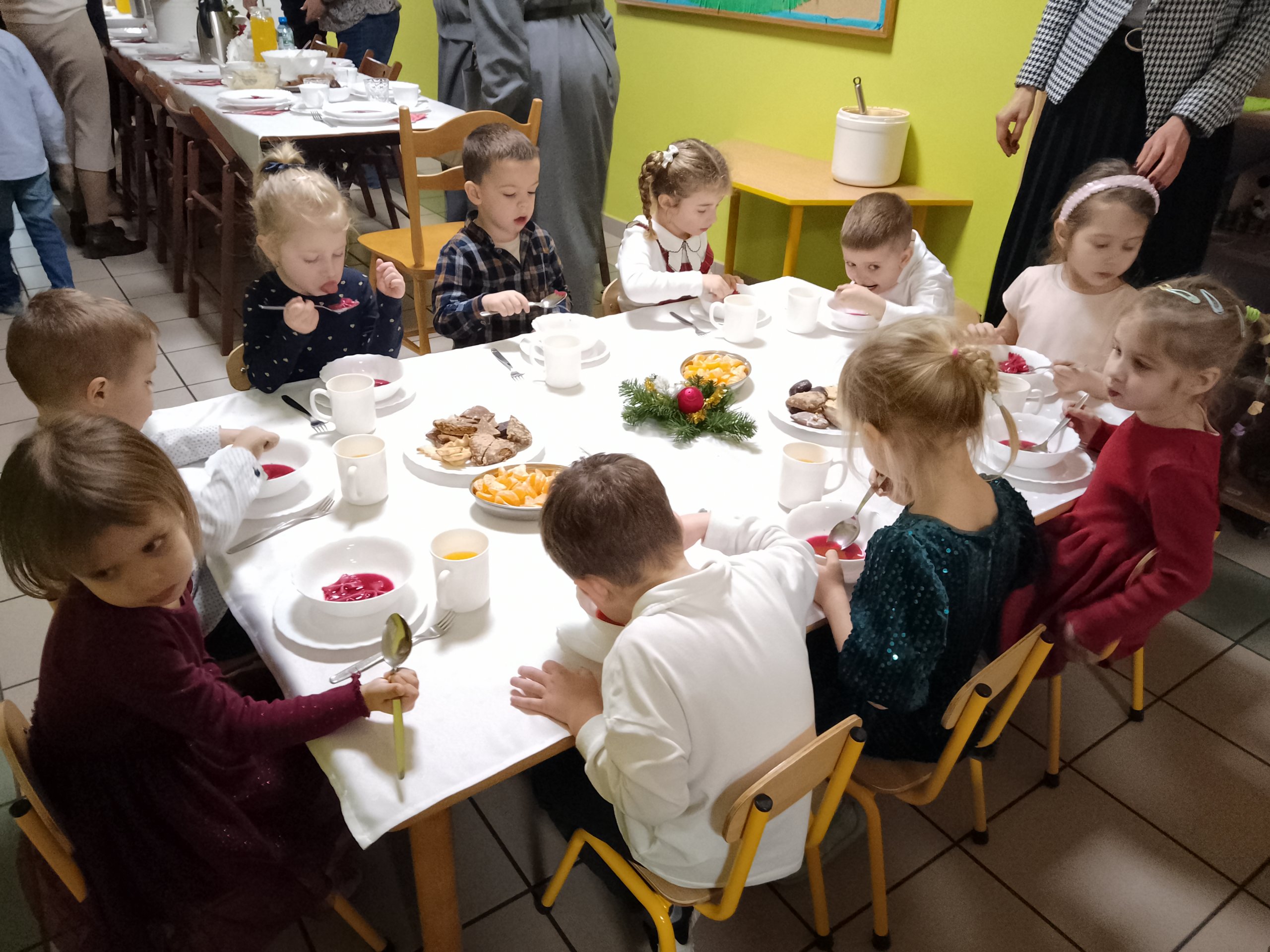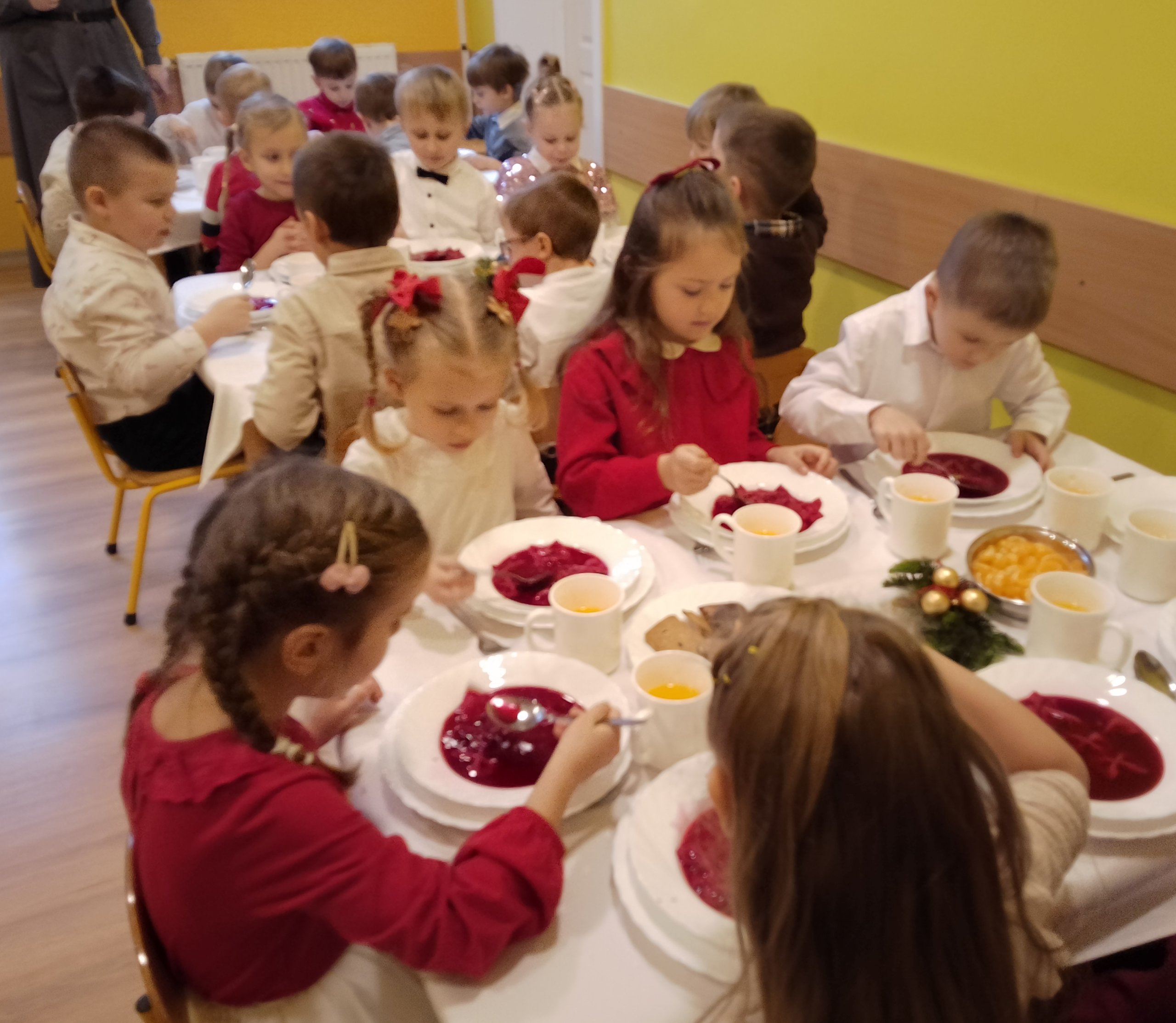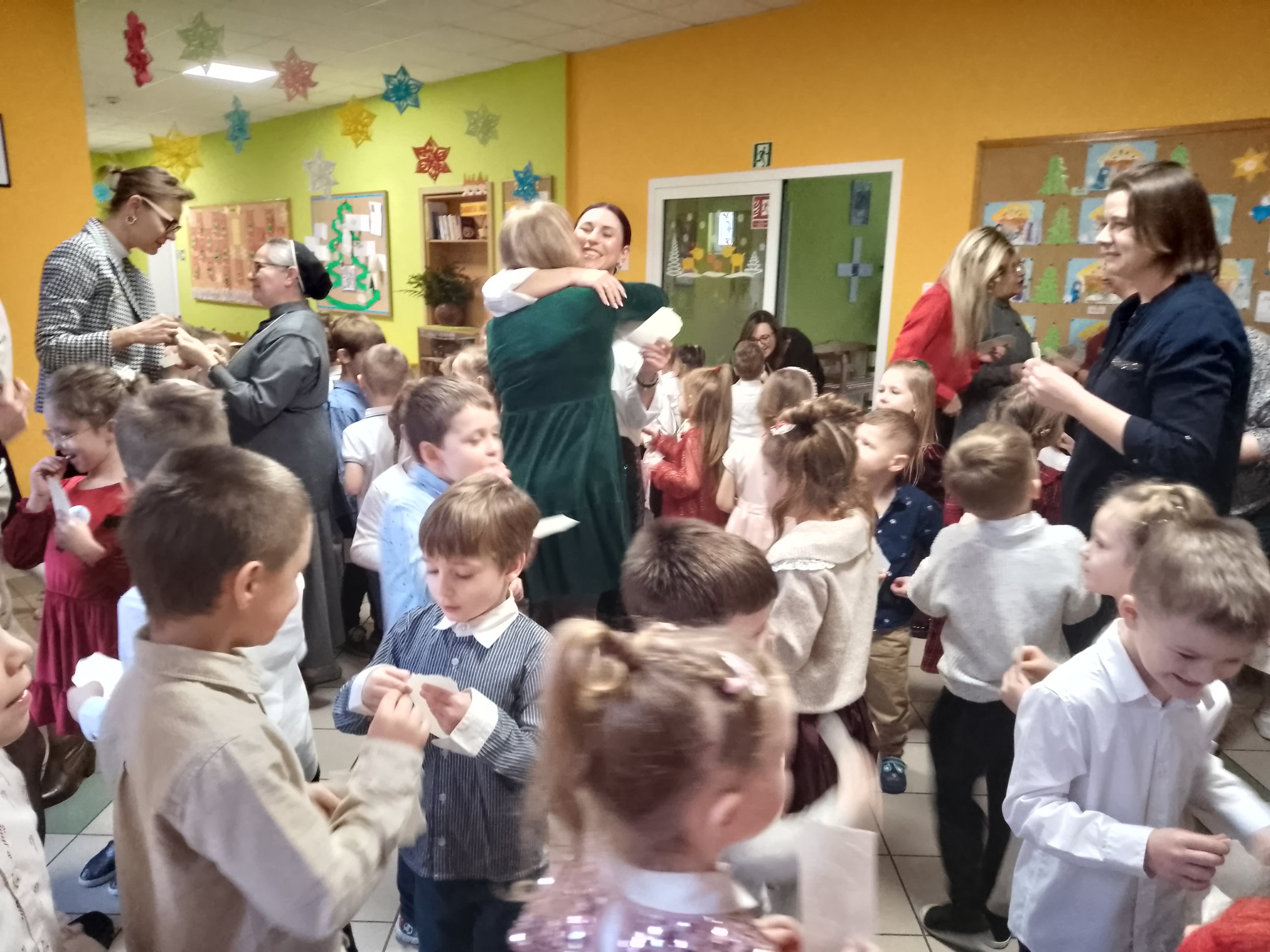 23 grudnia 2025 r. Od rana wszystkie dzieci pięknie ubrane, siostry i panie krzątają się, ustawiają i nakrywają stoły, bo to ważny i piękny dzień przed nami. Przed południem przyszły Siostry Przełożone i mogliśmy zacząć nasze przedszkolne dzielenie się opłatkiem, składanie sobie życzeń i kolędowanie przy świątecznym obiedzie. A my jeszcze chcemy złożyć życzenia wszystkim Rodzicom, Przyjaciołom i Dobroczyńcom naszego przedszkola – radosnego świętowania Bożego Narodzenia! Niech Dzieciątko Boże błogosławi, obdarza pokojem, miłością i nadzieją w każdym dniu Nowego Roku ! Wesołych Świąt!