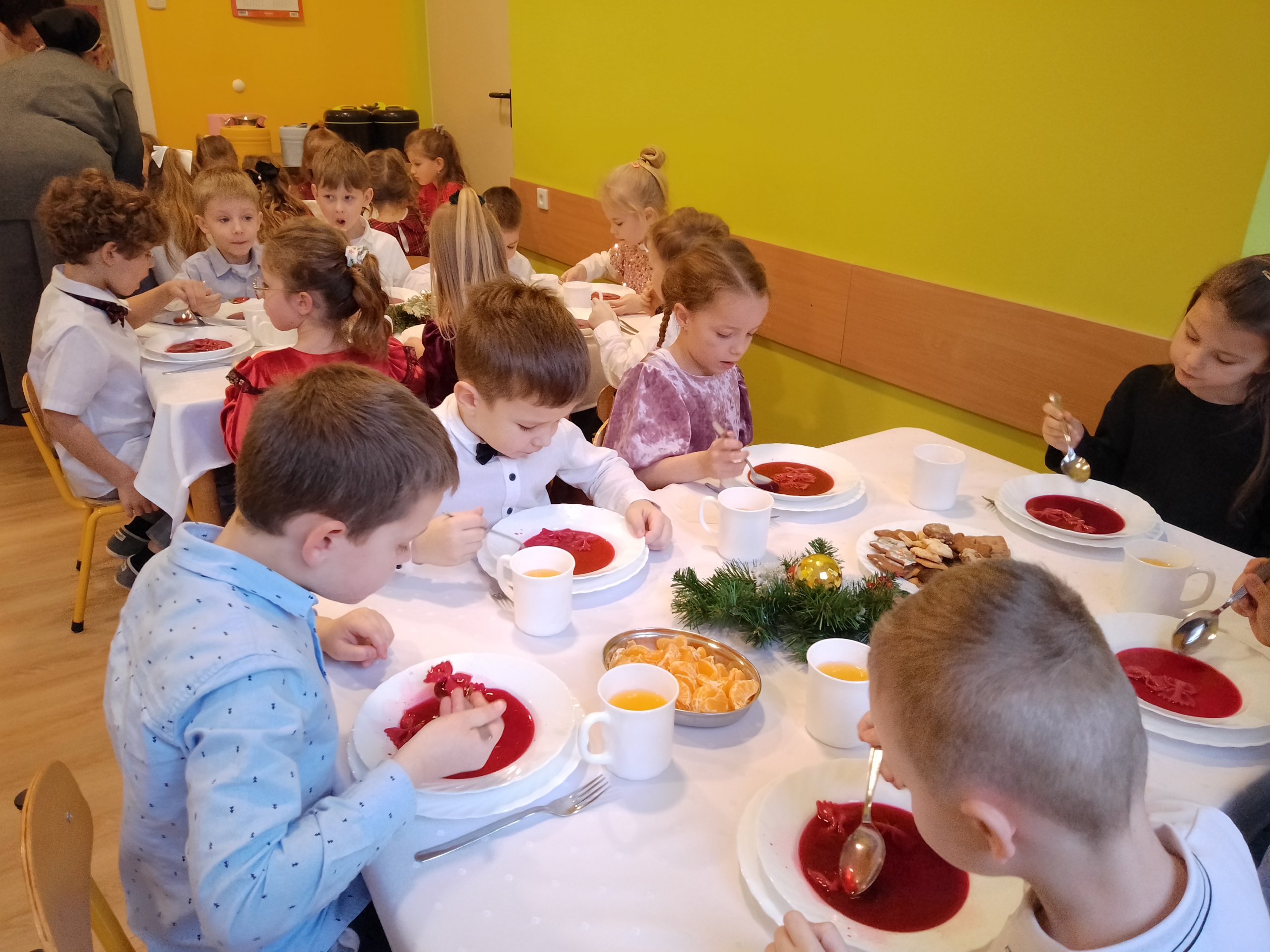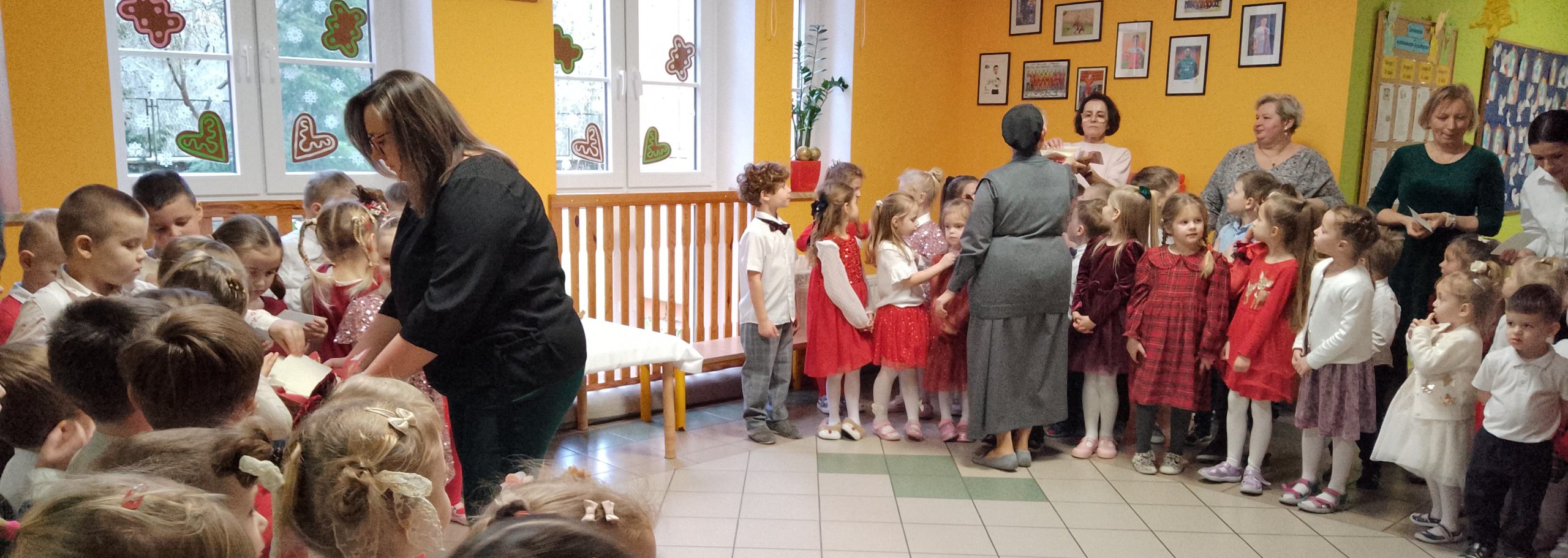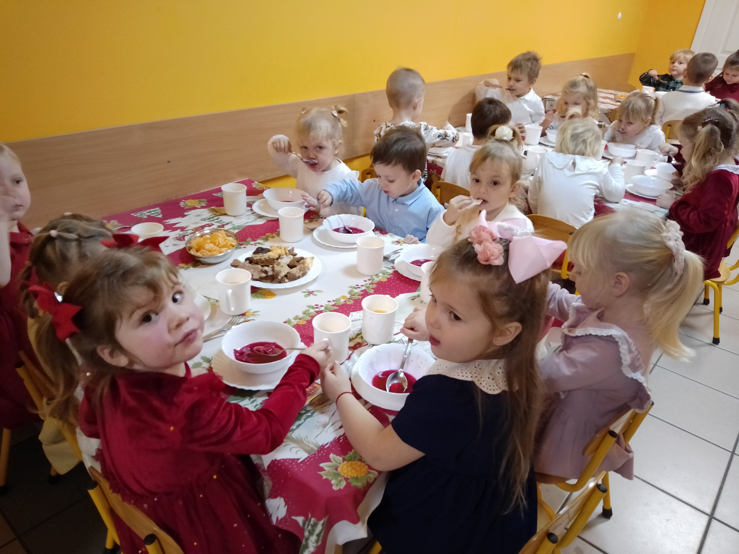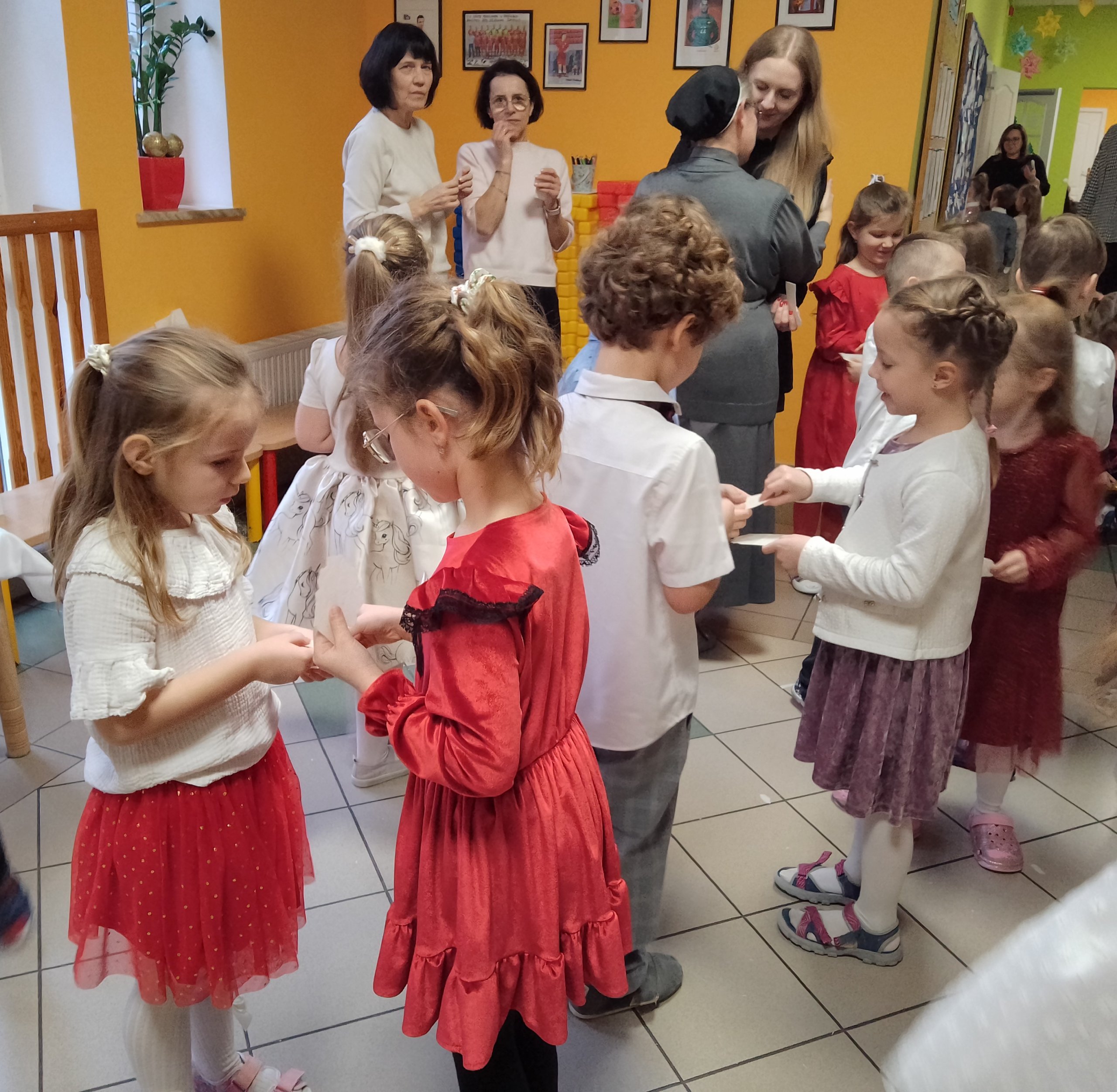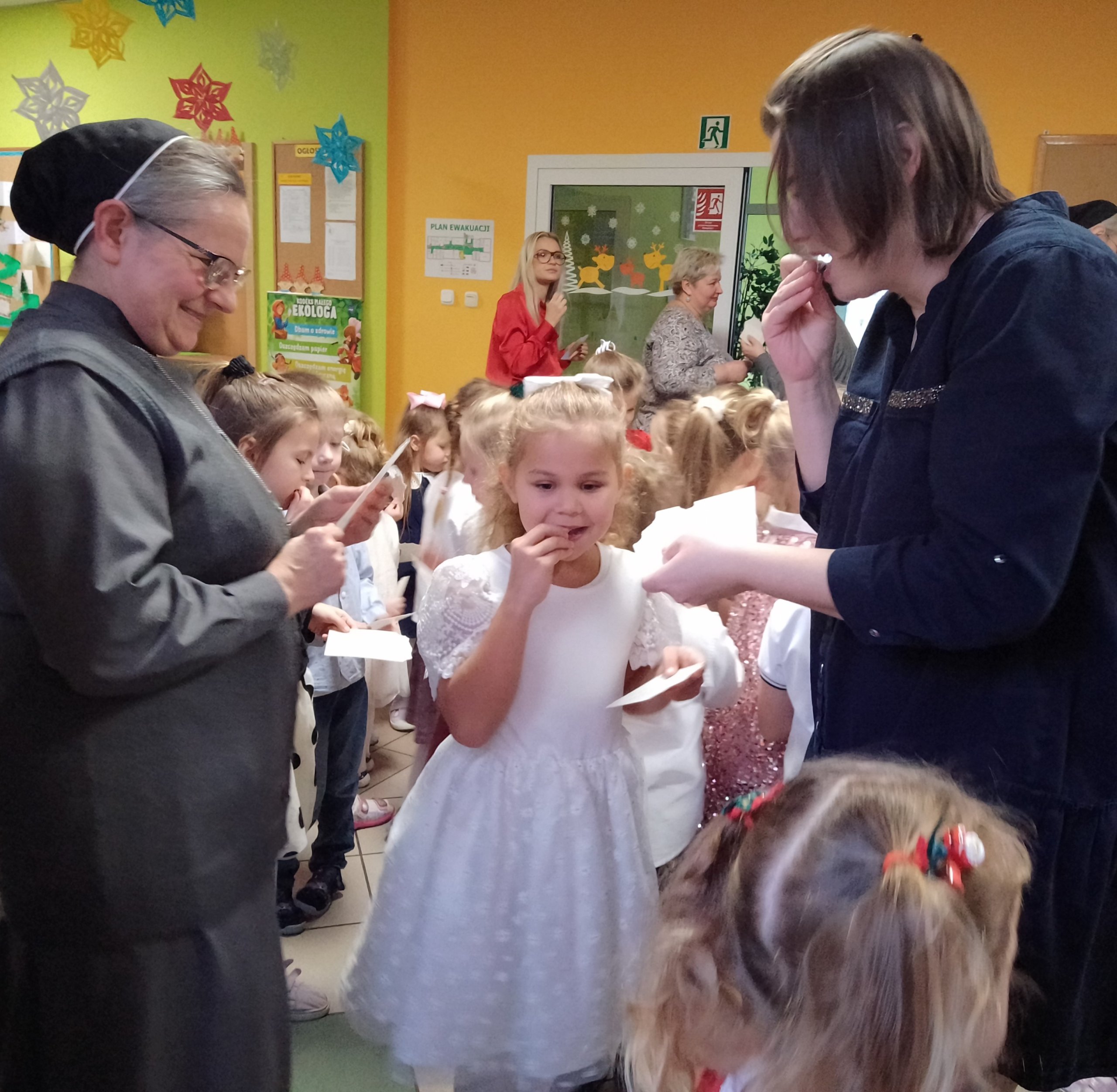 23 grudnia 2025 r. Od rana wszystkie dzieci pięknie ubrane, siostry i panie krzątają się, ustawiają i nakrywają stoły, bo to ważny i piękny dzień przed nami. Przed południem przyszły Siostry Przełożone i mogliśmy zacząć nasze przedszkolne dzielenie się opłatkiem, składanie sobie życzeń i kolędowanie przy świątecznym obiedzie. A my jeszcze chcemy złożyć życzenia wszystkim Rodzicom, Przyjaciołom i Dobroczyńcom naszego przedszkola – radosnego świętowania Bożego Narodzenia! Niech Dzieciątko Boże błogosławi, obdarza pokojem, miłością i nadzieją w każdym dniu Nowego Roku ! Wesołych Świąt!
