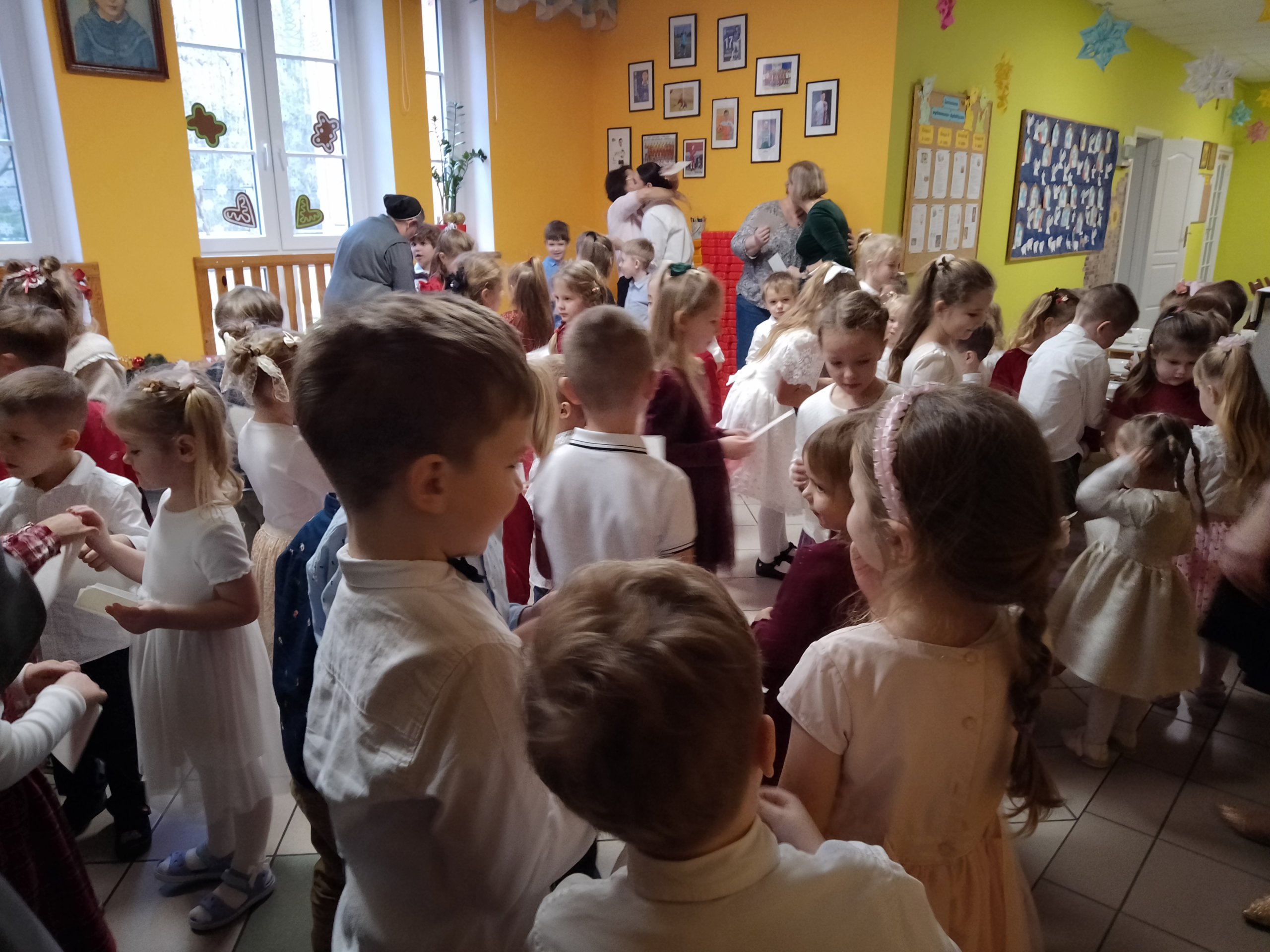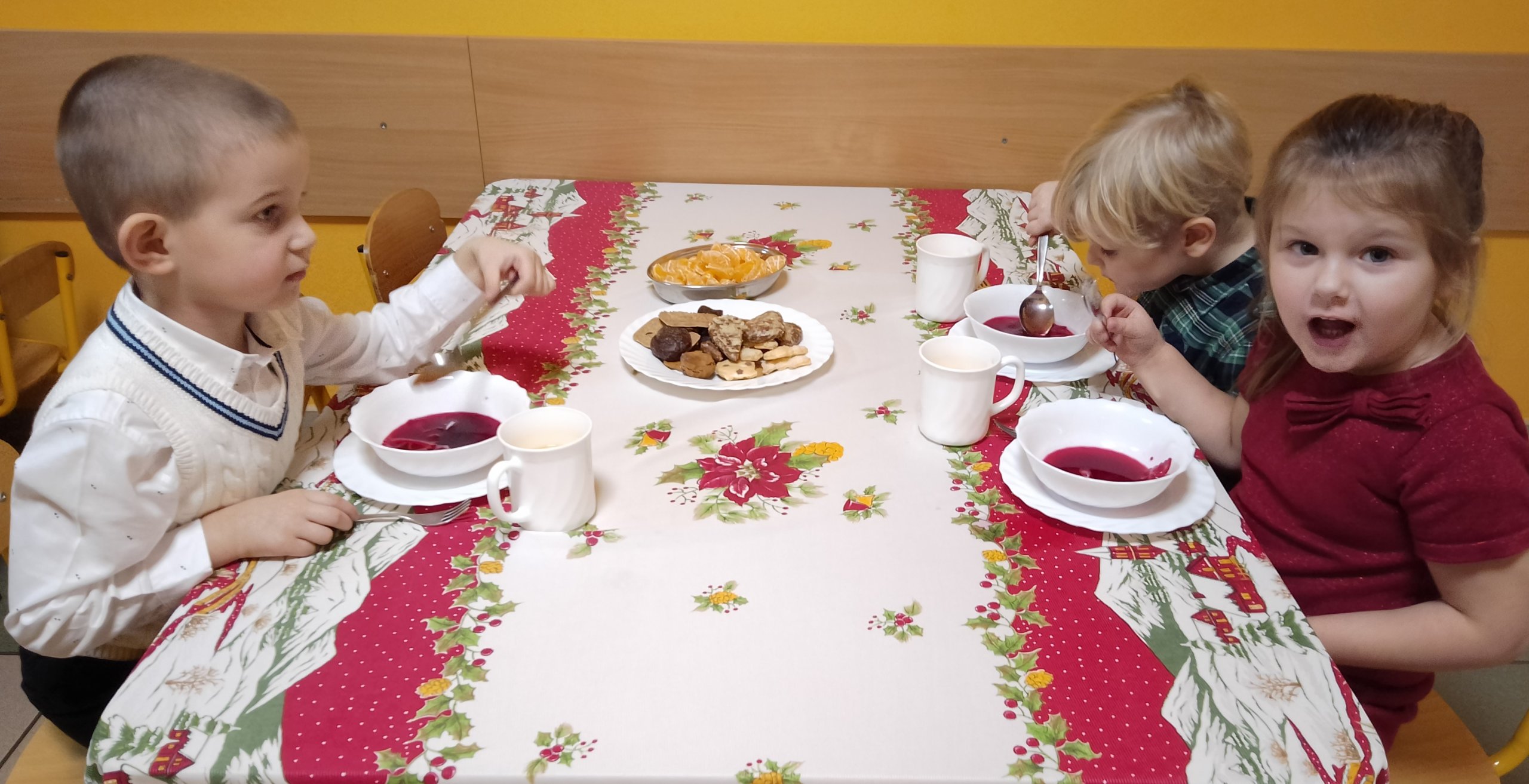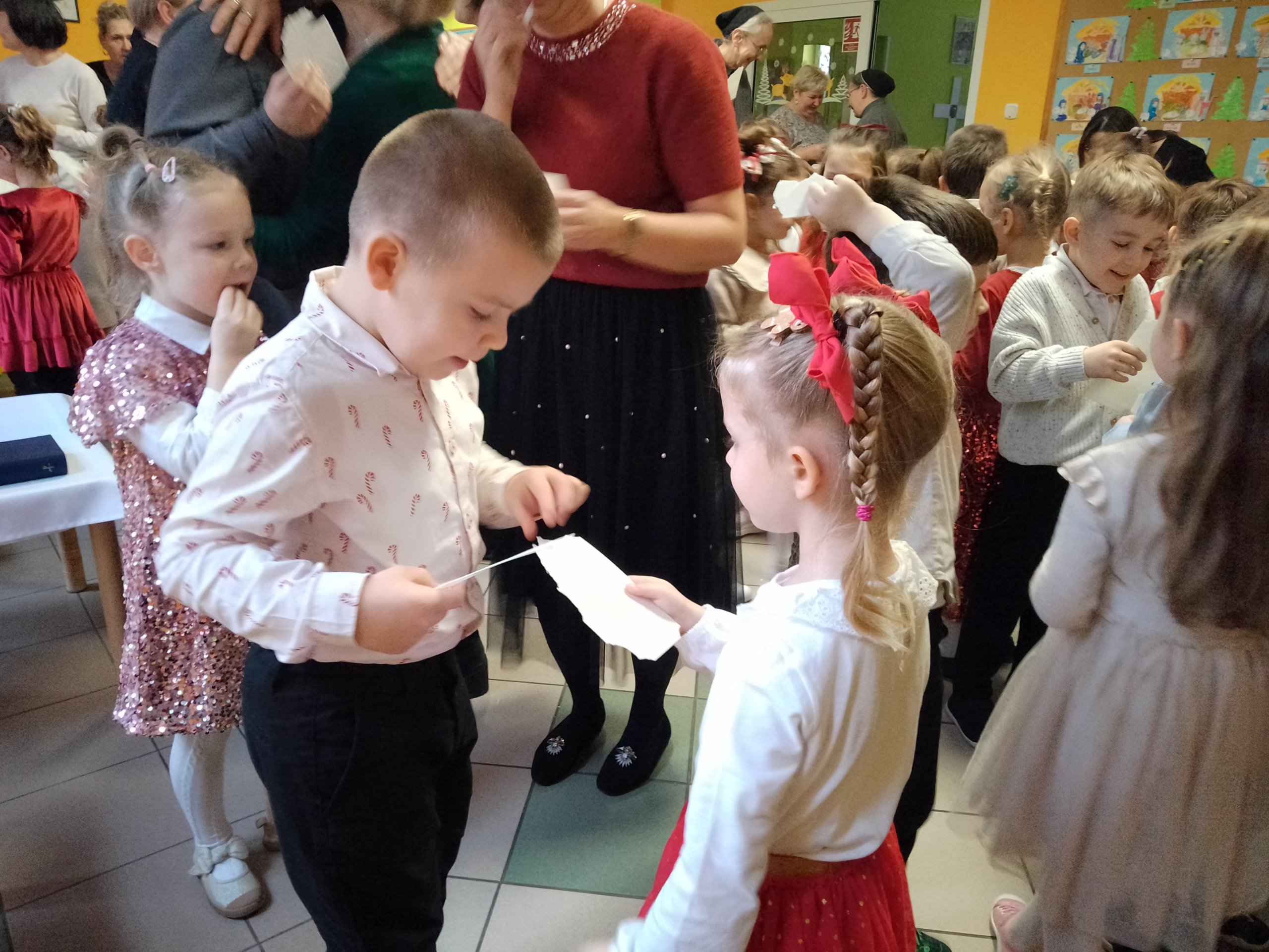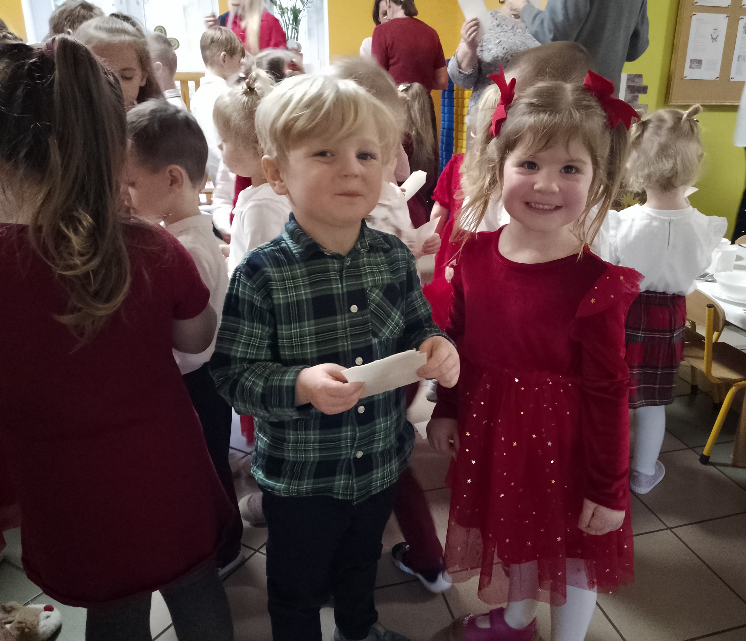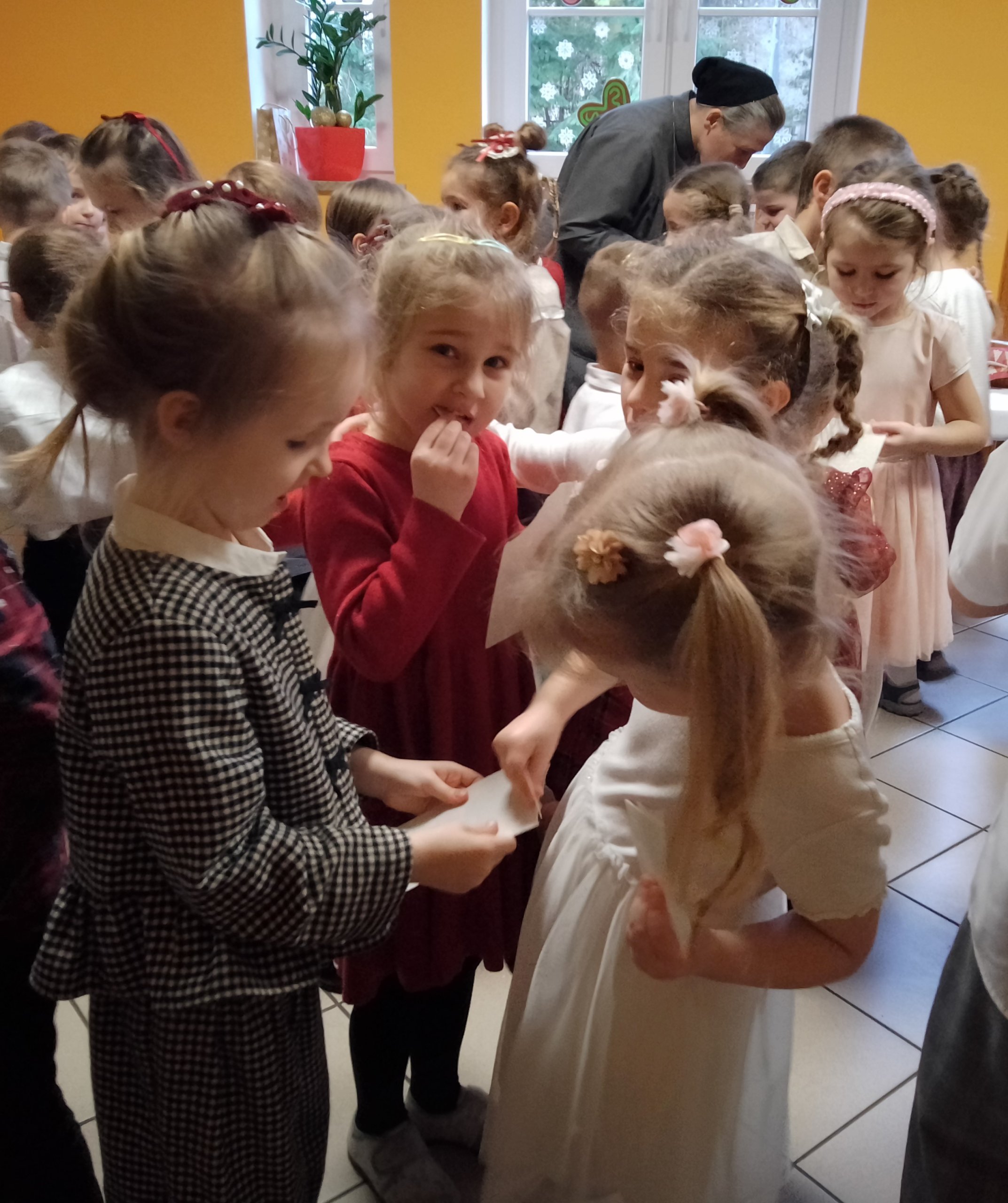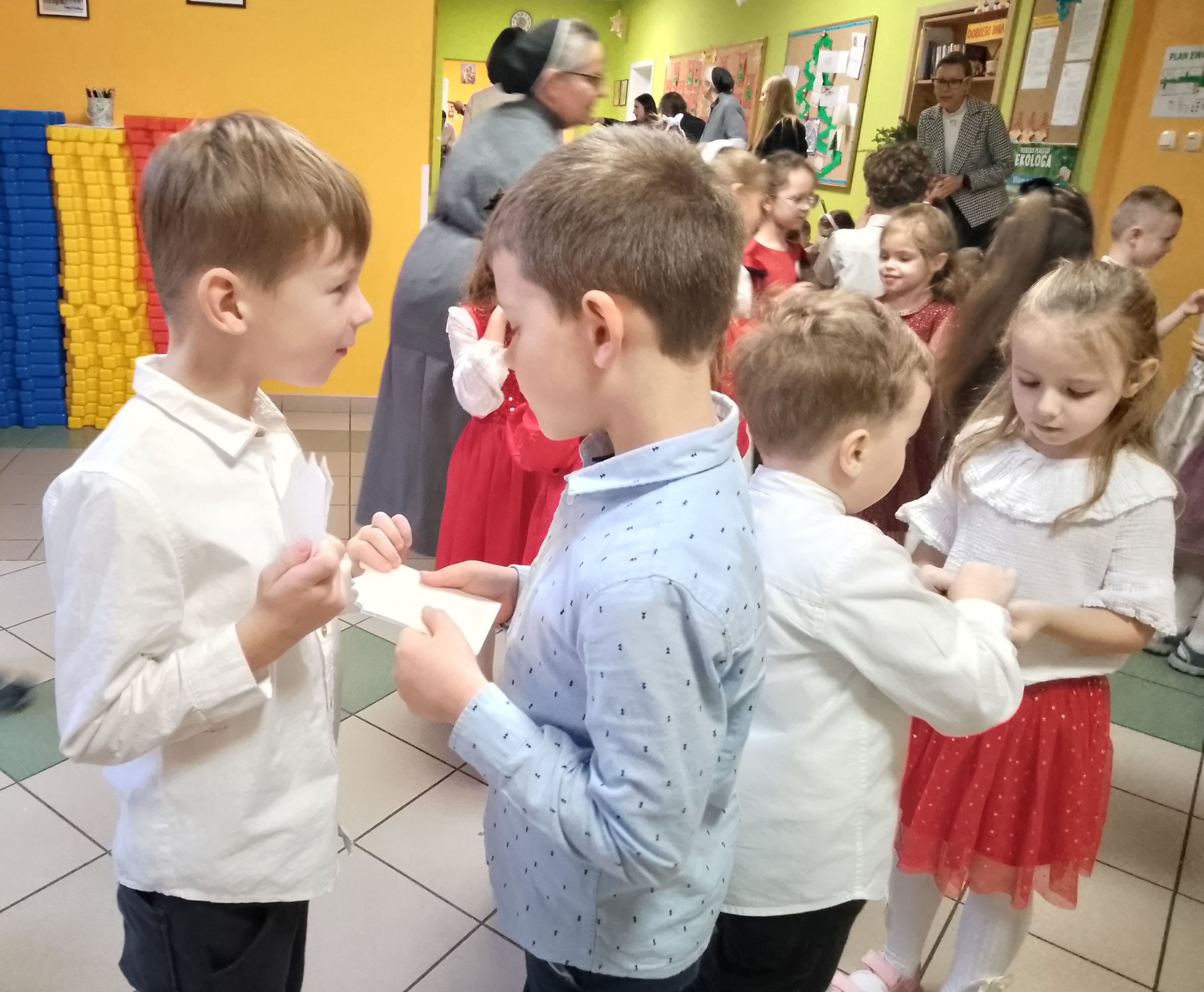 23 grudnia 2025 r. Od rana wszystkie dzieci pięknie ubrane, siostry i panie krzątają się, ustawiają i nakrywają stoły, bo to ważny i piękny dzień przed nami. Przed południem przyszły Siostry Przełożone i mogliśmy zacząć nasze przedszkolne dzielenie się opłatkiem, składanie sobie życzeń i kolędowanie przy świątecznym obiedzie. A my jeszcze chcemy złożyć życzenia wszystkim Rodzicom, Przyjaciołom i Dobroczyńcom naszego przedszkola – radosnego świętowania Bożego Narodzenia! Niech Dzieciątko Boże błogosławi, obdarza pokojem, miłością i nadzieją w każdym dniu Nowego Roku ! Wesołych Świąt!