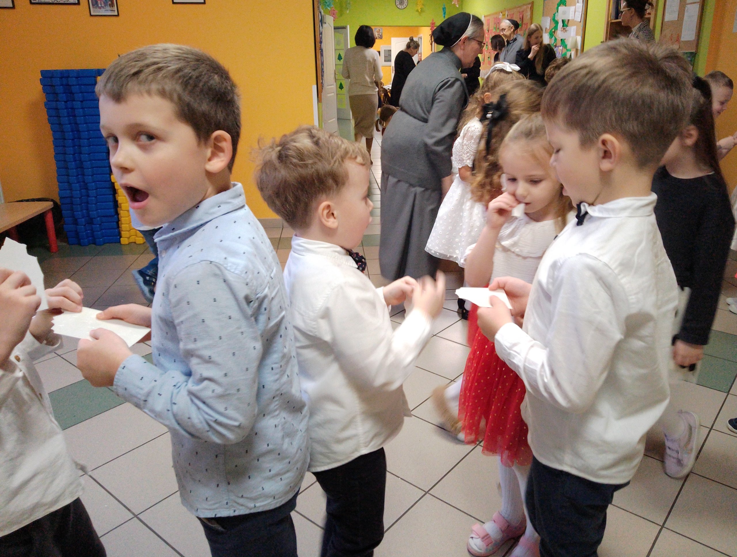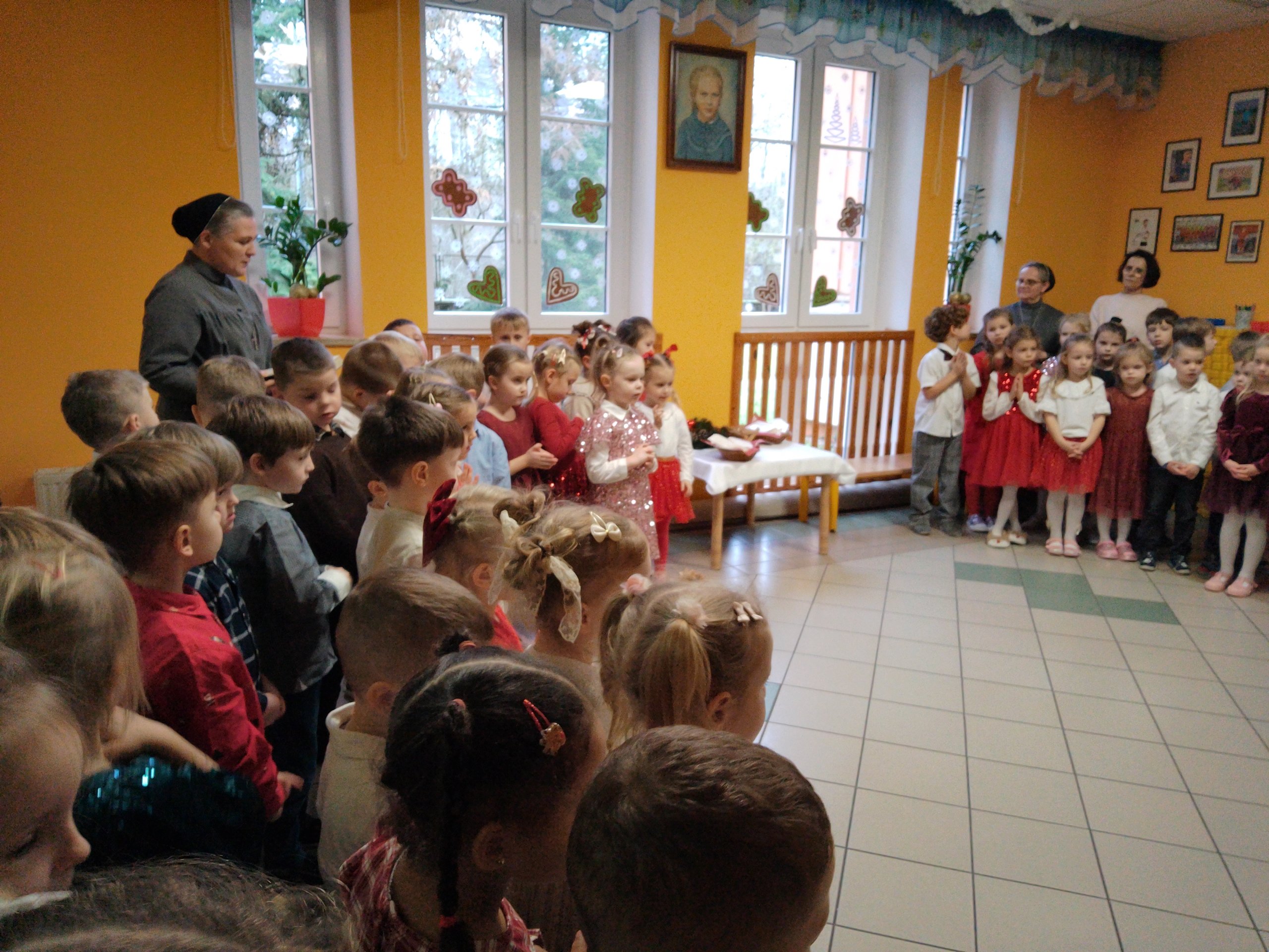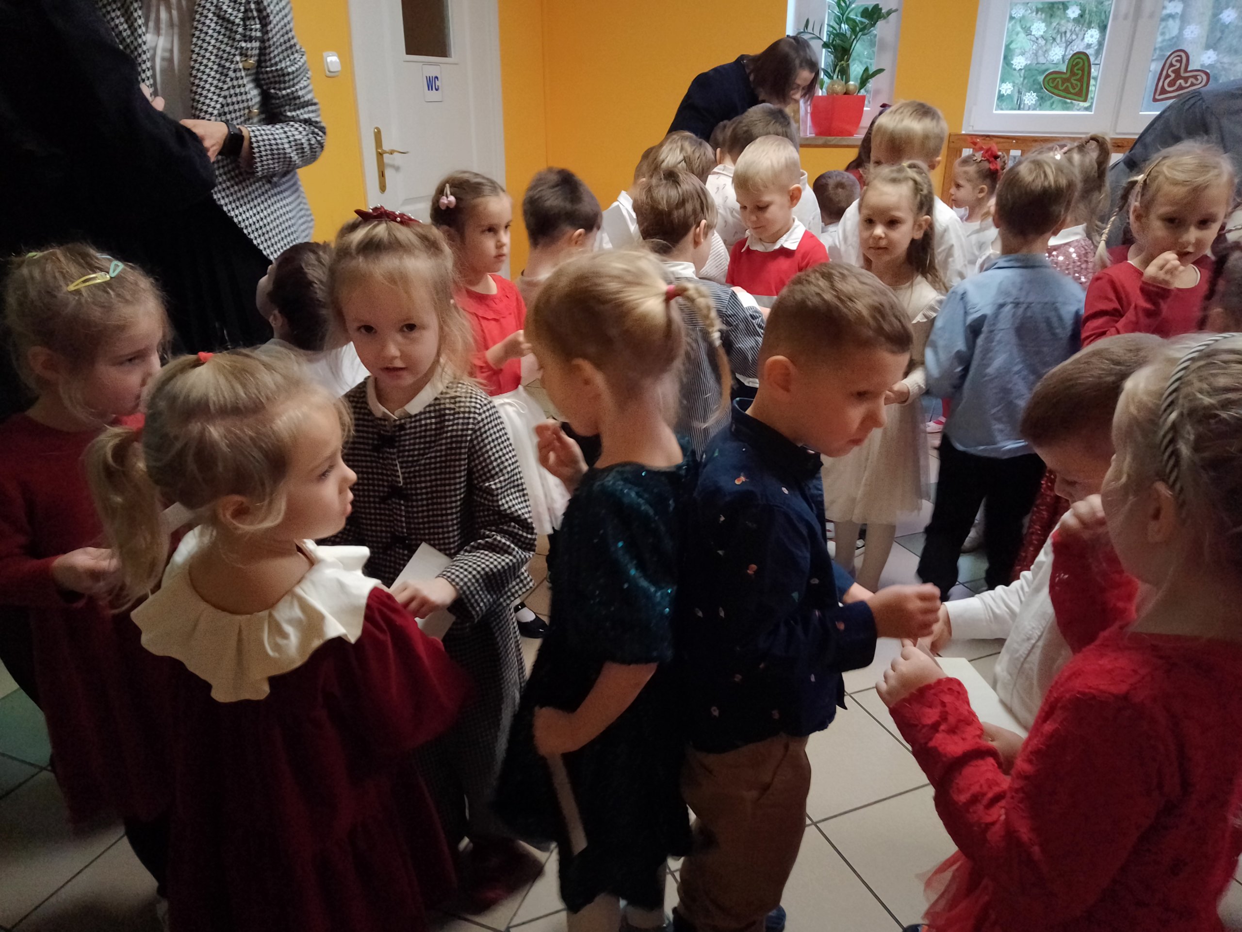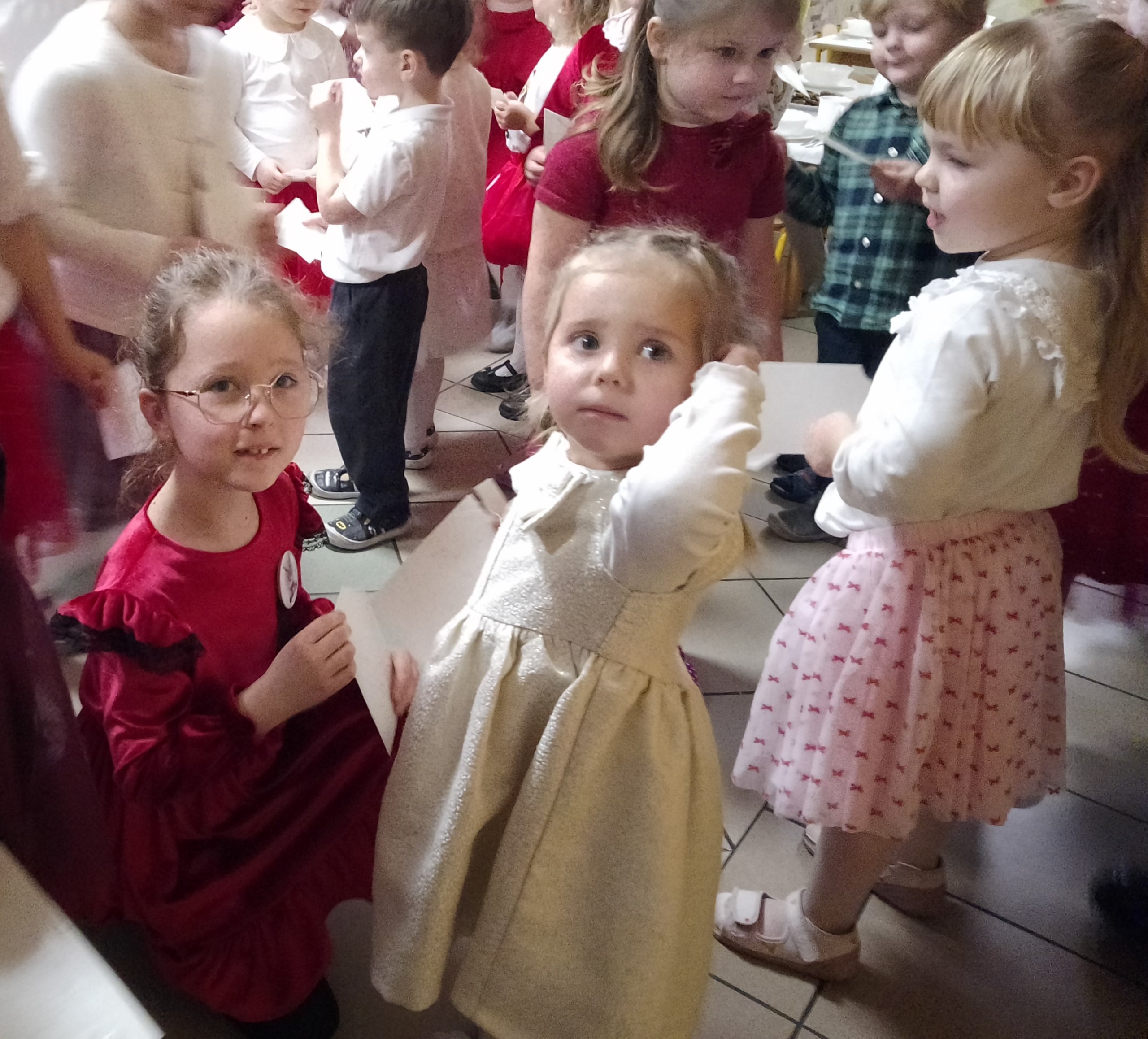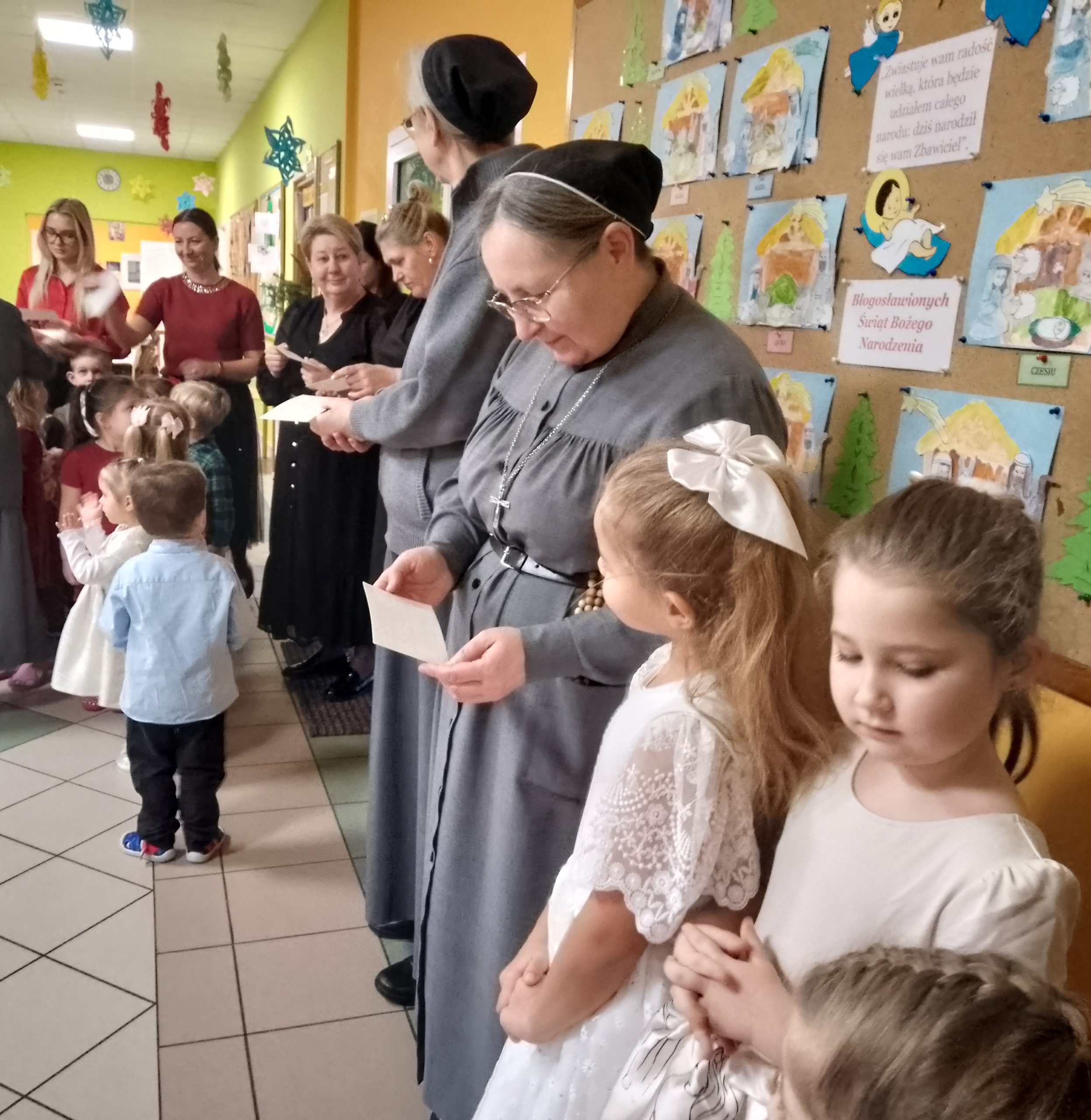 23 grudnia 2025 r. Od rana wszystkie dzieci pięknie ubrane, siostry i panie krzątają się, ustawiają i nakrywają stoły, bo to ważny i piękny dzień przed nami. Przed południem przyszły Siostry Przełożone i mogliśmy zacząć nasze przedszkolne dzielenie się opłatkiem, składanie sobie życzeń i kolędowanie przy świątecznym obiedzie. A my jeszcze chcemy złożyć życzenia wszystkim Rodzicom, Przyjaciołom i Dobroczyńcom naszego przedszkola – radosnego świętowania Bożego Narodzenia! Niech Dzieciątko Boże błogosławi, obdarza pokojem, miłością i nadzieją w każdym dniu Nowego Roku ! Wesołych Świąt!