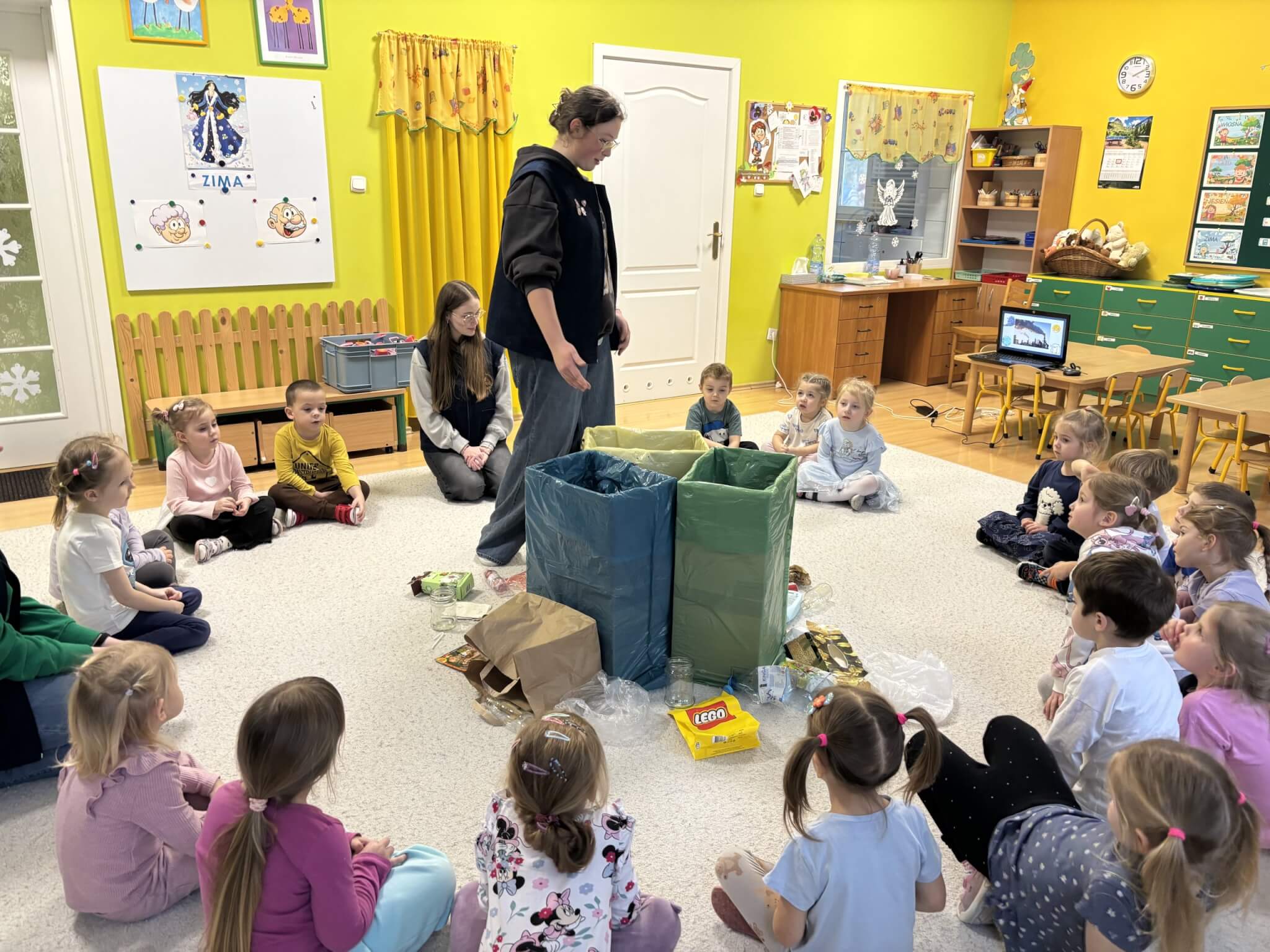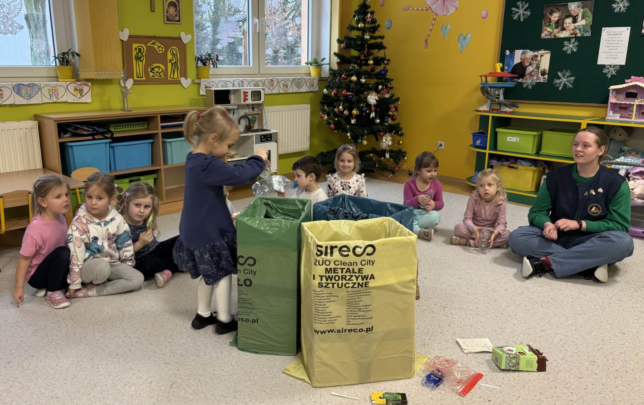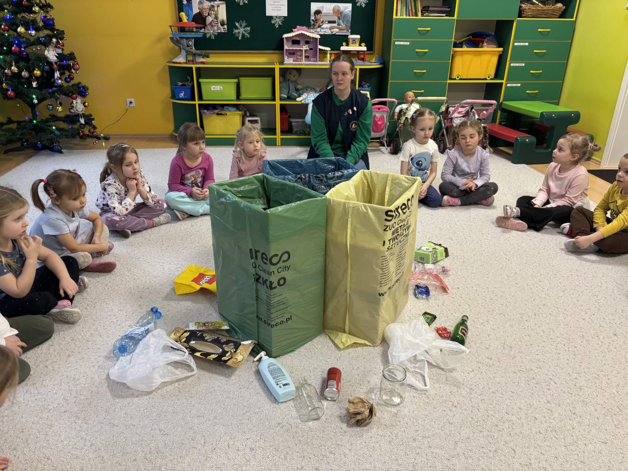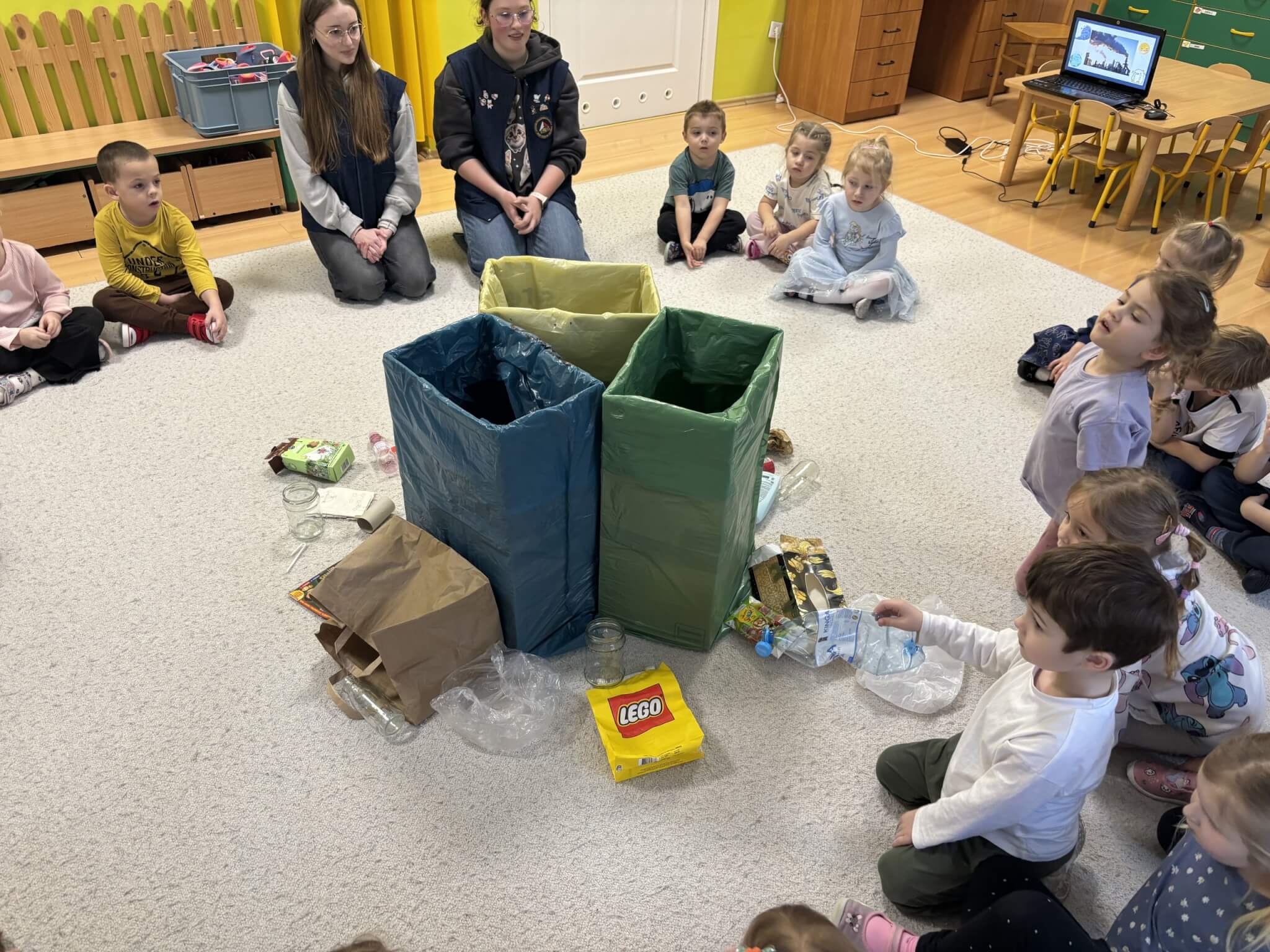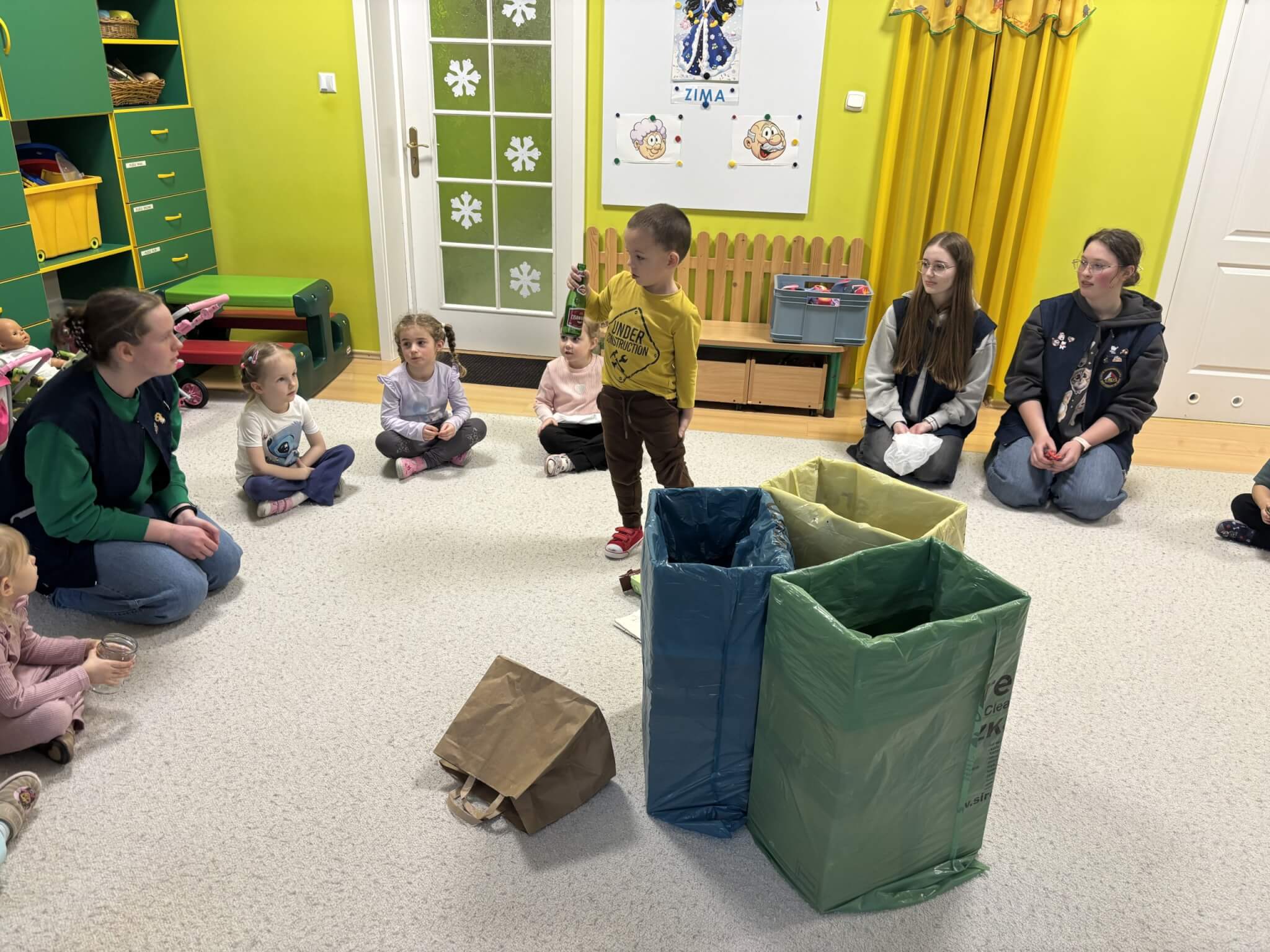 14 stycznia 2026 r. Uczennice z LO Sióstr Urszulanek prowadziły w gr. „Bratków” projekt „Świat w Rękach Dzieci” realizowany w ramach Zwolnionych z Teorii. Dzisiaj przedszkolaki dowiedziały się, że ziemia jest smutna jeśli o nią nie dbamy 🙁 – zaśmiecamy rzeki i jeziora, parki i lasy. „Bratki” zapoznały się z segregacja śmieci i obiecały, że będą obrońcami czystości ziemi 🙂