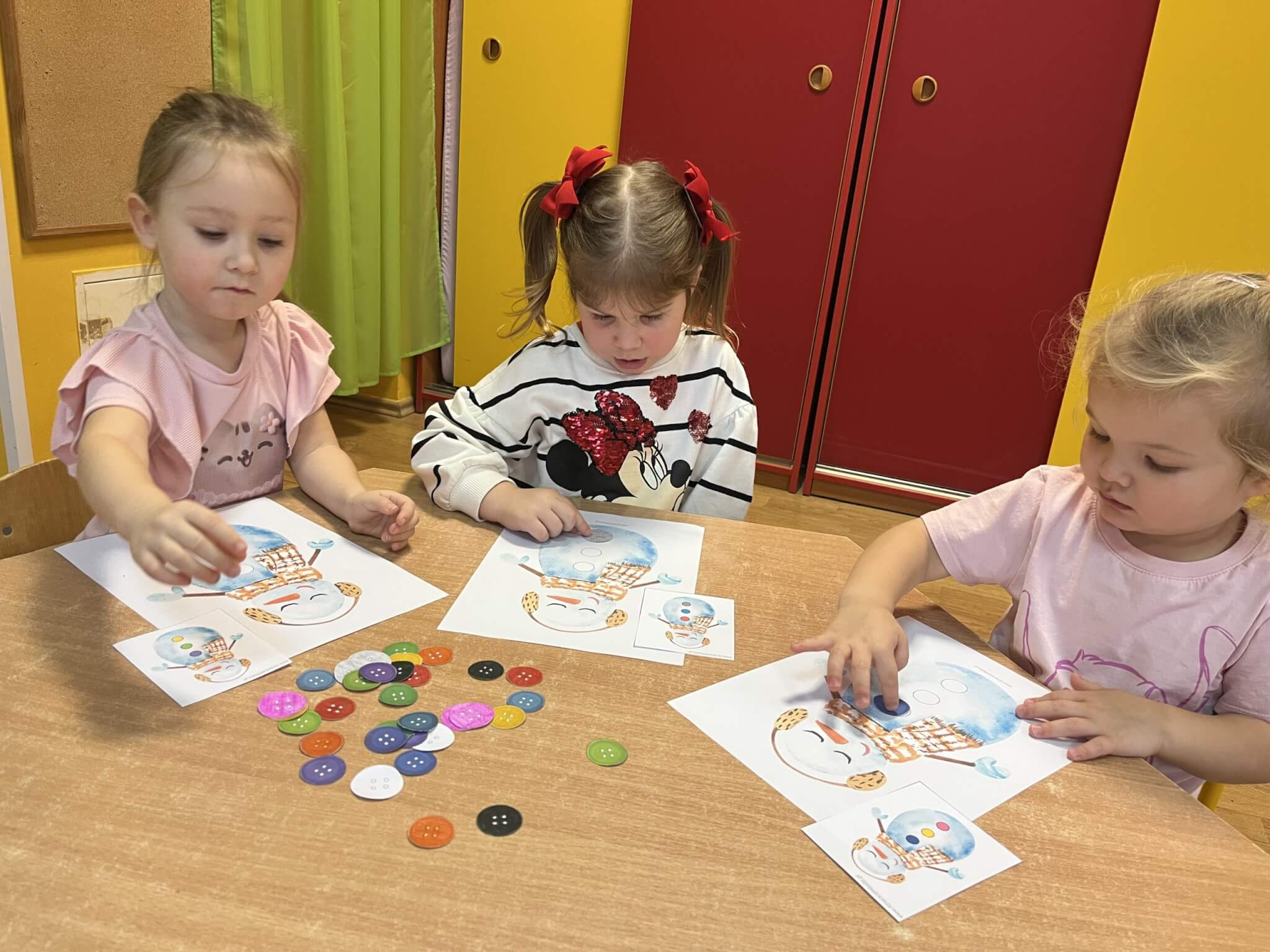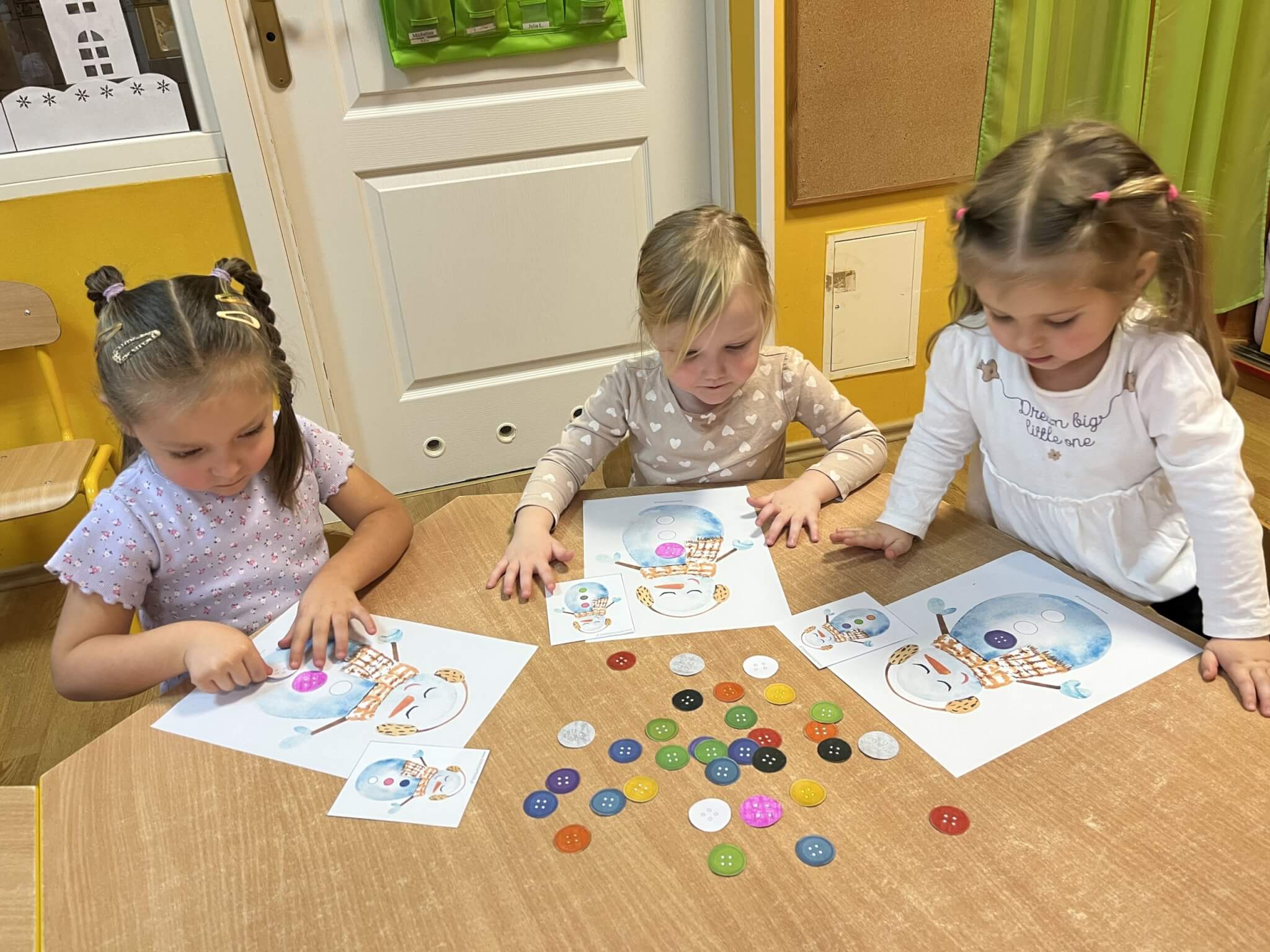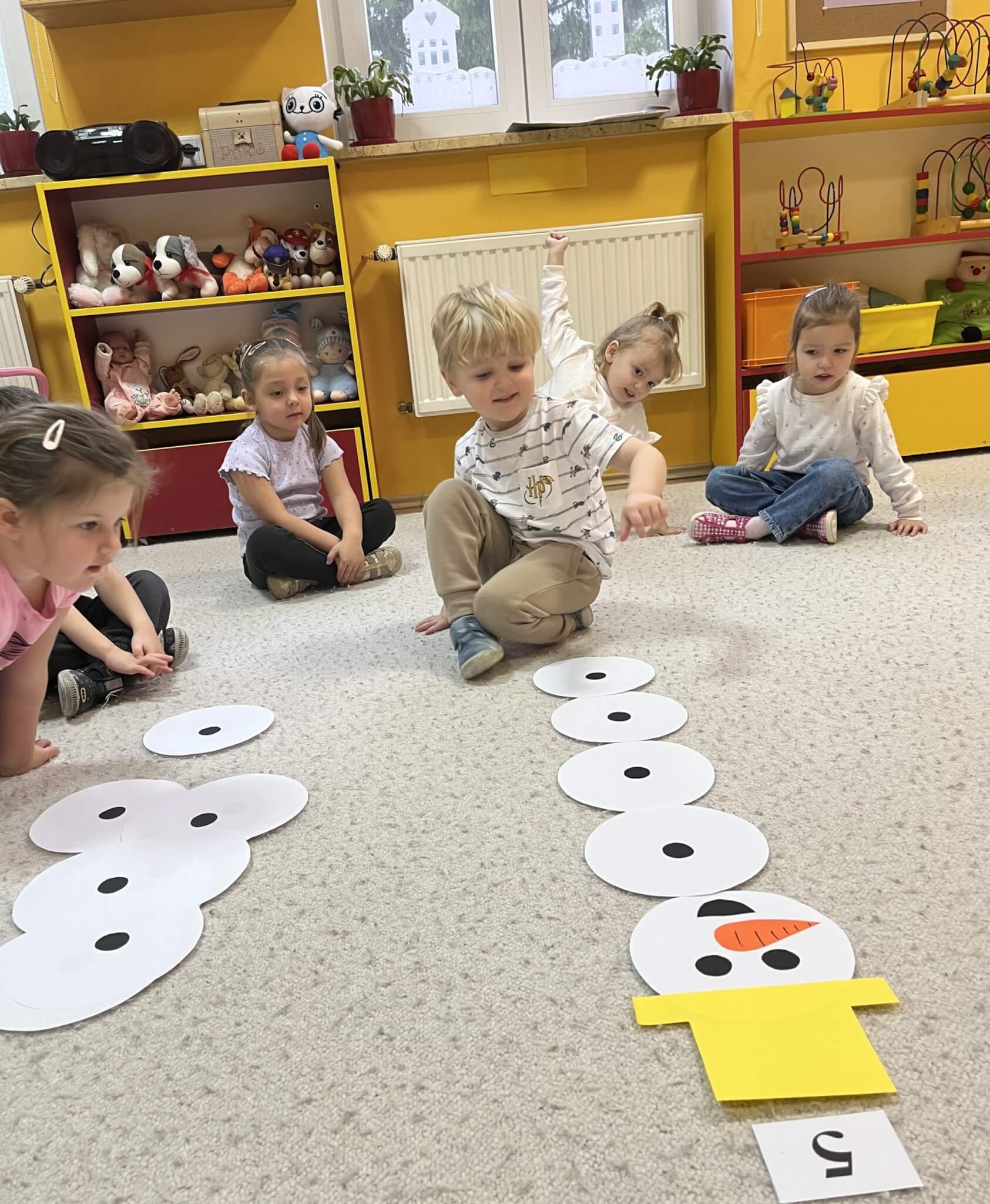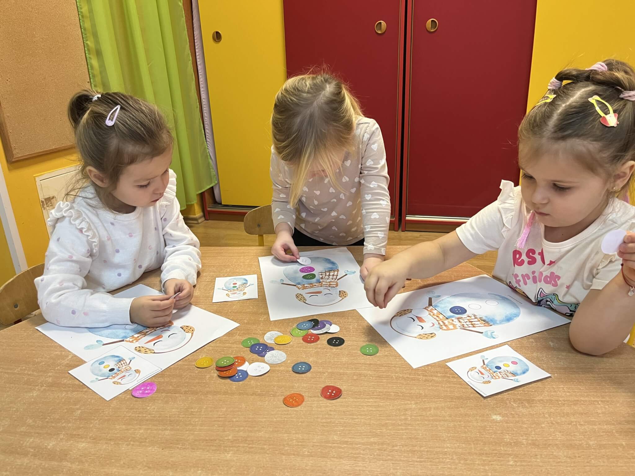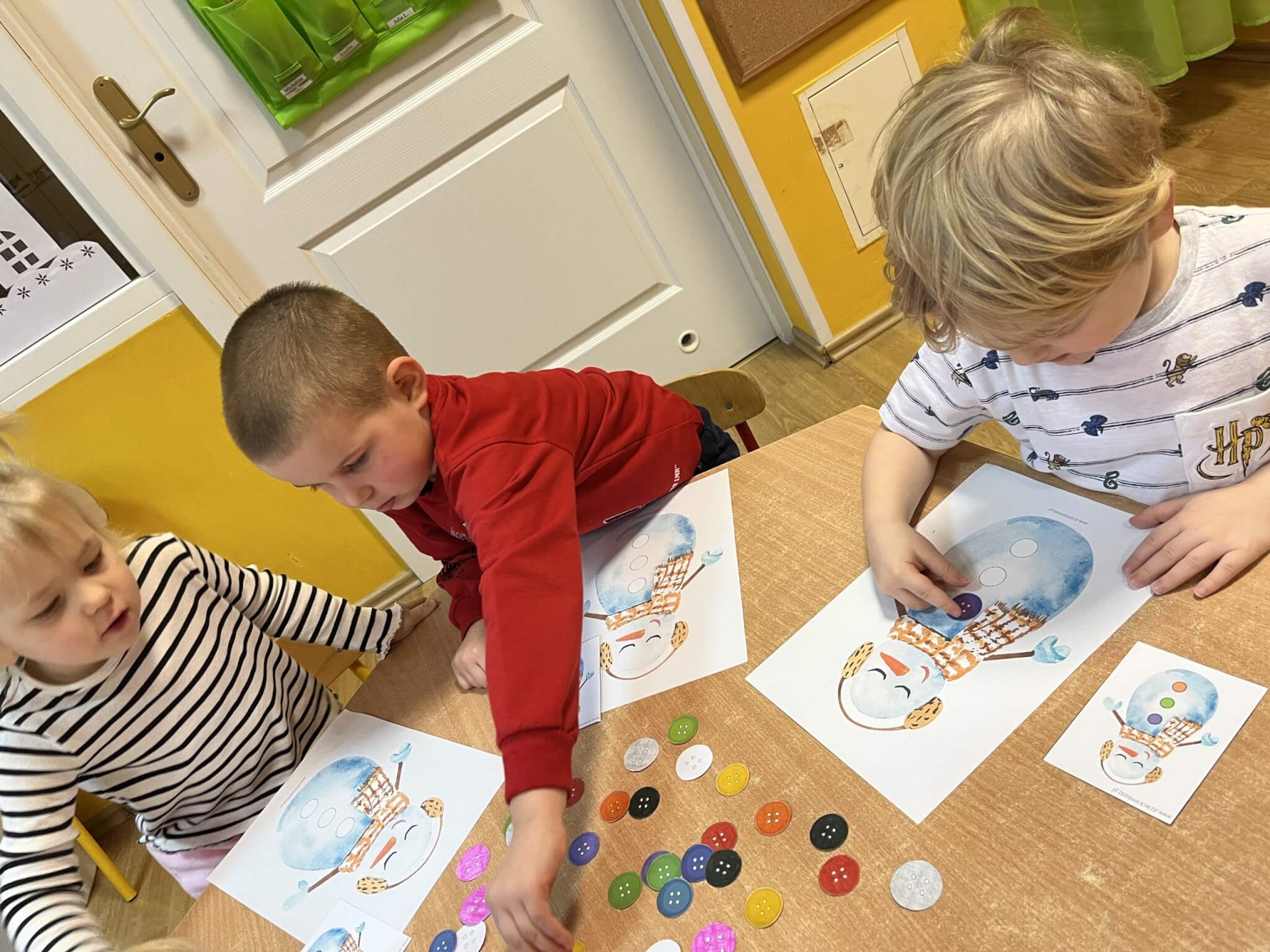 Zima 2026 r. Dzień rozpoczął się radosną zabawą muzyczno–ruchową pt. „Bałwankowa rodzina”, która wprowadziła dzieci w zimowy nastrój i sprzyjała integracji grupy. Dzieci chętnie podejmowały role, odważnie prezentowały się na środku oraz uważnie reagowały na sygnały muzyczne. Następnie podczas zajęć dzieci uczestniczyły w zabawie matematycznej z wykorzystaniem sylwet bałwanków. Przedszkolaki dopasowywały odpowiednią liczbę śniegowych kul do wskazanej cyfry oraz porównywały liczebność zbiorów (więcej, mniej). Na sam koniec zabawy każdy z bałwanków został ubrany w odpowiedni szalik do kompletu. Dzieci odwzorowywały również układy guzików według podanego wzoru. Ćwiczenia rozwijały umiejętność liczenia w zakresie dostosowanym do możliwości dzieci, spostrzegawczość wzrokową, koncentrację oraz logiczne myślenie. Zadania miały formę zabawy, co sprzyjało aktywnemu zaangażowaniu i radości z podejmowanych działań.