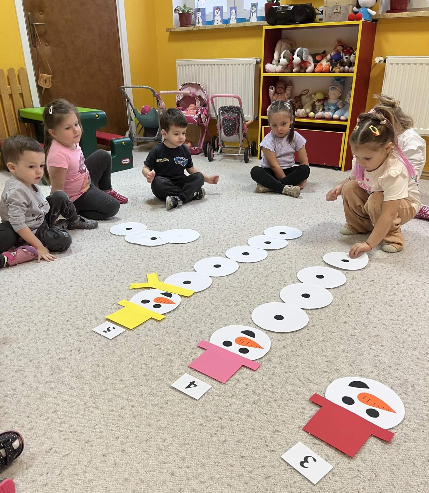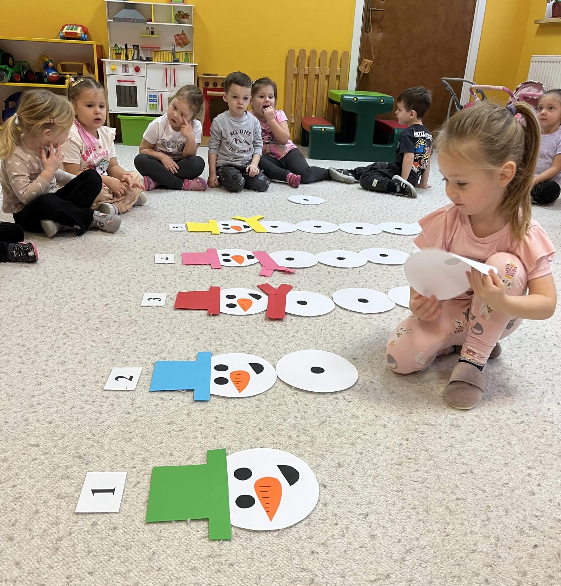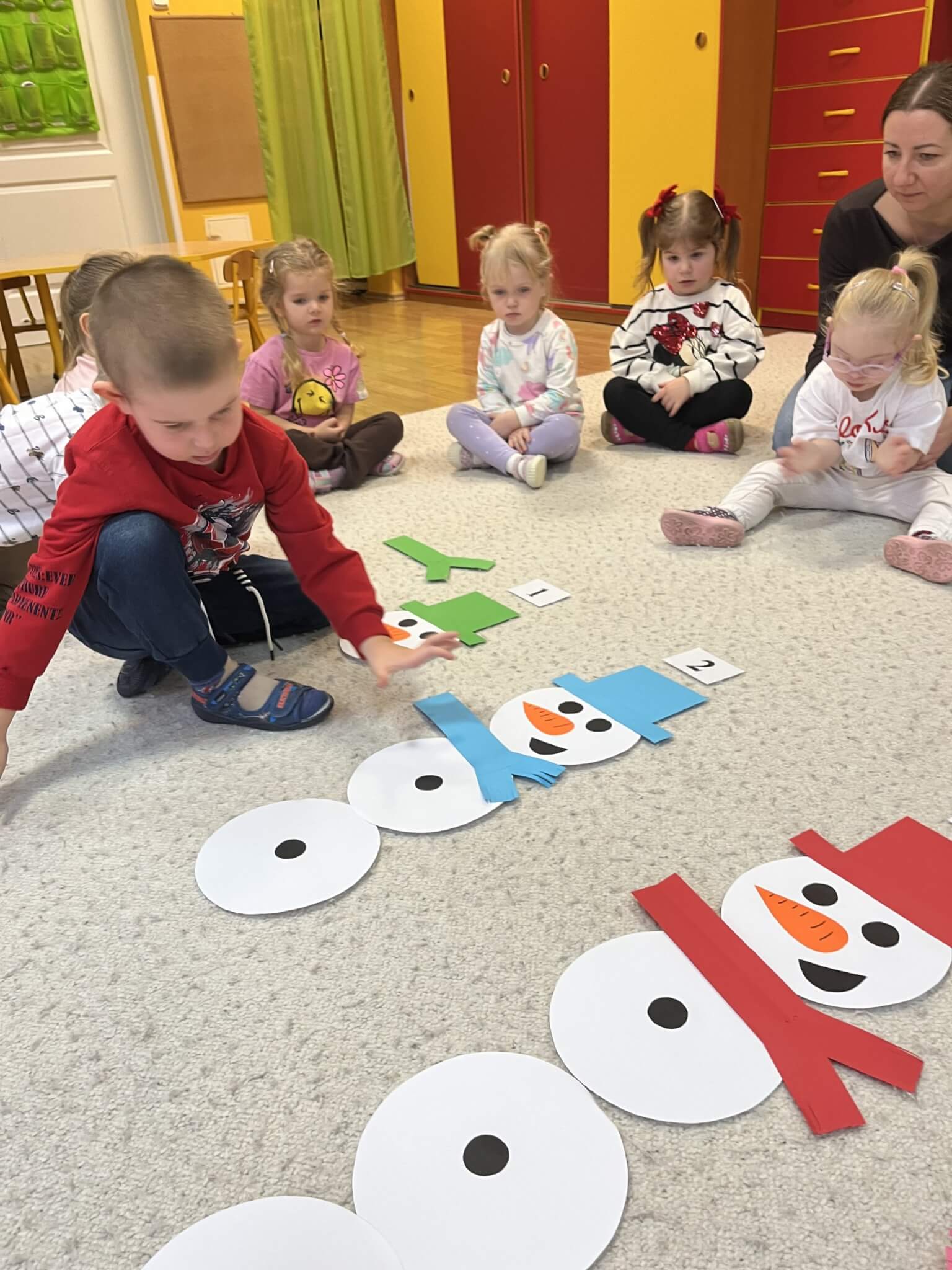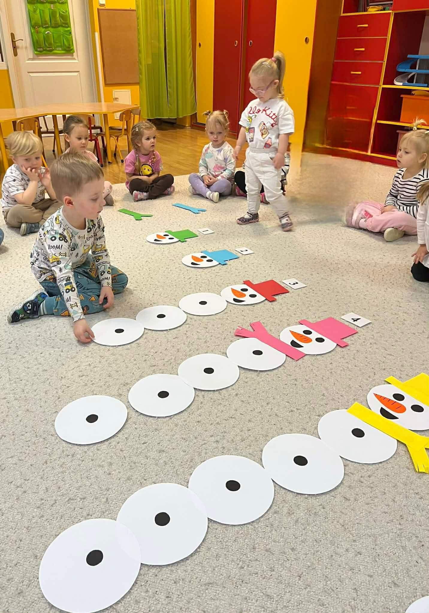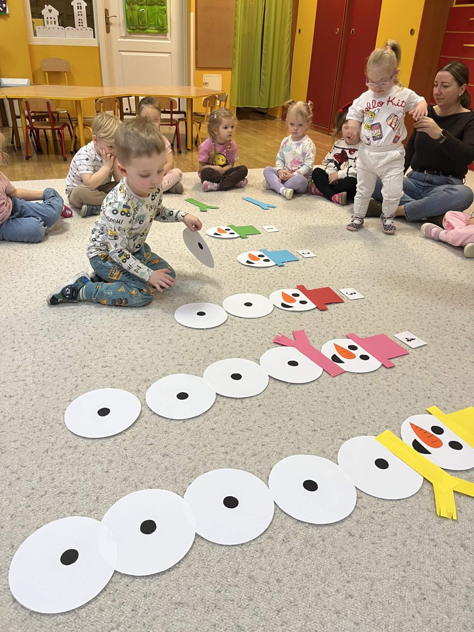 Zima 2026 r. Dzień rozpoczął się radosną zabawą muzyczno–ruchową pt. „Bałwankowa rodzina”, która wprowadziła dzieci w zimowy nastrój i sprzyjała integracji grupy. Dzieci chętnie podejmowały role, odważnie prezentowały się na środku oraz uważnie reagowały na sygnały muzyczne. Następnie podczas zajęć dzieci uczestniczyły w zabawie matematycznej z wykorzystaniem sylwet bałwanków. Przedszkolaki dopasowywały odpowiednią liczbę śniegowych kul do wskazanej cyfry oraz porównywały liczebność zbiorów (więcej, mniej). Na sam koniec zabawy każdy z bałwanków został ubrany w odpowiedni szalik do kompletu. Dzieci odwzorowywały również układy guzików według podanego wzoru. Ćwiczenia rozwijały umiejętność liczenia w zakresie dostosowanym do możliwości dzieci, spostrzegawczość wzrokową, koncentrację oraz logiczne myślenie. Zadania miały formę zabawy, co sprzyjało aktywnemu zaangażowaniu i radości z podejmowanych działań.