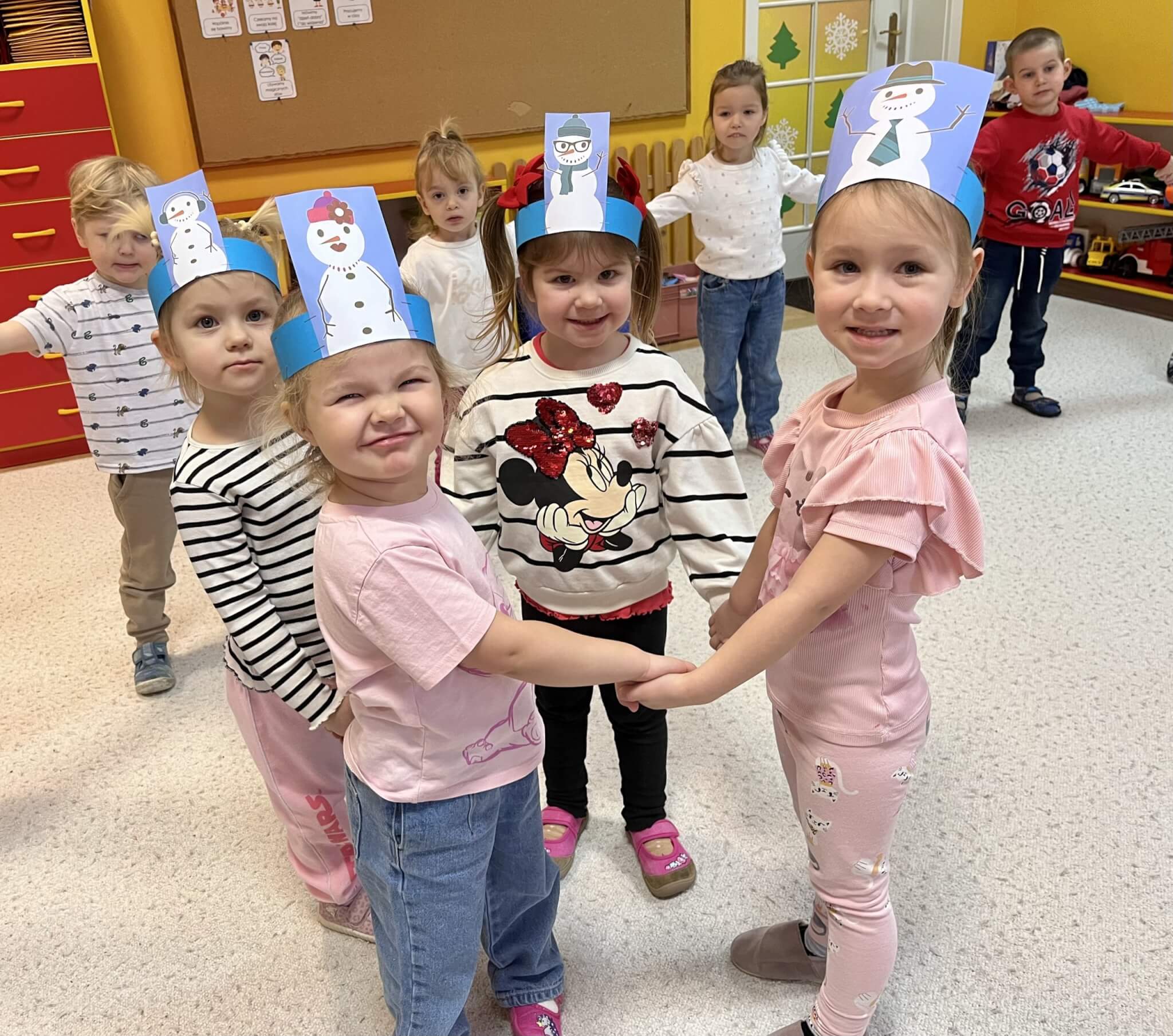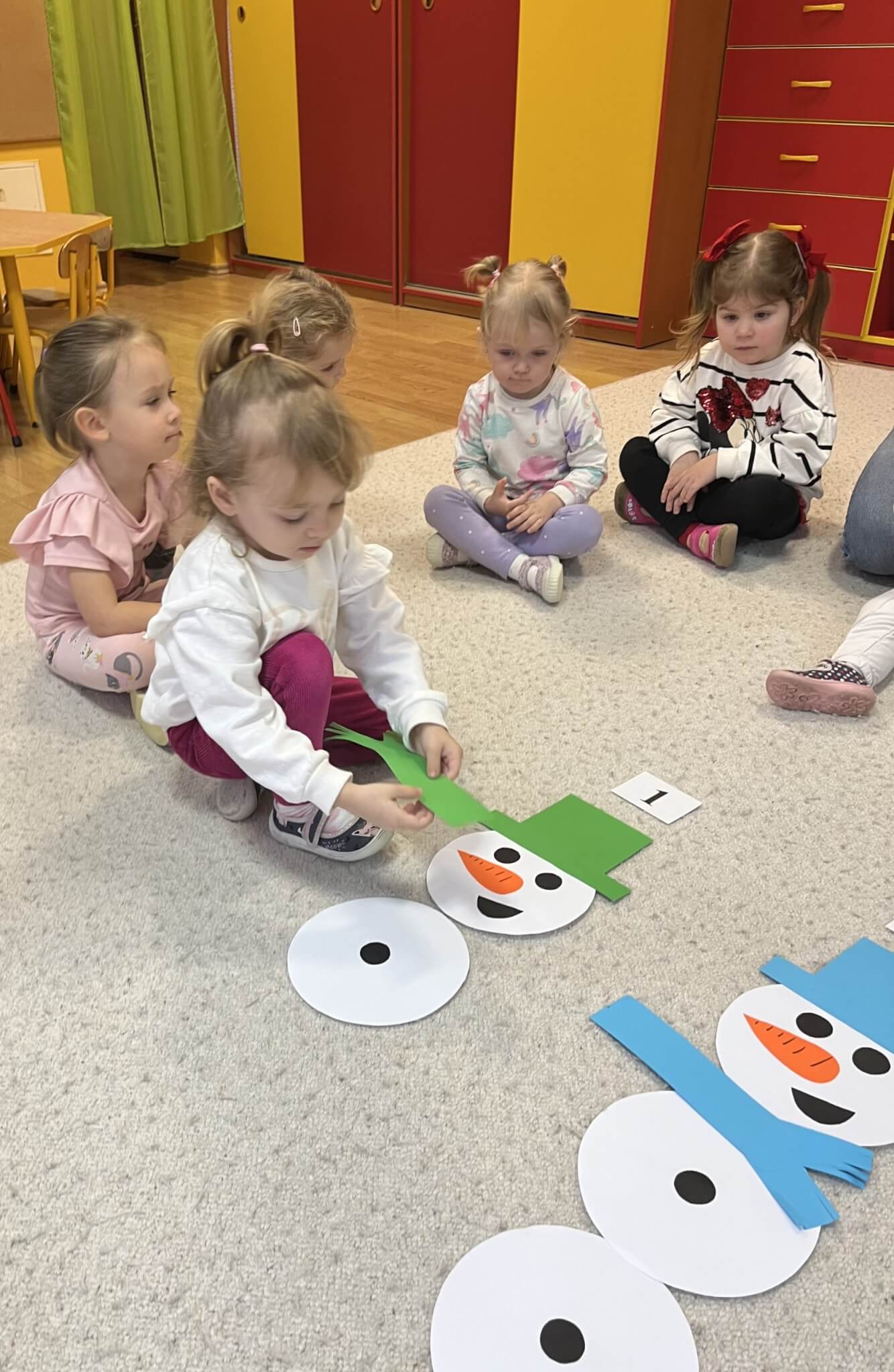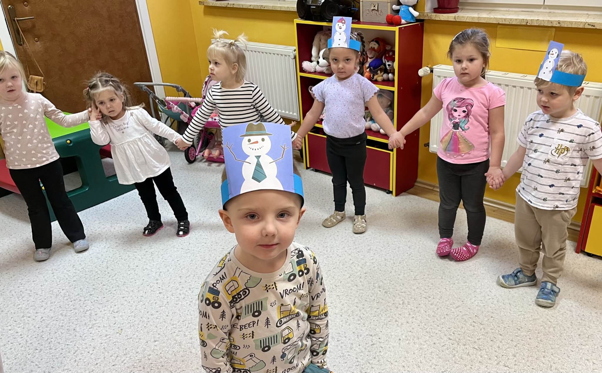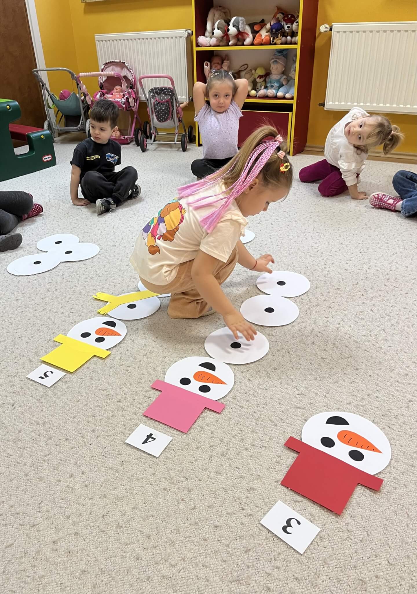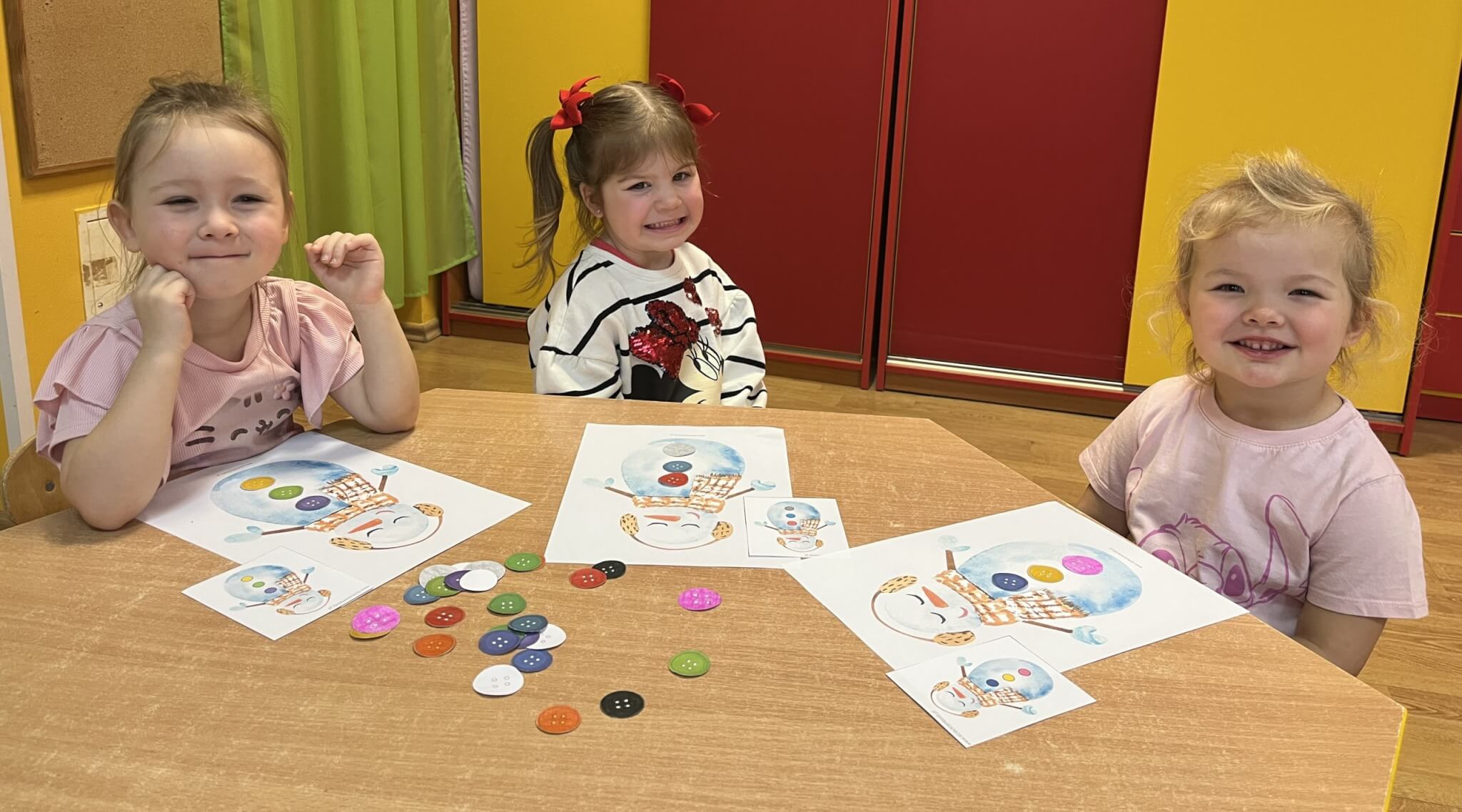 Zima 2026 r. Dzień rozpoczął się radosną zabawą muzyczno–ruchową pt. „Bałwankowa rodzina”, która wprowadziła dzieci w zimowy nastrój i sprzyjała integracji grupy. Dzieci chętnie podejmowały role, odważnie prezentowały się na środku oraz uważnie reagowały na sygnały muzyczne. Następnie podczas zajęć dzieci uczestniczyły w zabawie matematycznej z wykorzystaniem sylwet bałwanków. Przedszkolaki dopasowywały odpowiednią liczbę śniegowych kul do wskazanej cyfry oraz porównywały liczebność zbiorów (więcej, mniej). Na sam koniec zabawy każdy z bałwanków został ubrany w odpowiedni szalik do kompletu. Dzieci odwzorowywały również układy guzików według podanego wzoru. Ćwiczenia rozwijały umiejętność liczenia w zakresie dostosowanym do możliwości dzieci, spostrzegawczość wzrokową, koncentrację oraz logiczne myślenie. Zadania miały formę zabawy, co sprzyjało aktywnemu zaangażowaniu i radości z podejmowanych działań.