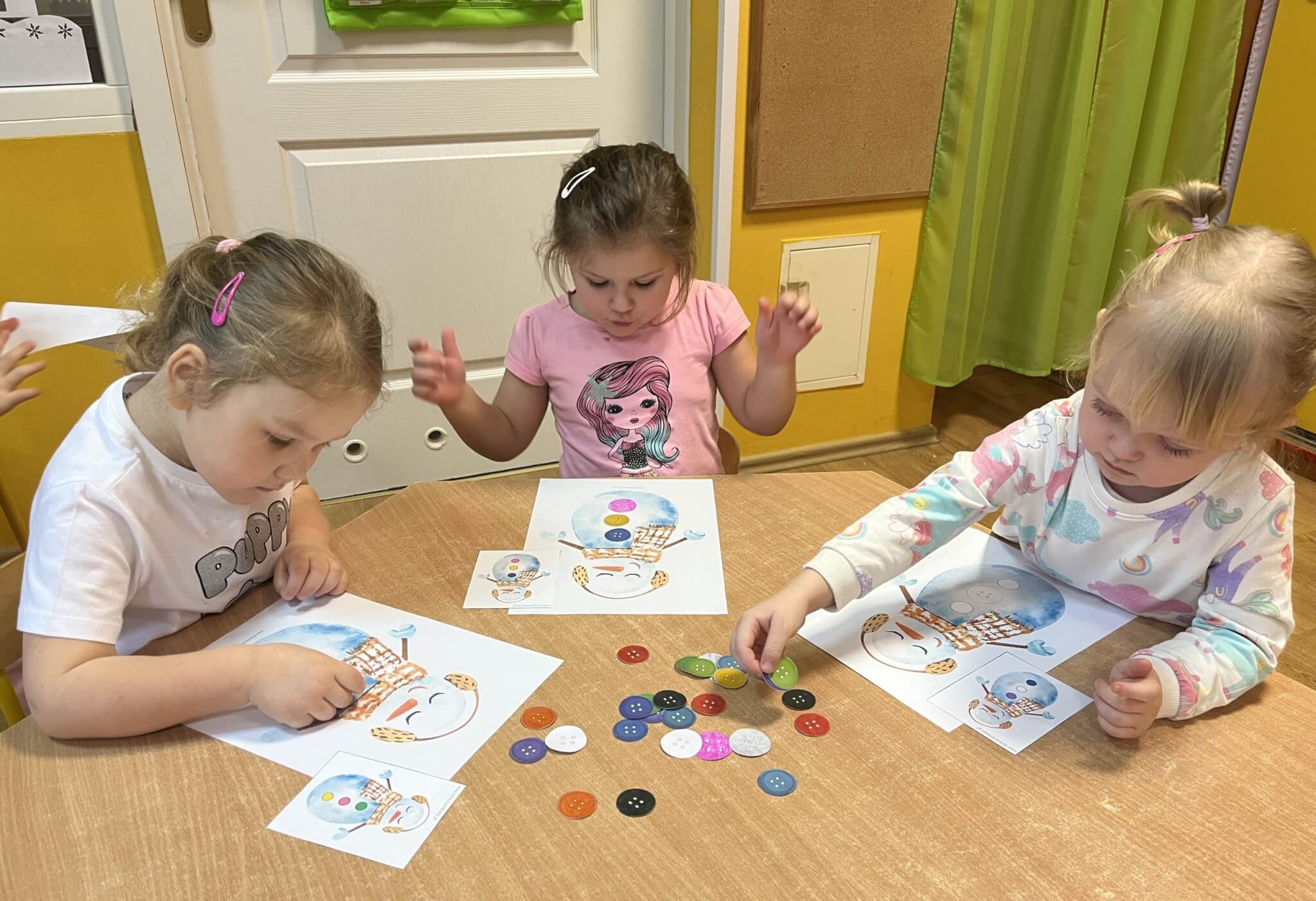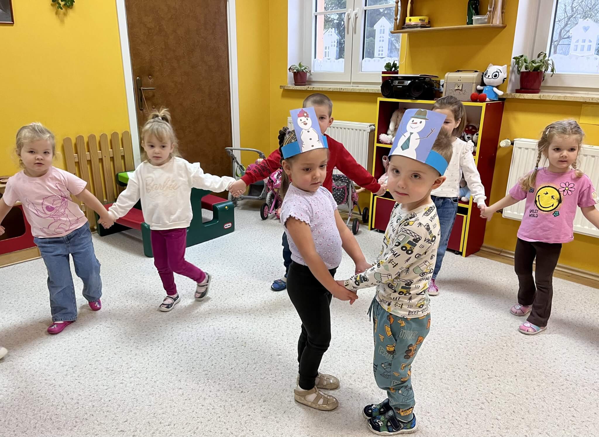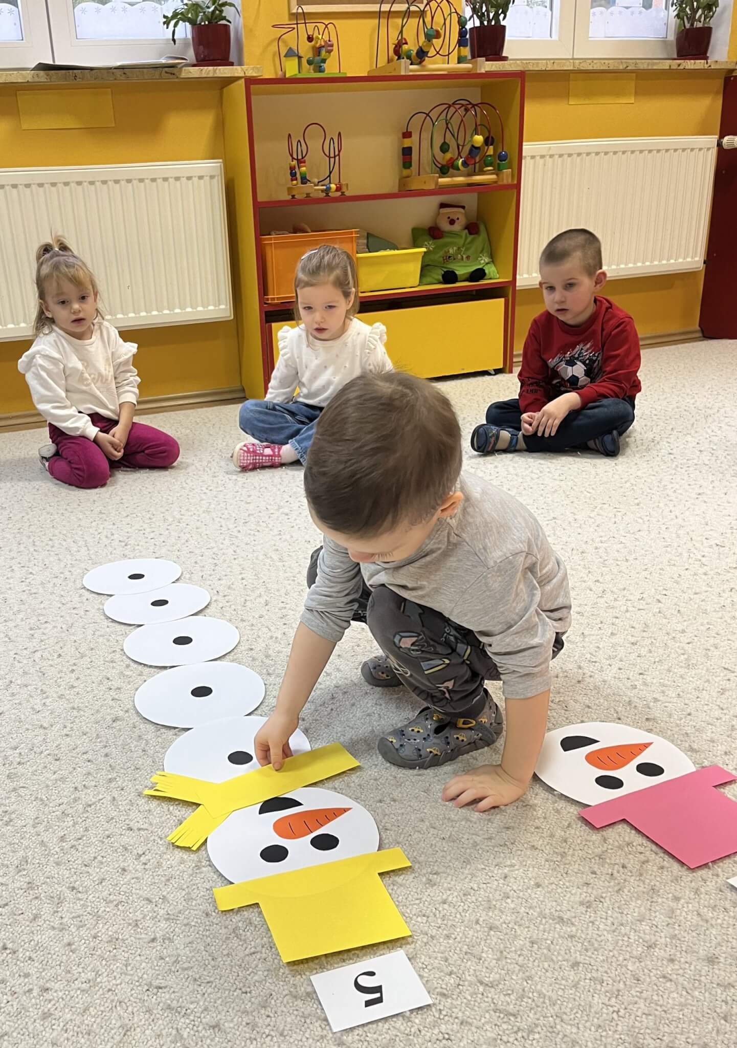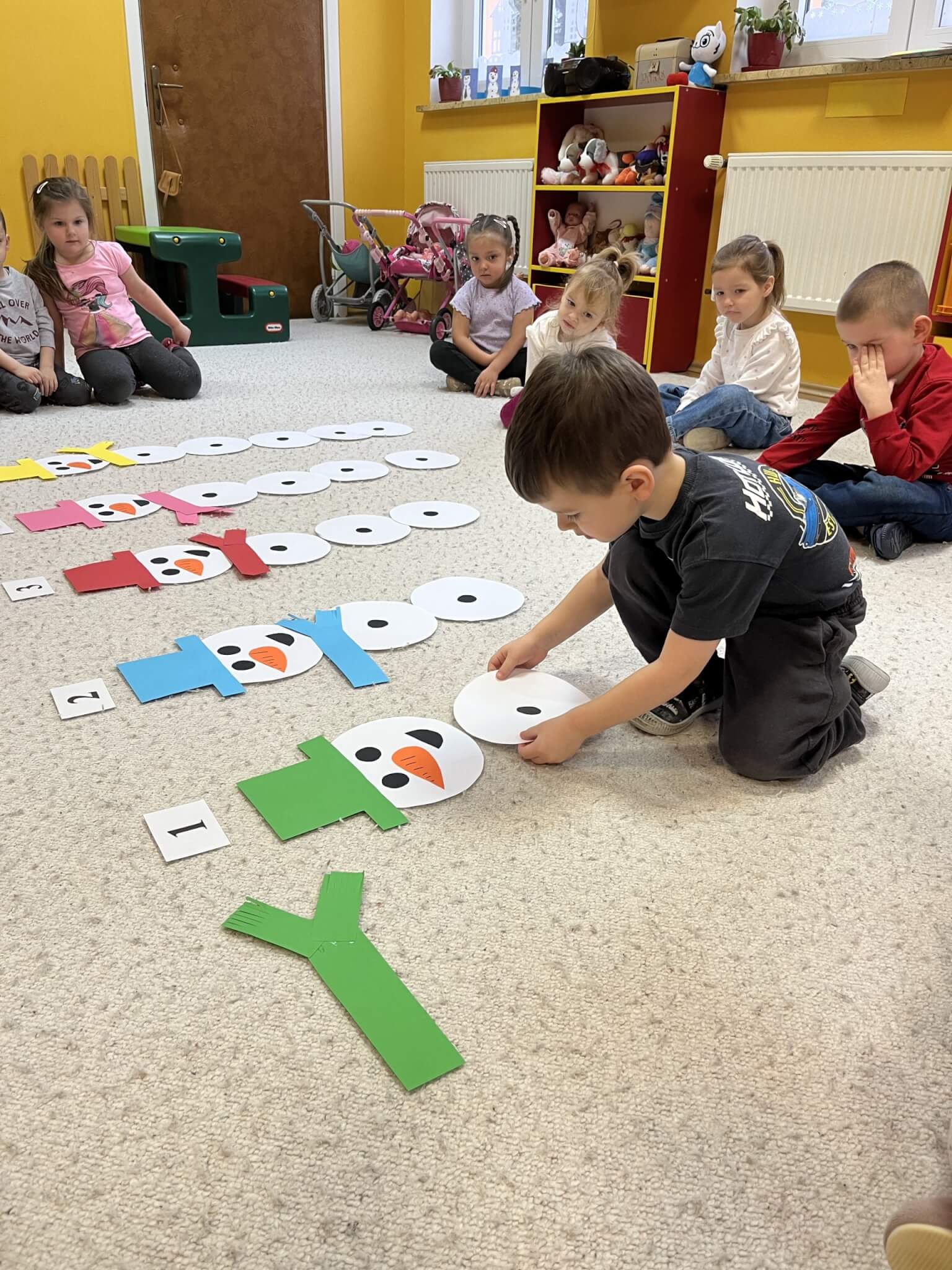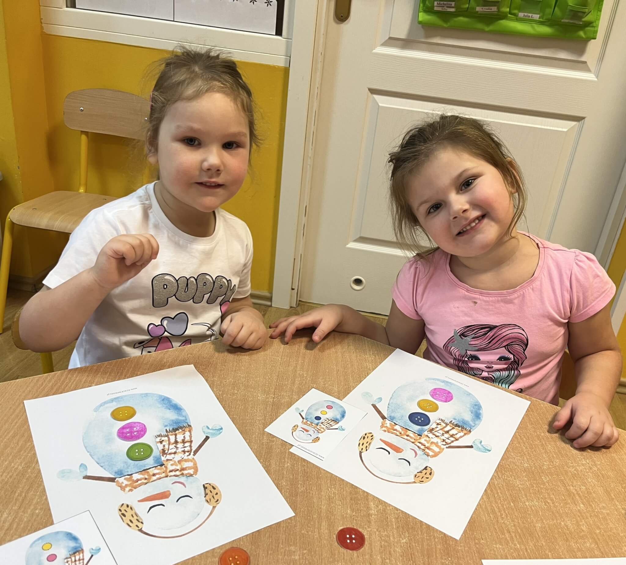 Zima 2026 r. Dzień rozpoczął się radosną zabawą muzyczno–ruchową pt. „Bałwankowa rodzina”, która wprowadziła dzieci w zimowy nastrój i sprzyjała integracji grupy. Dzieci chętnie podejmowały role, odważnie prezentowały się na środku oraz uważnie reagowały na sygnały muzyczne. Następnie podczas zajęć dzieci uczestniczyły w zabawie matematycznej z wykorzystaniem sylwet bałwanków. Przedszkolaki dopasowywały odpowiednią liczbę śniegowych kul do wskazanej cyfry oraz porównywały liczebność zbiorów (więcej, mniej). Na sam koniec zabawy każdy z bałwanków został ubrany w odpowiedni szalik do kompletu. Dzieci odwzorowywały również układy guzików według podanego wzoru. Ćwiczenia rozwijały umiejętność liczenia w zakresie dostosowanym do możliwości dzieci, spostrzegawczość wzrokową, koncentrację oraz logiczne myślenie. Zadania miały formę zabawy, co sprzyjało aktywnemu zaangażowaniu i radości z podejmowanych działań.