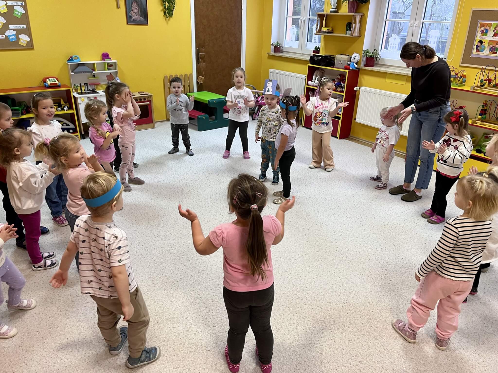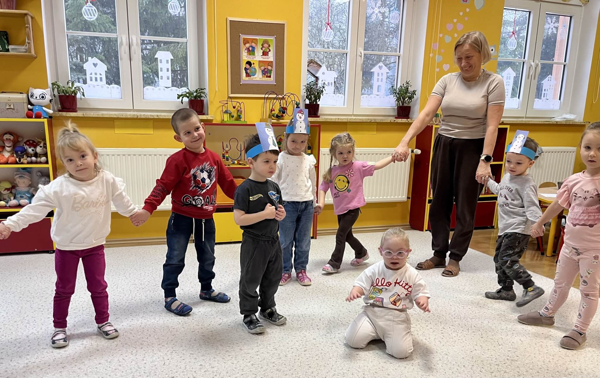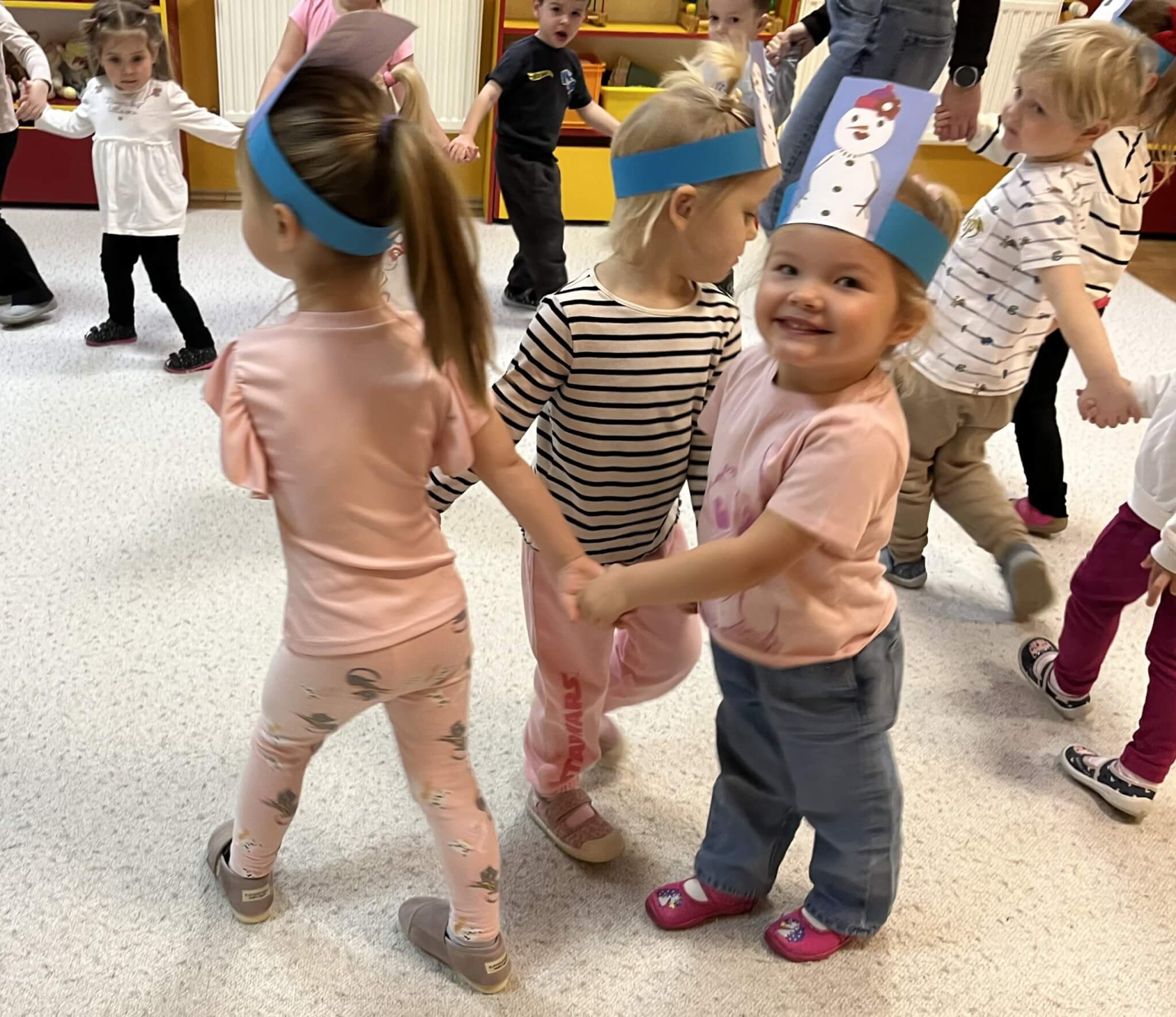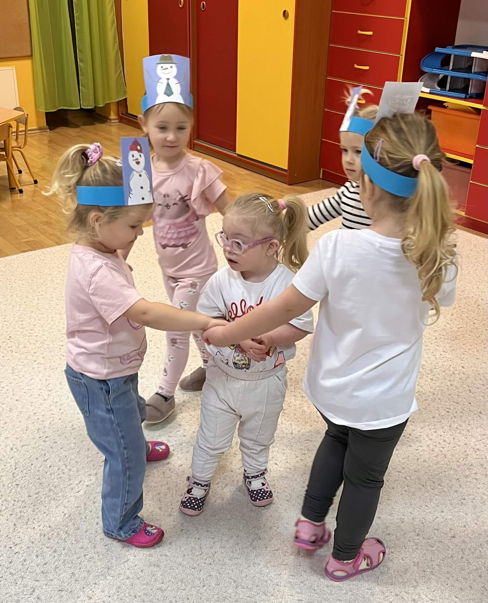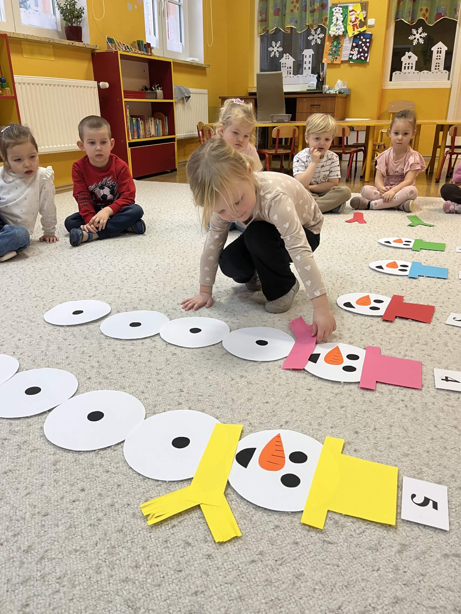 Zima 2026 r. Dzień rozpoczął się radosną zabawą muzyczno–ruchową pt. „Bałwankowa rodzina”, która wprowadziła dzieci w zimowy nastrój i sprzyjała integracji grupy. Dzieci chętnie podejmowały role, odważnie prezentowały się na środku oraz uważnie reagowały na sygnały muzyczne. Następnie podczas zajęć dzieci uczestniczyły w zabawie matematycznej z wykorzystaniem sylwet bałwanków. Przedszkolaki dopasowywały odpowiednią liczbę śniegowych kul do wskazanej cyfry oraz porównywały liczebność zbiorów (więcej, mniej). Na sam koniec zabawy każdy z bałwanków został ubrany w odpowiedni szalik do kompletu. Dzieci odwzorowywały również układy guzików według podanego wzoru. Ćwiczenia rozwijały umiejętność liczenia w zakresie dostosowanym do możliwości dzieci, spostrzegawczość wzrokową, koncentrację oraz logiczne myślenie. Zadania miały formę zabawy, co sprzyjało aktywnemu zaangażowaniu i radości z podejmowanych działań.