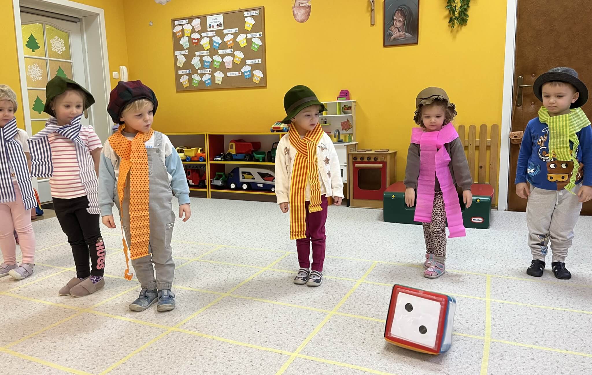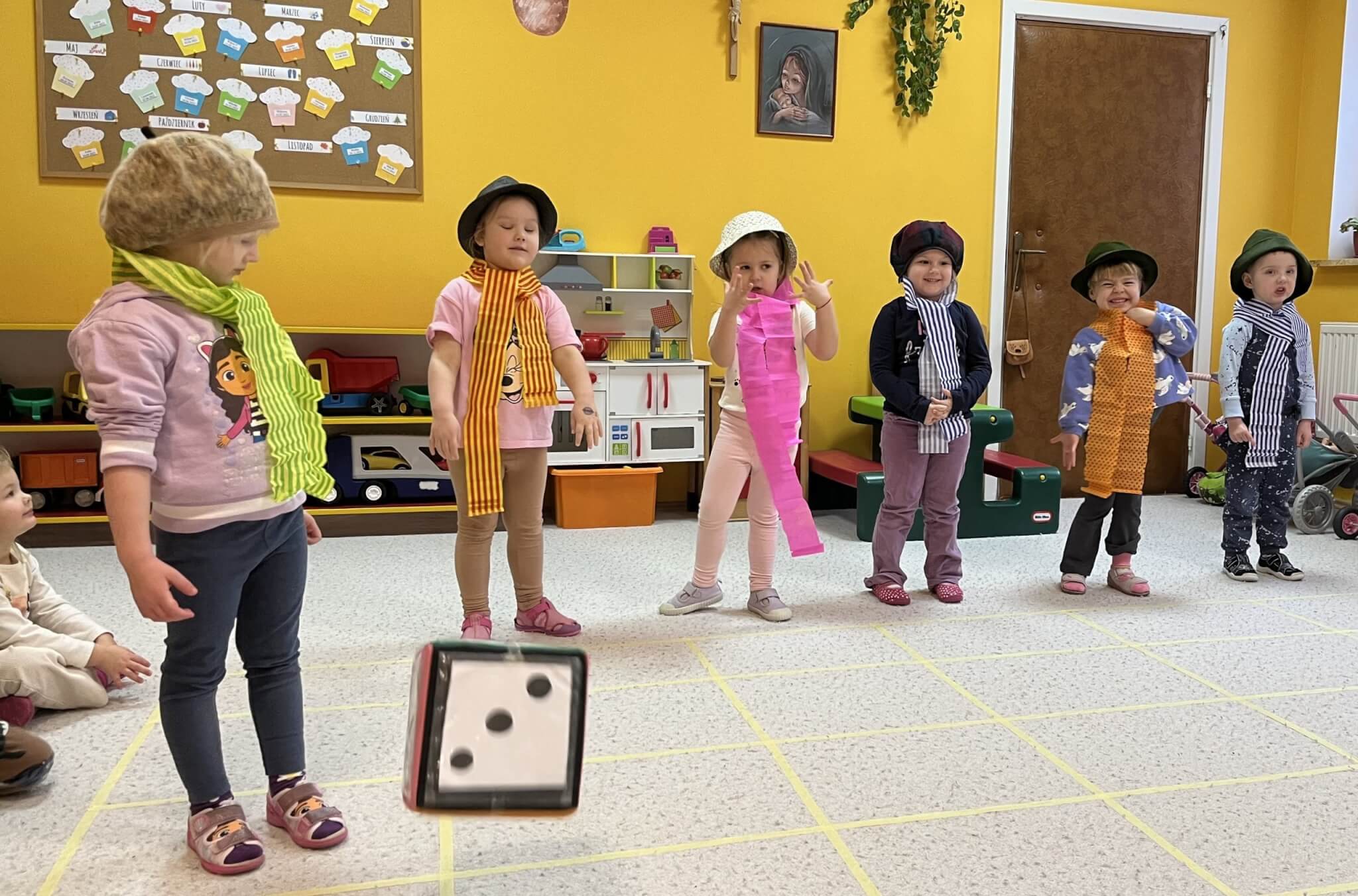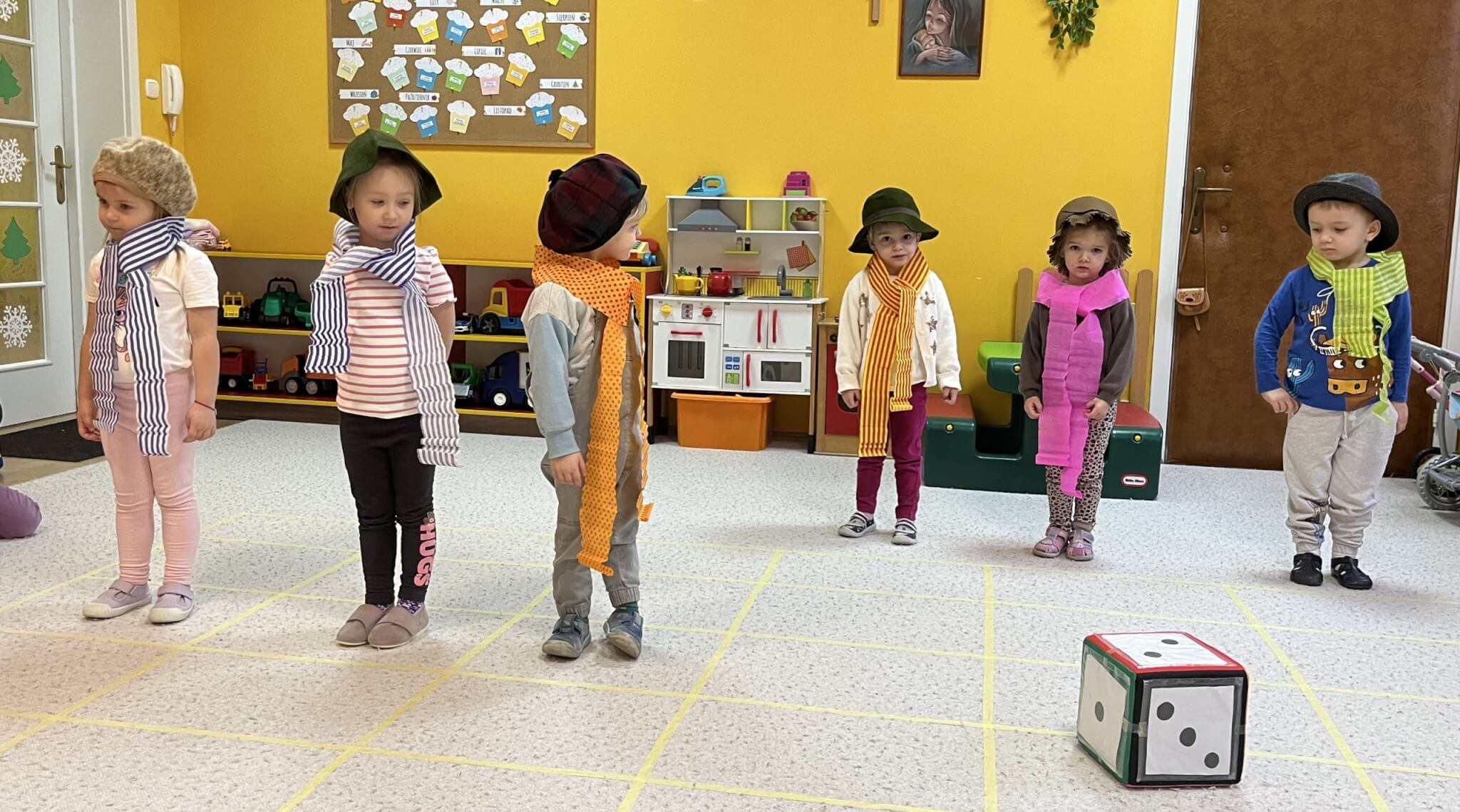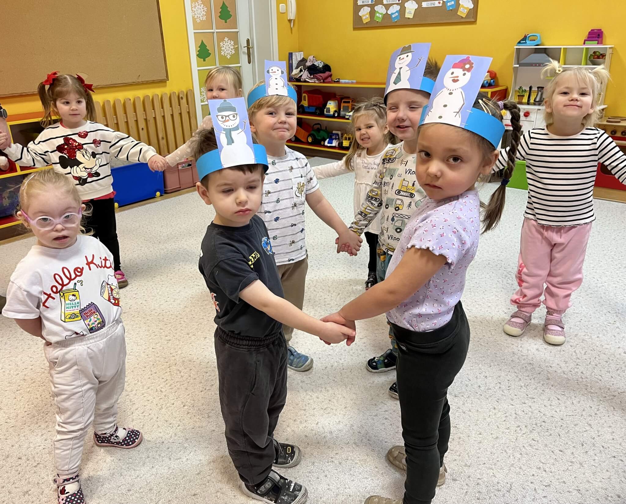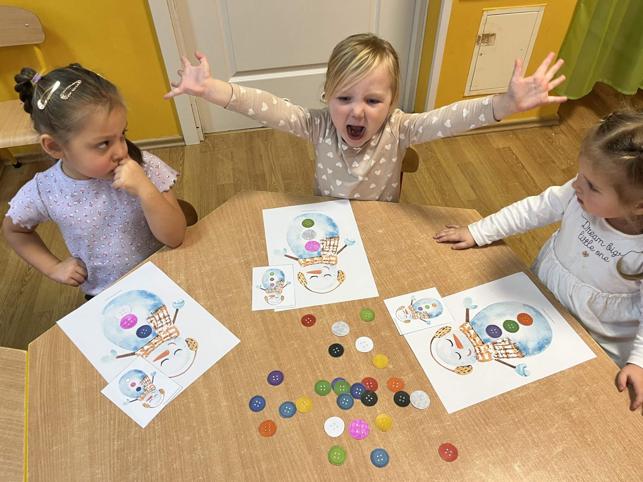 Zima 2026 r. Dzień rozpoczął się radosną zabawą muzyczno–ruchową pt. „Bałwankowa rodzina”, która wprowadziła dzieci w zimowy nastrój i sprzyjała integracji grupy. Dzieci chętnie podejmowały role, odważnie prezentowały się na środku oraz uważnie reagowały na sygnały muzyczne. Następnie podczas zajęć dzieci uczestniczyły w zabawie matematycznej z wykorzystaniem sylwet bałwanków. Przedszkolaki dopasowywały odpowiednią liczbę śniegowych kul do wskazanej cyfry oraz porównywały liczebność zbiorów (więcej, mniej). Na sam koniec zabawy każdy z bałwanków został ubrany w odpowiedni szalik do kompletu. Dzieci odwzorowywały również układy guzików według podanego wzoru. Ćwiczenia rozwijały umiejętność liczenia w zakresie dostosowanym do możliwości dzieci, spostrzegawczość wzrokową, koncentrację oraz logiczne myślenie. Zadania miały formę zabawy, co sprzyjało aktywnemu zaangażowaniu i radości z podejmowanych działań.