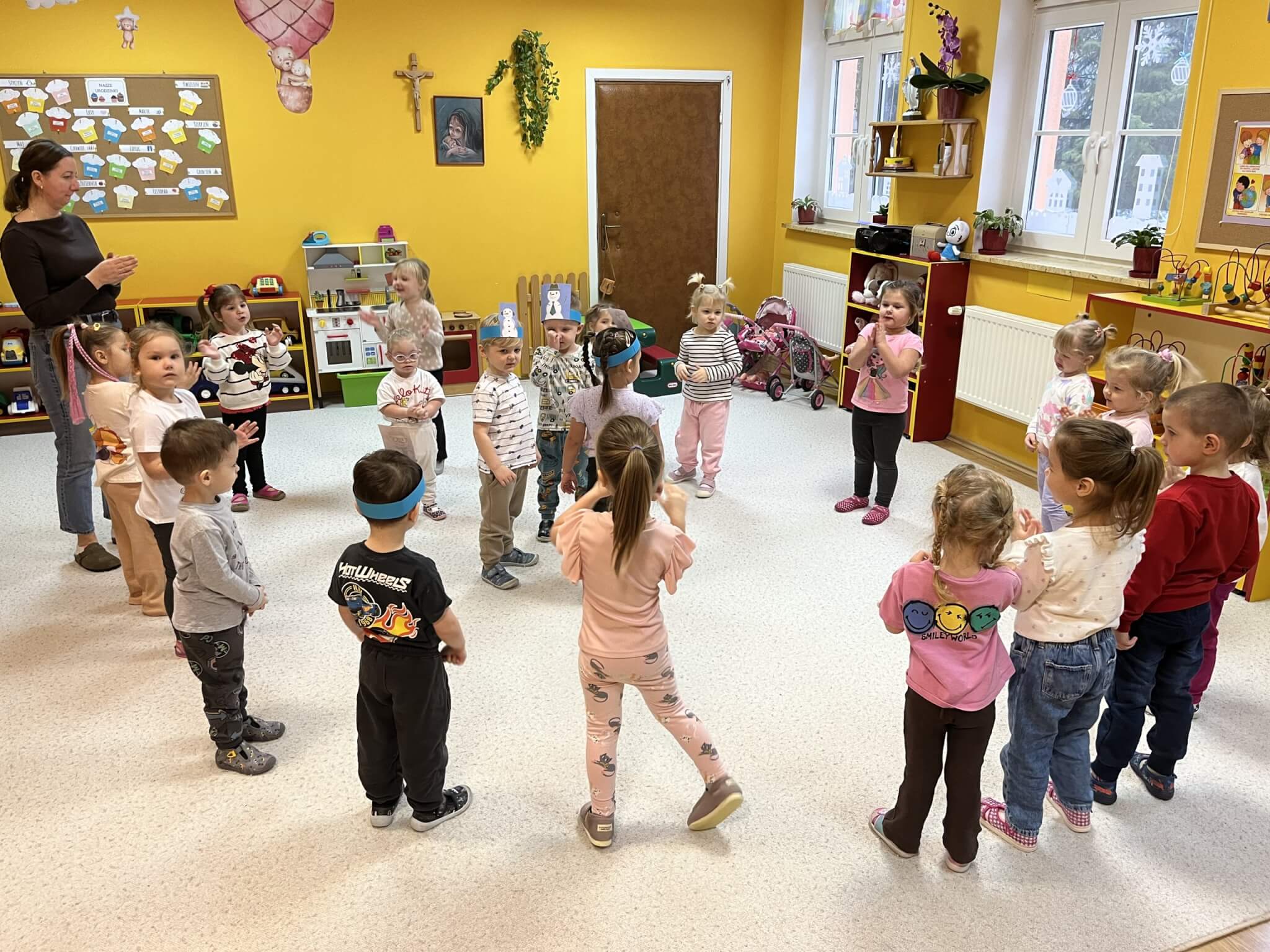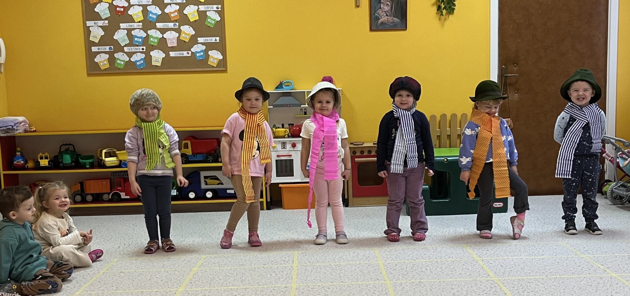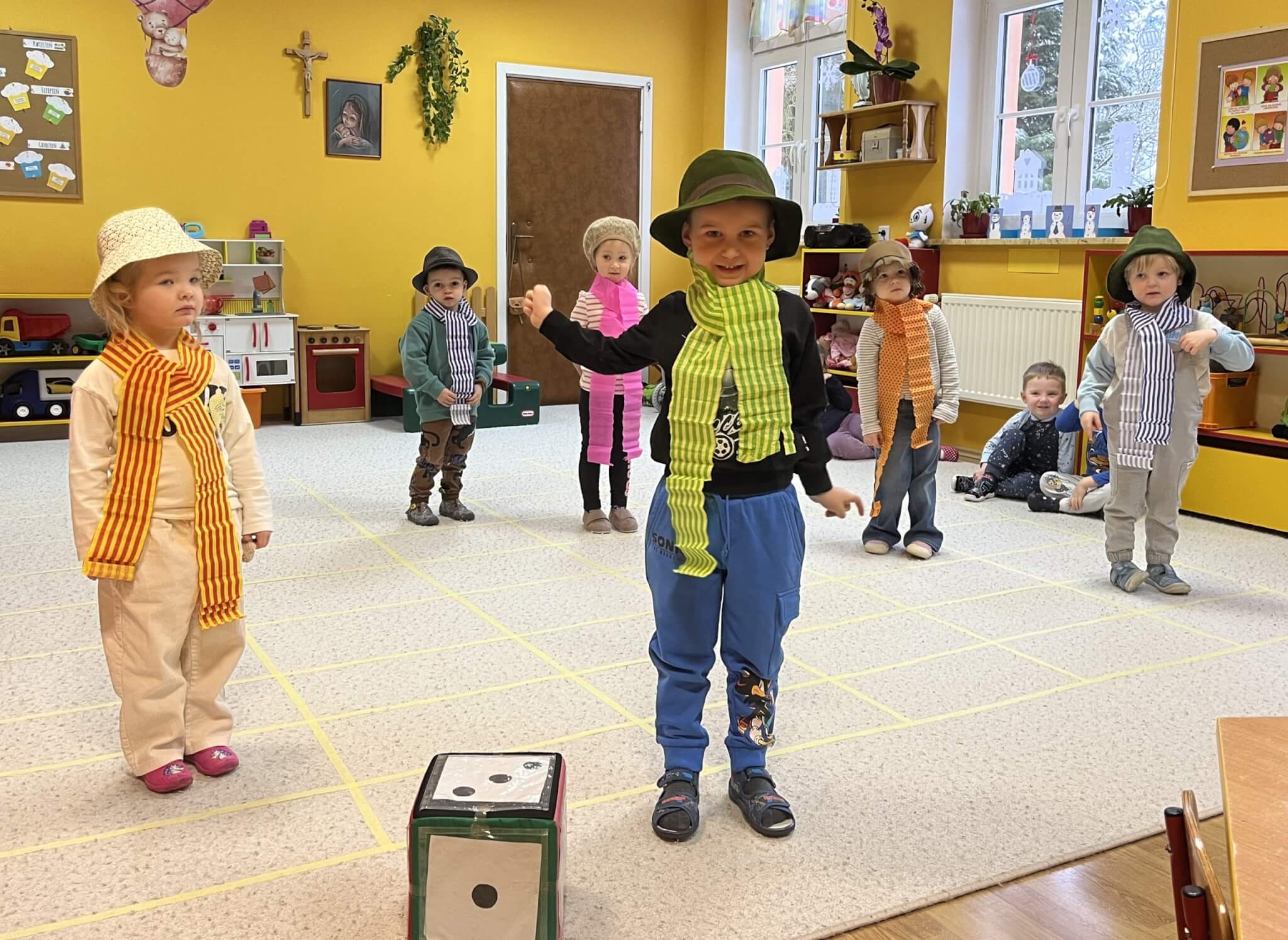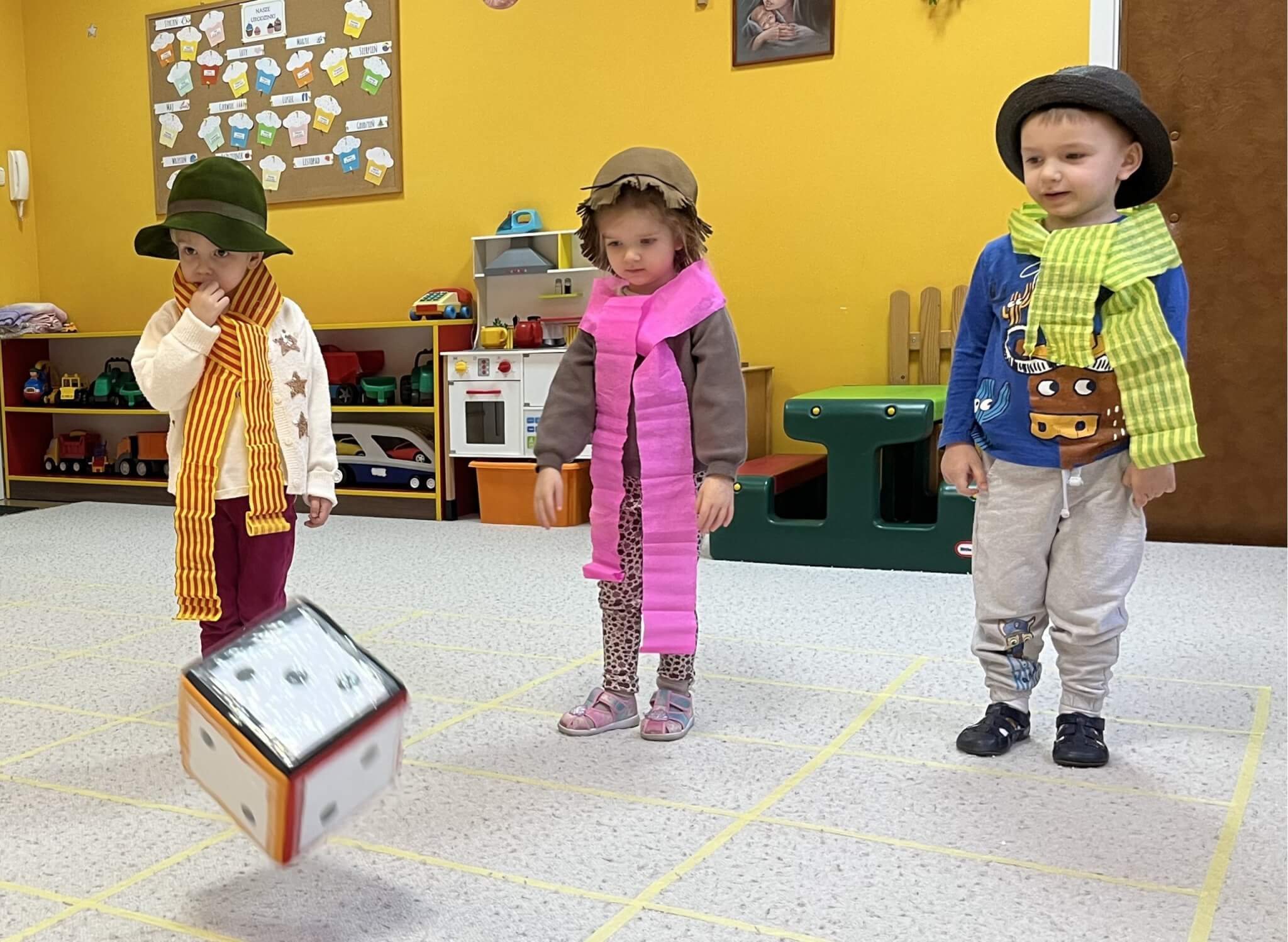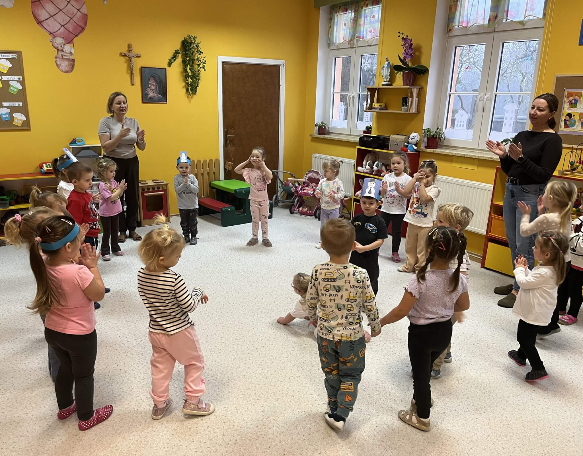 Zima 2026 r. Dzień rozpoczął się radosną zabawą muzyczno–ruchową pt. „Bałwankowa rodzina”, która wprowadziła dzieci w zimowy nastrój i sprzyjała integracji grupy. Dzieci chętnie podejmowały role, odważnie prezentowały się na środku oraz uważnie reagowały na sygnały muzyczne. Następnie podczas zajęć dzieci uczestniczyły w zabawie matematycznej z wykorzystaniem sylwet bałwanków. Przedszkolaki dopasowywały odpowiednią liczbę śniegowych kul do wskazanej cyfry oraz porównywały liczebność zbiorów (więcej, mniej). Na sam koniec zabawy każdy z bałwanków został ubrany w odpowiedni szalik do kompletu. Dzieci odwzorowywały również układy guzików według podanego wzoru. Ćwiczenia rozwijały umiejętność liczenia w zakresie dostosowanym do możliwości dzieci, spostrzegawczość wzrokową, koncentrację oraz logiczne myślenie. Zadania miały formę zabawy, co sprzyjało aktywnemu zaangażowaniu i radości z podejmowanych działań.
