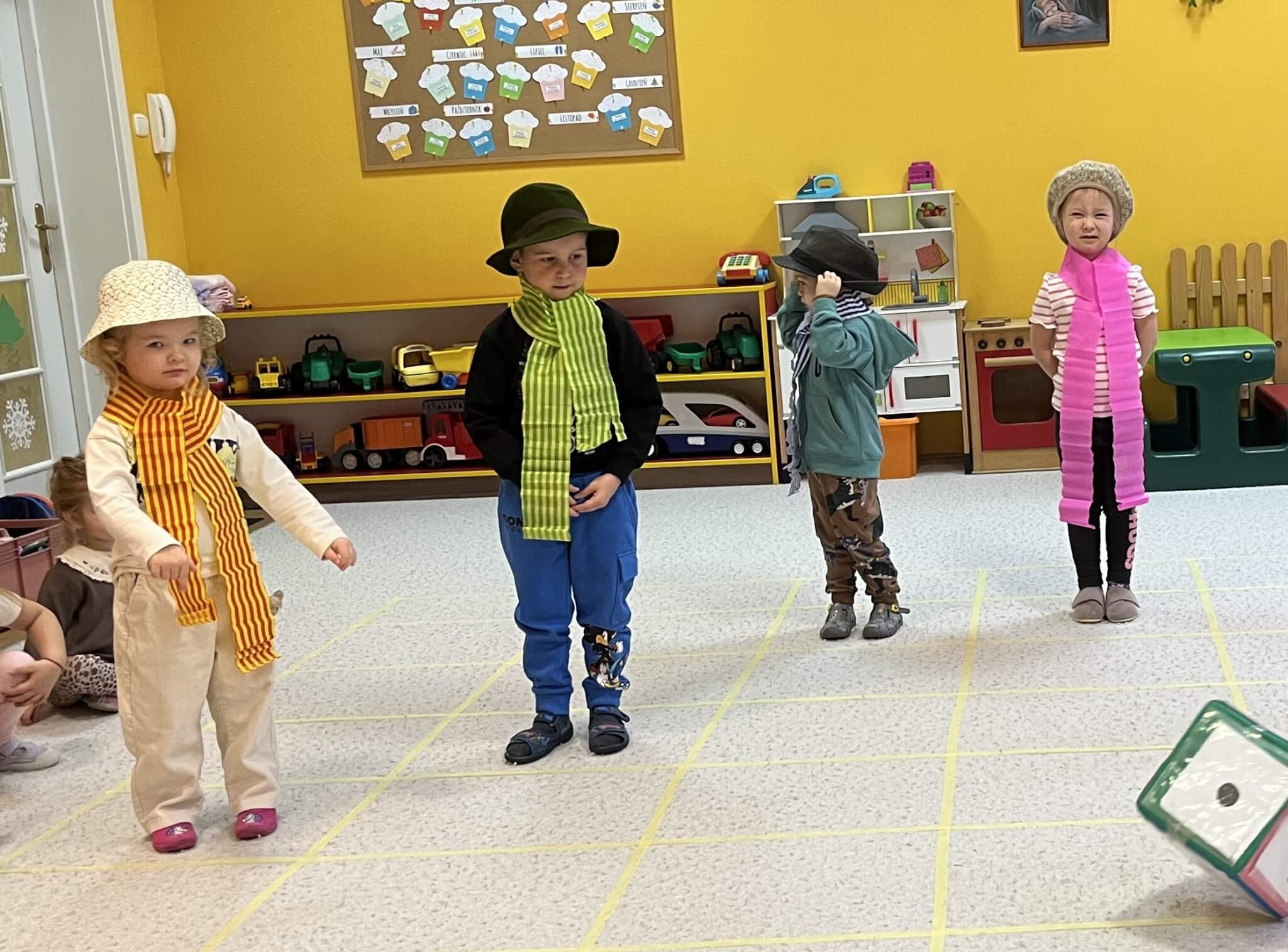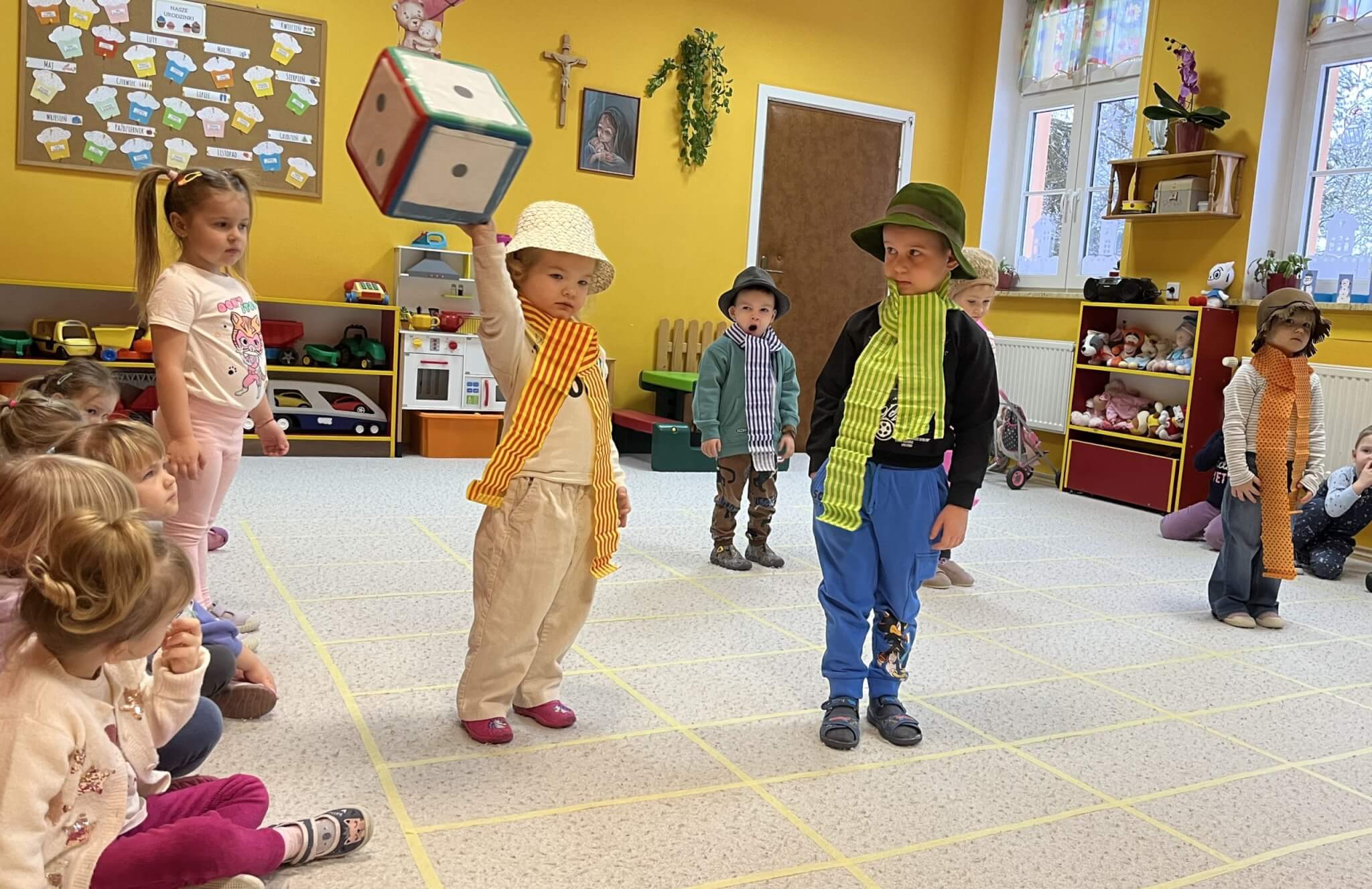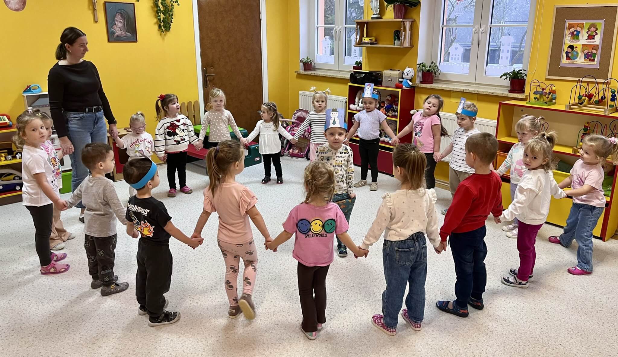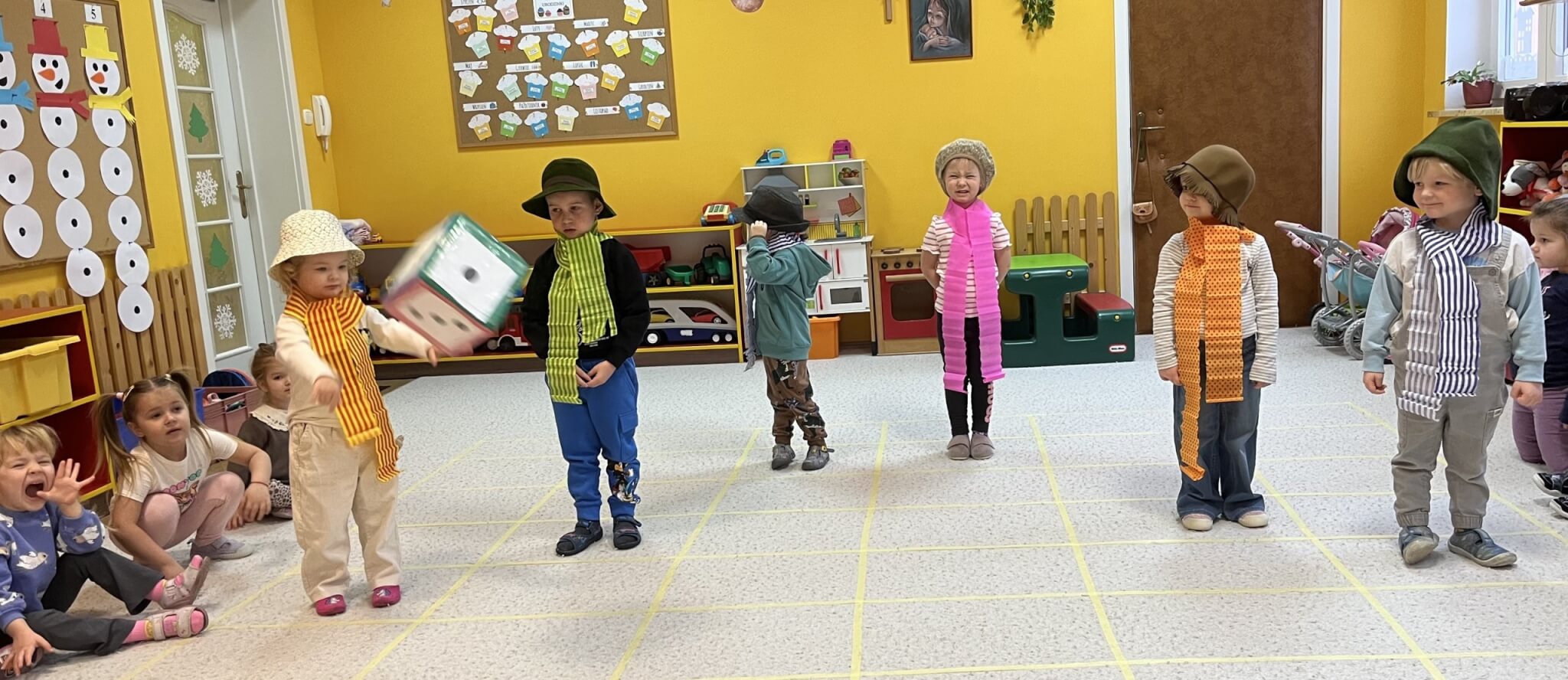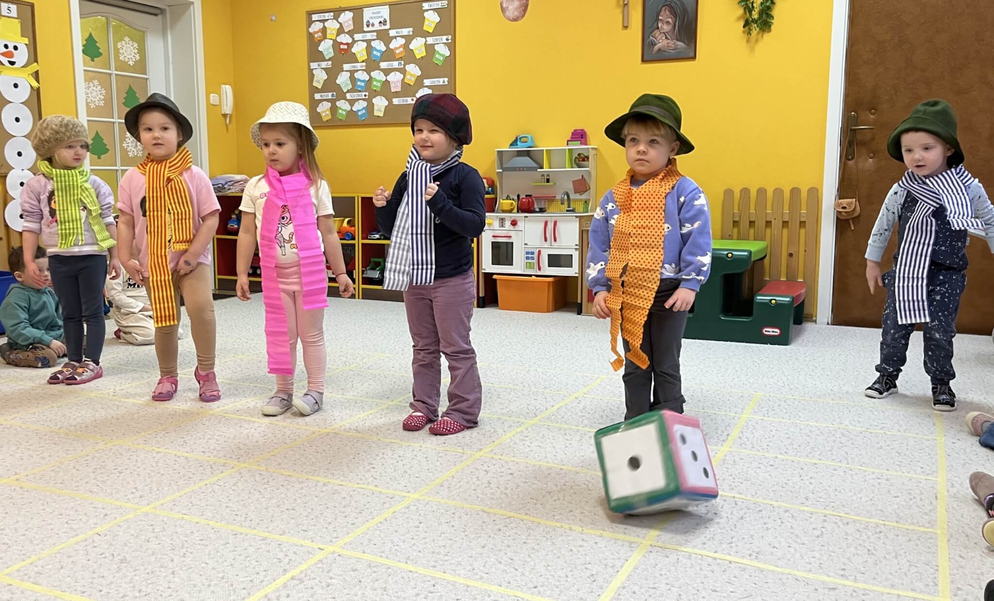 Zima 2026 r. Dzień rozpoczął się radosną zabawą muzyczno–ruchową pt. „Bałwankowa rodzina”, która wprowadziła dzieci w zimowy nastrój i sprzyjała integracji grupy. Dzieci chętnie podejmowały role, odważnie prezentowały się na środku oraz uważnie reagowały na sygnały muzyczne. Następnie podczas zajęć dzieci uczestniczyły w zabawie matematycznej z wykorzystaniem sylwet bałwanków. Przedszkolaki dopasowywały odpowiednią liczbę śniegowych kul do wskazanej cyfry oraz porównywały liczebność zbiorów (więcej, mniej). Na sam koniec zabawy każdy z bałwanków został ubrany w odpowiedni szalik do kompletu. Dzieci odwzorowywały również układy guzików według podanego wzoru. Ćwiczenia rozwijały umiejętność liczenia w zakresie dostosowanym do możliwości dzieci, spostrzegawczość wzrokową, koncentrację oraz logiczne myślenie. Zadania miały formę zabawy, co sprzyjało aktywnemu zaangażowaniu i radości z podejmowanych działań.