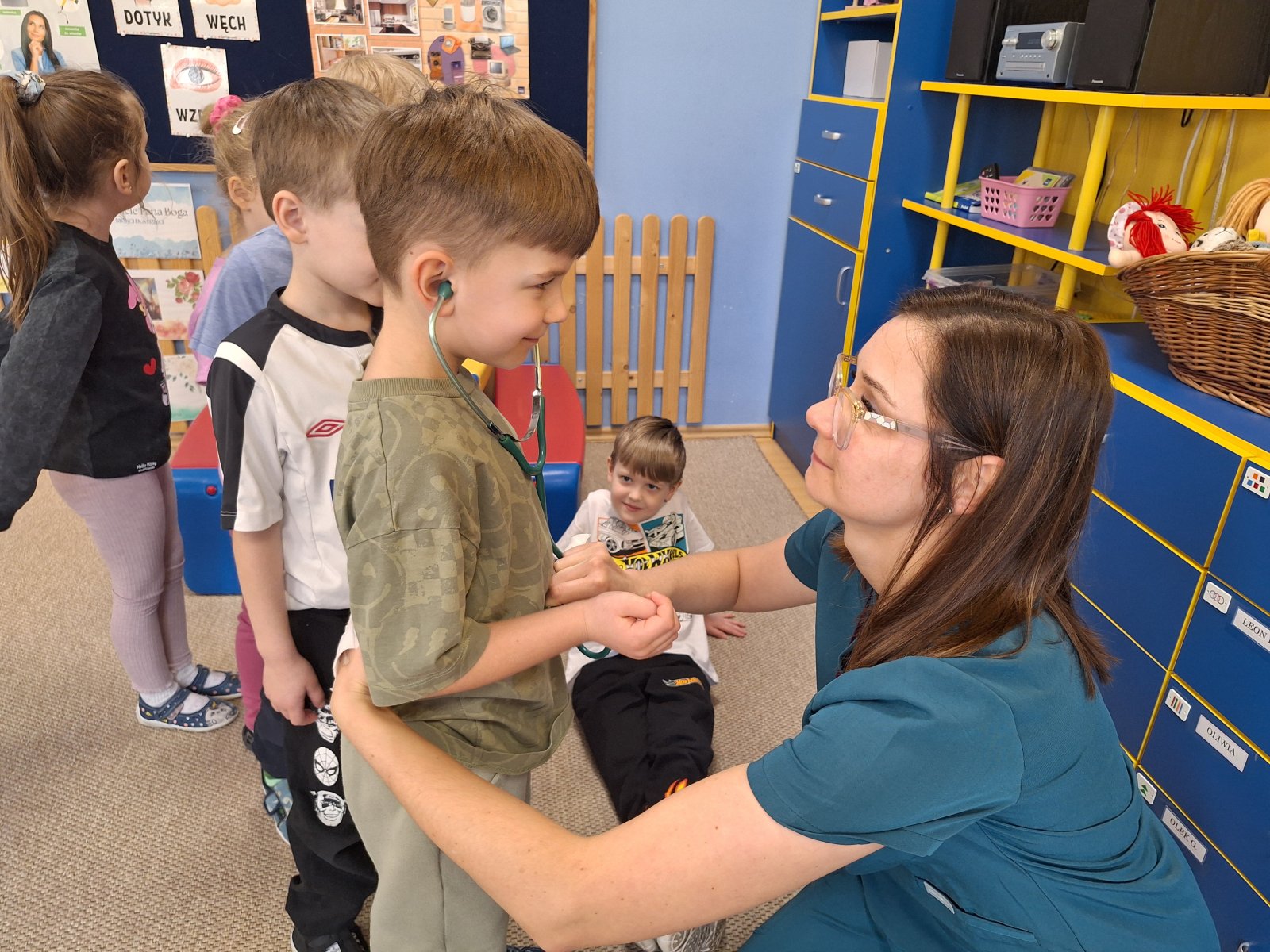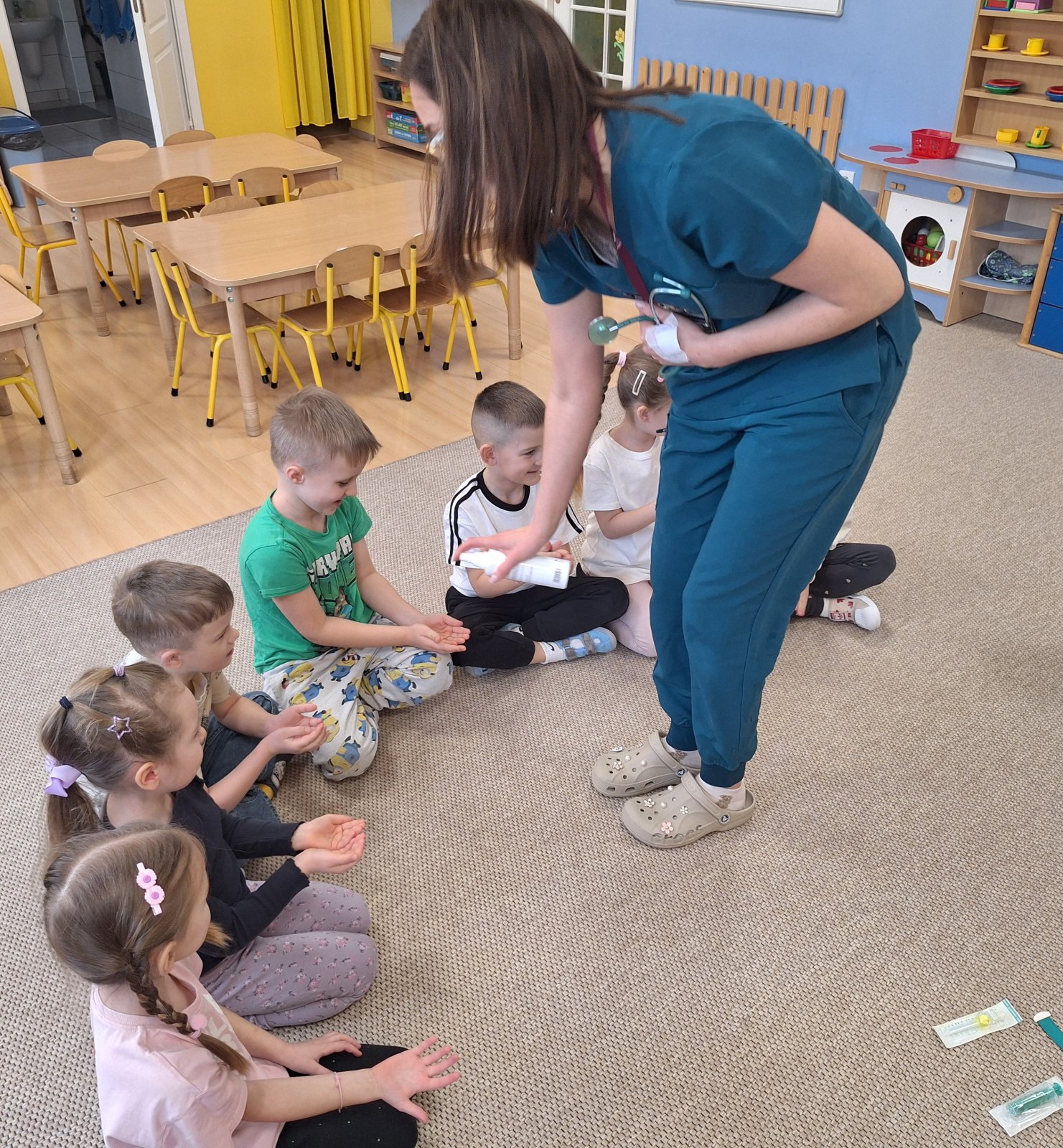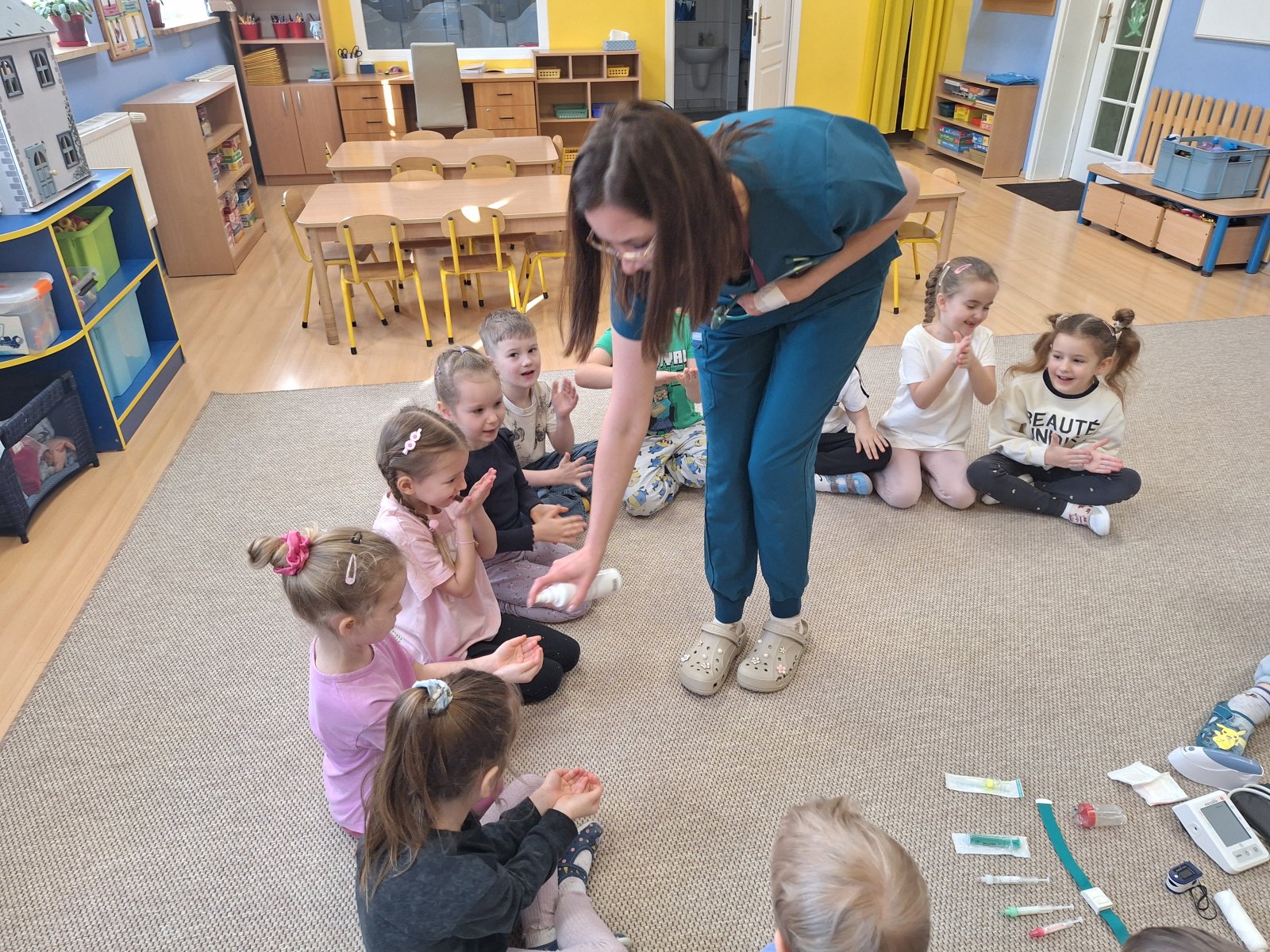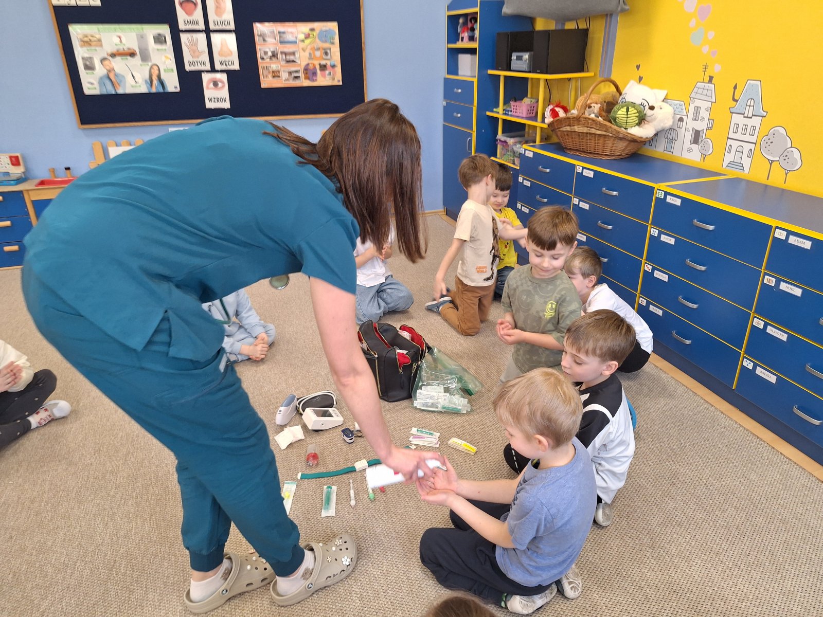 9 marca 2026 r. W poniedziałek grupę „Maków” odwiedziła pani pielęgniarka (mama Leosia). Dzieci miały okazję poznać zawód pielęgniarki oraz dowiedzieć się, na czym polega jej praca. Podczas spotkania pani Magda opowiedziała o swojej codziennej pracy, pokazała podstawowe przyrządy medyczne i wyjaśniła do czego służą. Przedszkolaki z dużym zainteresowaniem słuchały, zadawały pytania oraz chętnie dzieliły się swoimi doświadczeniami związanymi z wizyta u lekarza. To spotkanie pomogło dzieciom lepiej zrozumieć, jak ważna jest praca osoby dbającej o nasze zdrowie. Serdecznie dziękujemy za poświęcony czas, ciekawe spotkanie i przybliżenie dzieciom tak ważnego zawodu.