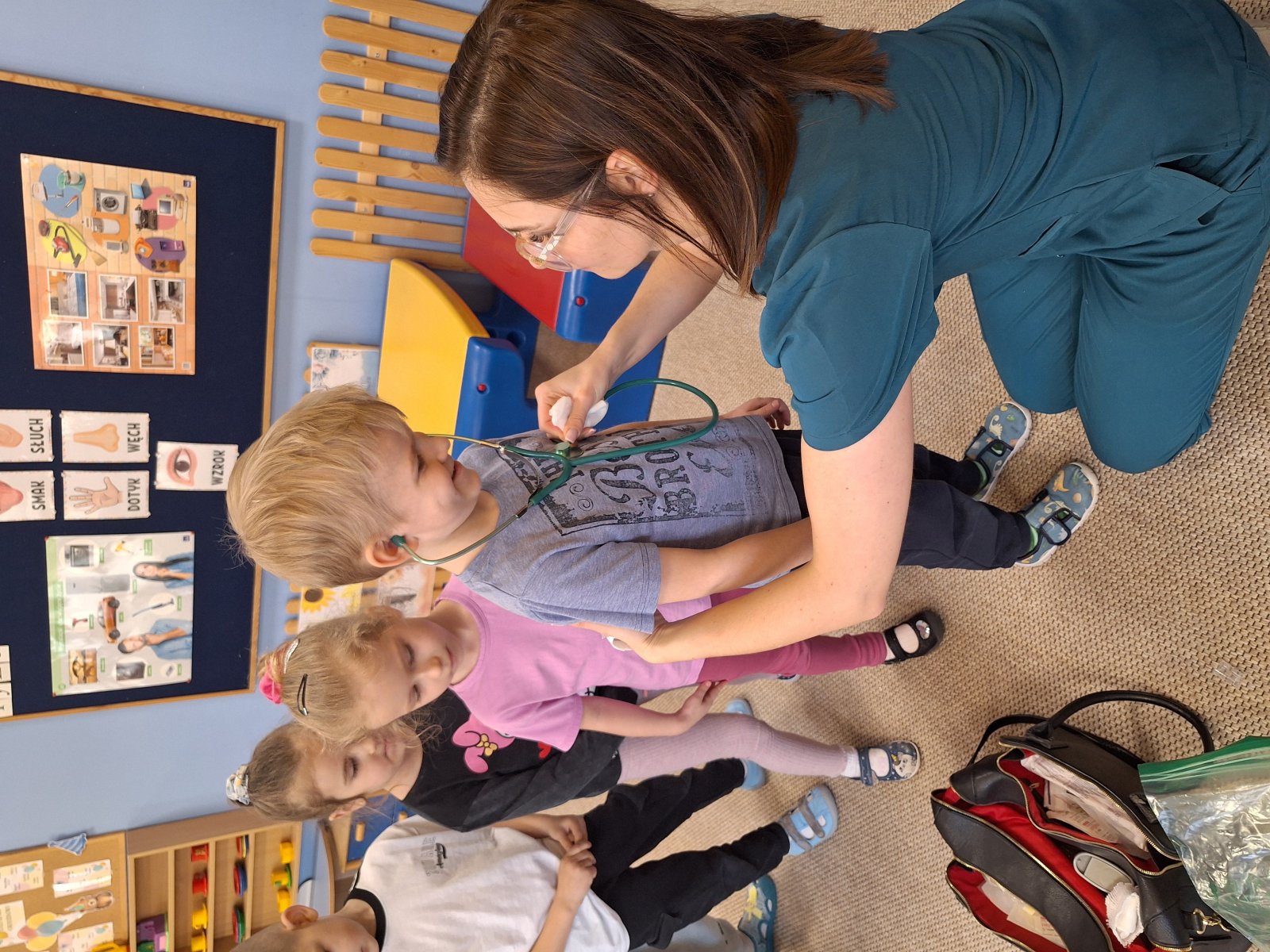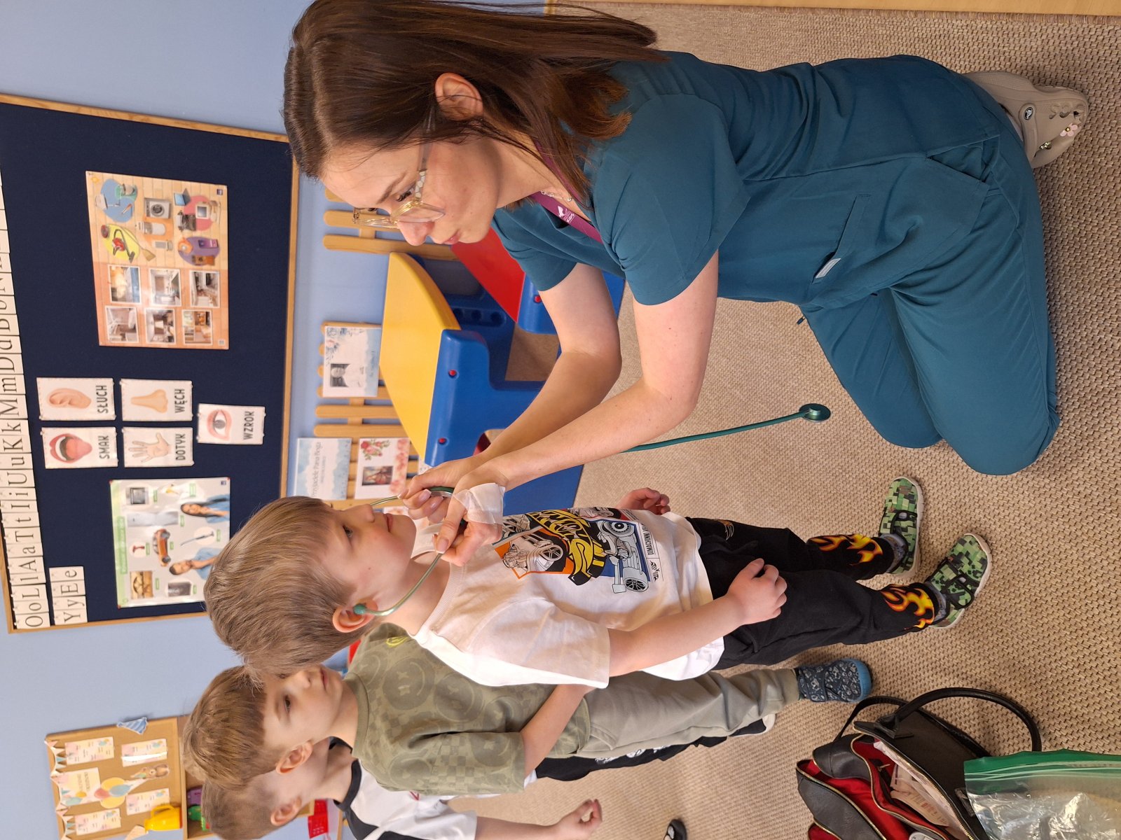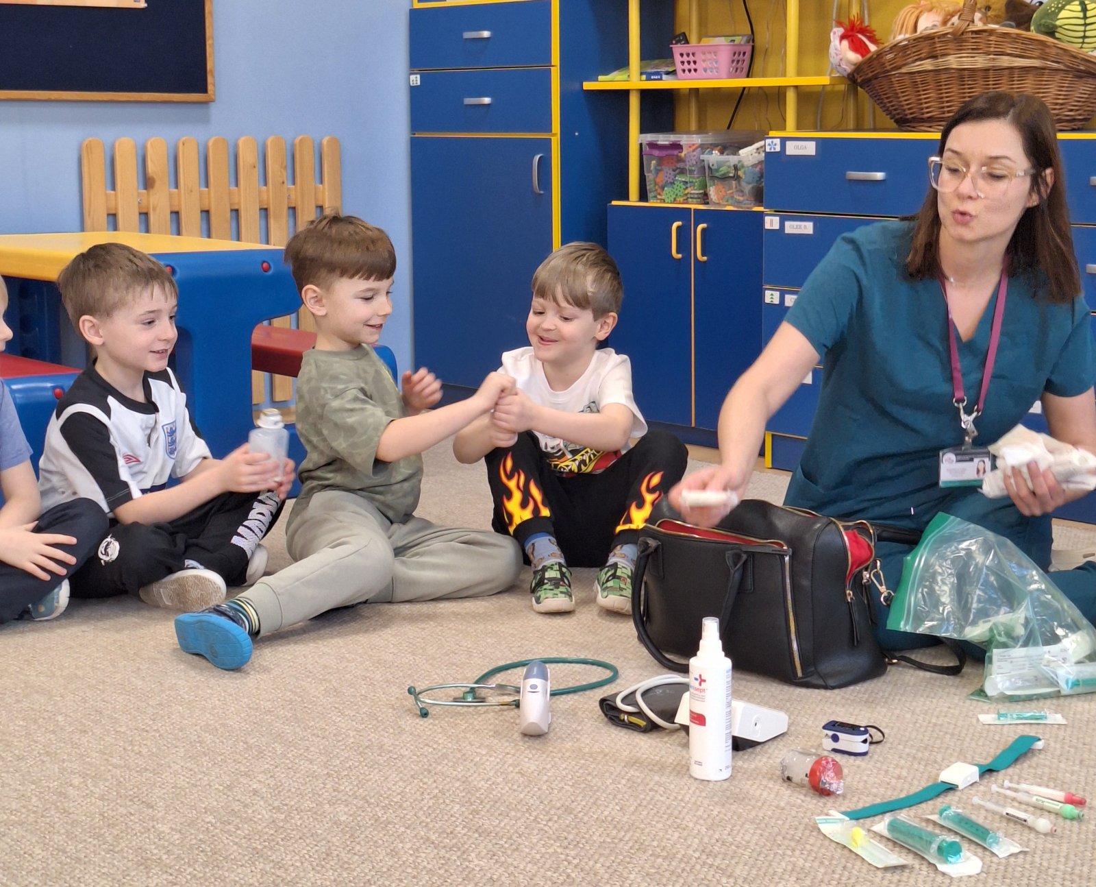 9 marca 2026 r. W poniedziałek grupę „Maków” odwiedziła pani pielęgniarka (mama Leosia). Dzieci miały okazję poznać zawód pielęgniarki oraz dowiedzieć się, na czym polega jej praca. Podczas spotkania pani Magda opowiedziała o swojej codziennej pracy, pokazała podstawowe przyrządy medyczne i wyjaśniła do czego służą. Przedszkolaki z dużym zainteresowaniem słuchały, zadawały pytania oraz chętnie dzieliły się swoimi doświadczeniami związanymi z wizyta u lekarza. To spotkanie pomogło dzieciom lepiej zrozumieć, jak ważna jest praca osoby dbającej o nasze zdrowie. Serdecznie dziękujemy za poświęcony czas, ciekawe spotkanie i przybliżenie dzieciom tak ważnego zawodu.