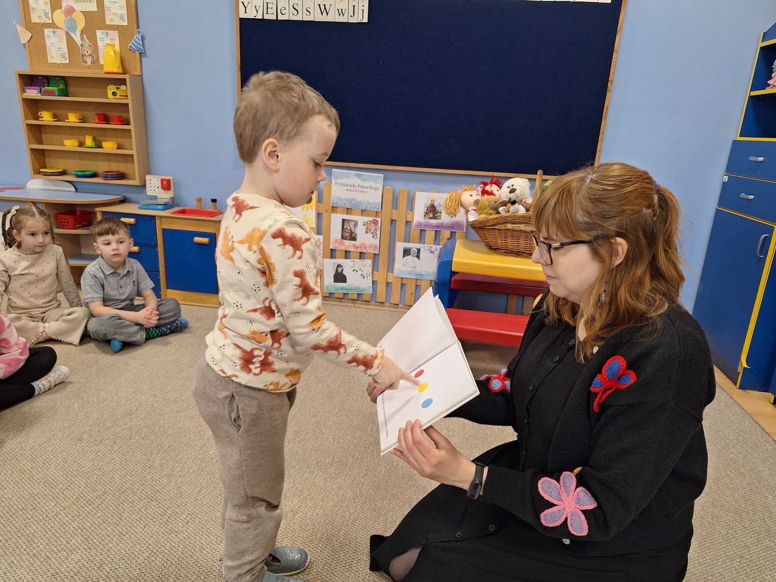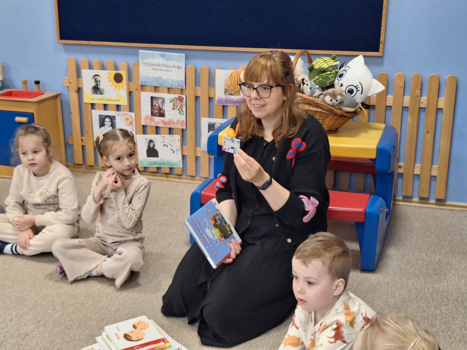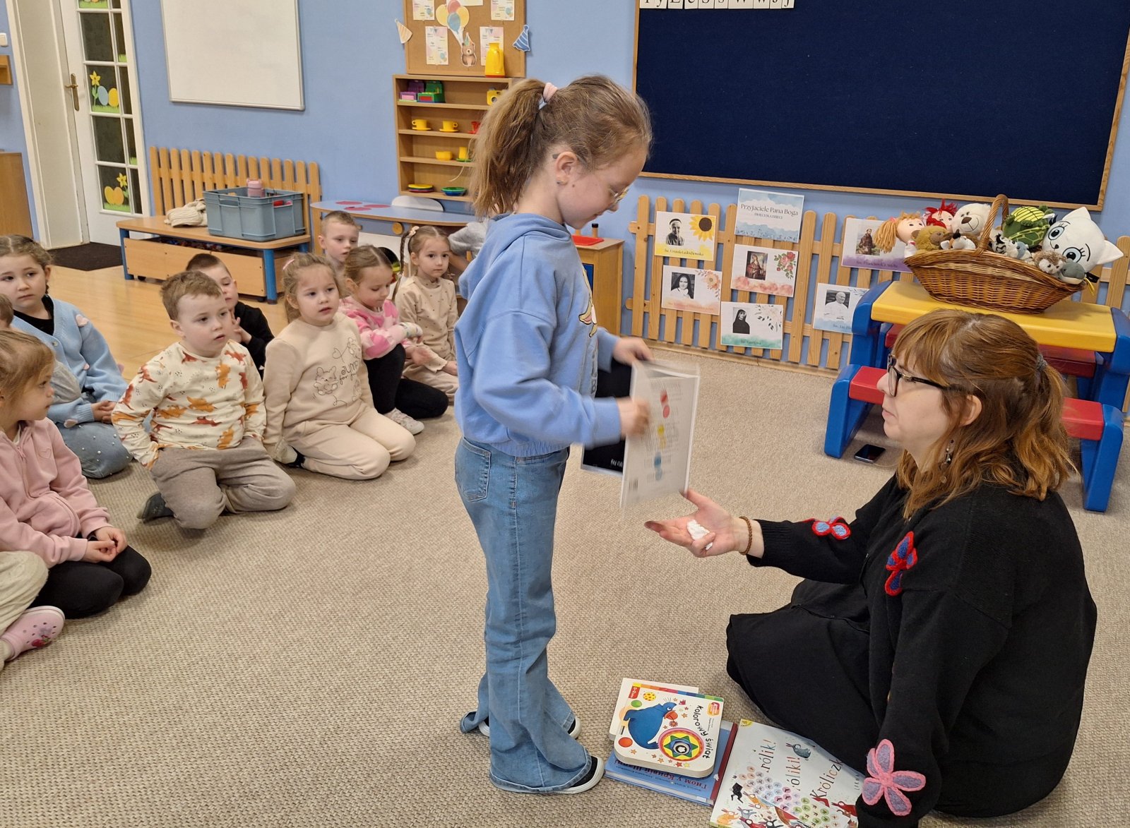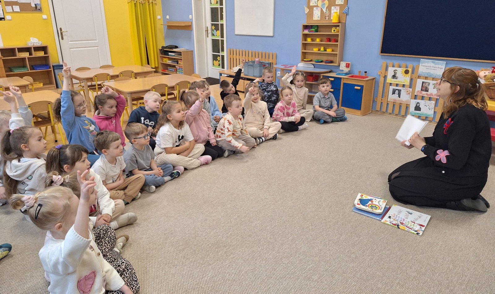 7 kwietnia 2026 r. Dziś w przedszkolu panowała wyjątkowa, pełna ciekawości atmosfera. Dzieci z grupy „Maków” i „Słoneczników” miały przyjemność gościć Panią Natalię z Biblioteki Publicznej w Pniewach, która zabrała je w niezwykłą podróż do świata książek. Podczas spotkania przedszkolaki dowiedziały się, jak powstają książki, kto je pisze i dlaczego warto je czytać. Pani Natalia w ciekawy i przystępny sposób opowiadała o pracy bibliotekarza, pokazując dzieciom różnorodne książki – od kolorowych bajek po te pełne zagadek i przygód. Nie zabrakło również wspólnego czytania, które wzbudziło wiele emocji i uśmiechów. Dzieci z ogromnym zainteresowaniem słuchały, zadawały pytania i chętnie dzieliły się swoimi doświadczeniami związanymi z czytaniem. Spotkanie było nie tylko okazją do poznania świata literatury, ale także inspiracją do sięgania po książki na co dzień. Serdecznie dziękujemy Pani Natalii za wizytę oraz za zaszczepienie w dzieciach miłości do książek!